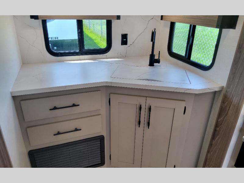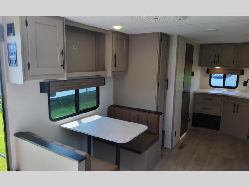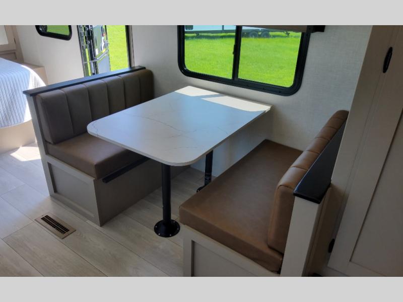 Travel on weekends, weekdays or whenever you want with this spacious trailer that has a large slide out that holds the theater seats with cupholders and USB ports, the 10 cu. ft. 12V refrigerator, and the cooking appliances. The rear corner has the kitchen sink and more counter space, giving the cook plenty of space to whip up camping meals. You can dine at the booth dinette or outside under the 18' power awning after grabbing your camping chairs from the pass-through storage. At night, get cleaned in the full bathroom with a nice amount of counter space for your toiletries, and fall quickly to sleep on your own queen bed up front with dual wardrobes for your clothing.