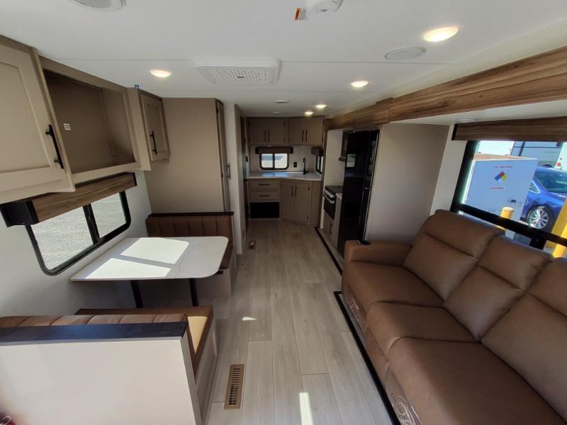 Travel on weekends, weekdays or whenever you want with this spacious trailer that has a large slide out that holds the theater seats with cupholders and USB ports, the 10 cu. ft. 12V refrigerator, and the cooking appliances. The rear corner has the kitchen sink and more counter space, giving the cook plenty of space to whip up camping meals. You can dine at the booth dinette or outside under the 18' power awning after grabbing your camping chairs from the pass-through storage. At night, get cleaned in the full bathroom with a nice amount of counter space for your toiletries, and fall quickly to sleep on your own queen bed up front with dual wardrobes for your clothing.