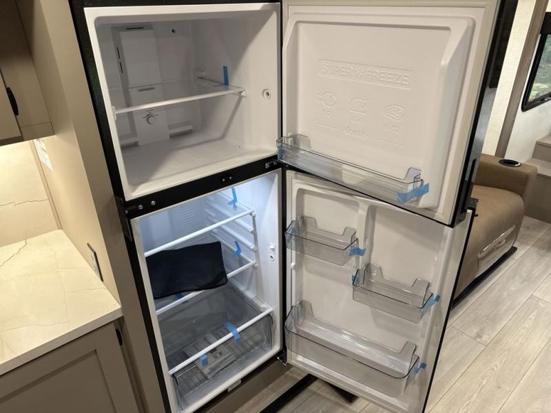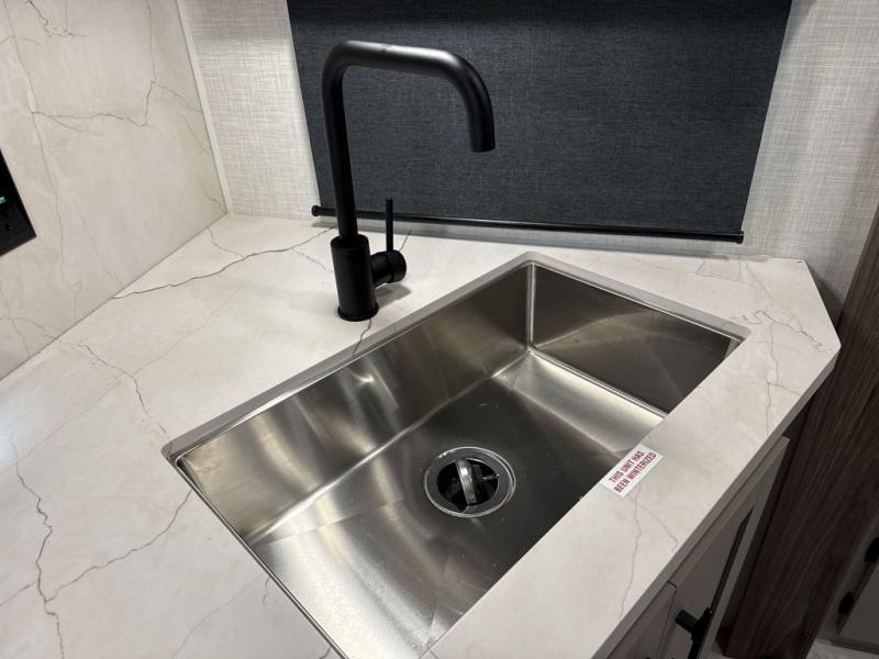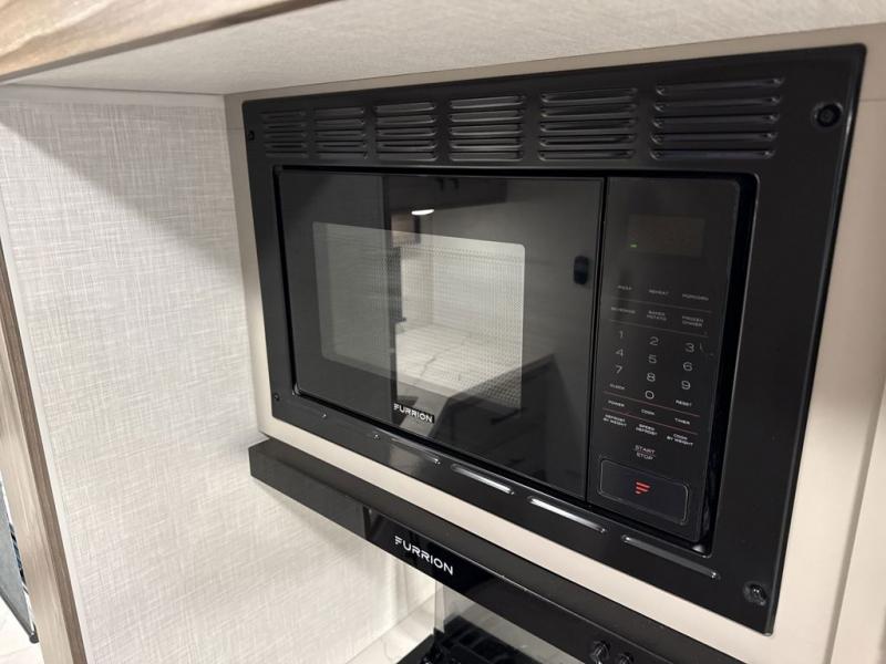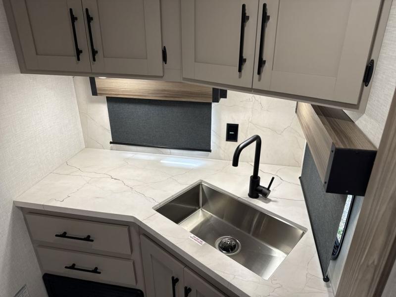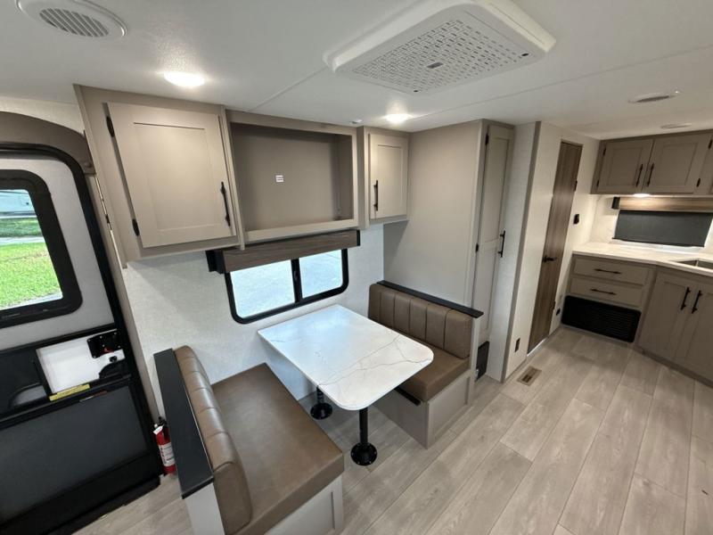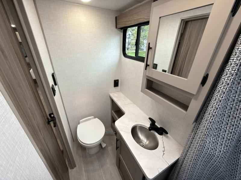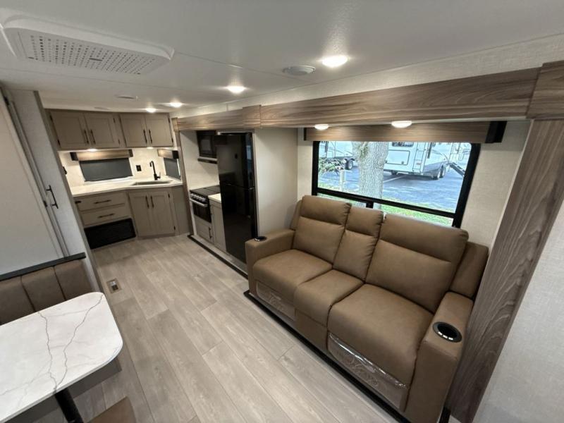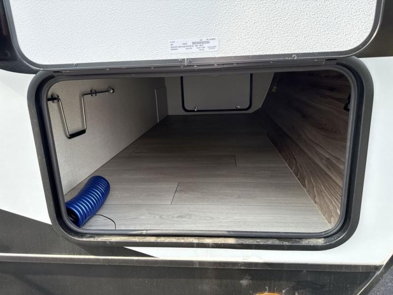 Travel on weekends, weekdays or whenever you want with this spacious trailer that has a large slide out that holds the theater seats with cupholders and USB ports, the 10 cu. ft. 12V refrigerator, and the cooking appliances. The rear corner has the kitchen sink and more counter space, giving the cook plenty of space to whip up camping meals. You can dine at the booth dinette or outside under the 18' power awning after grabbing your camping chairs from the pass-through storage. At night, get cleaned in the full bathroom with a nice amount of counter space for your toiletries, and fall quickly to sleep on your own queen bed up front with dual wardrobes for your clothing.