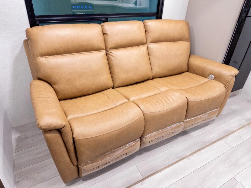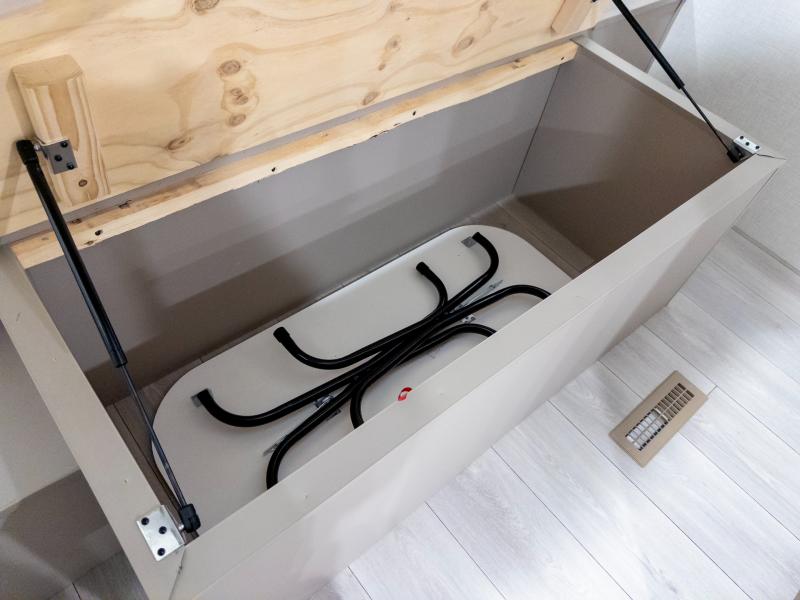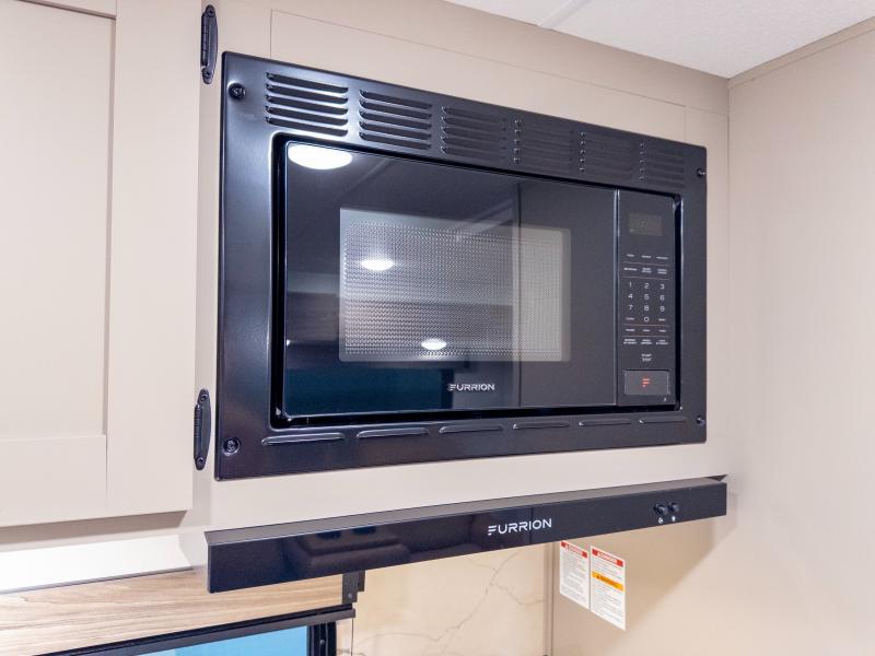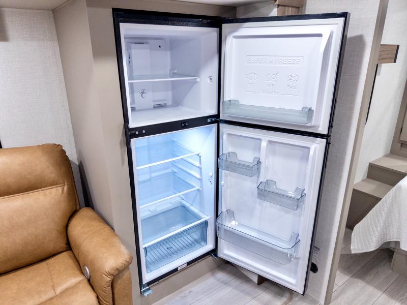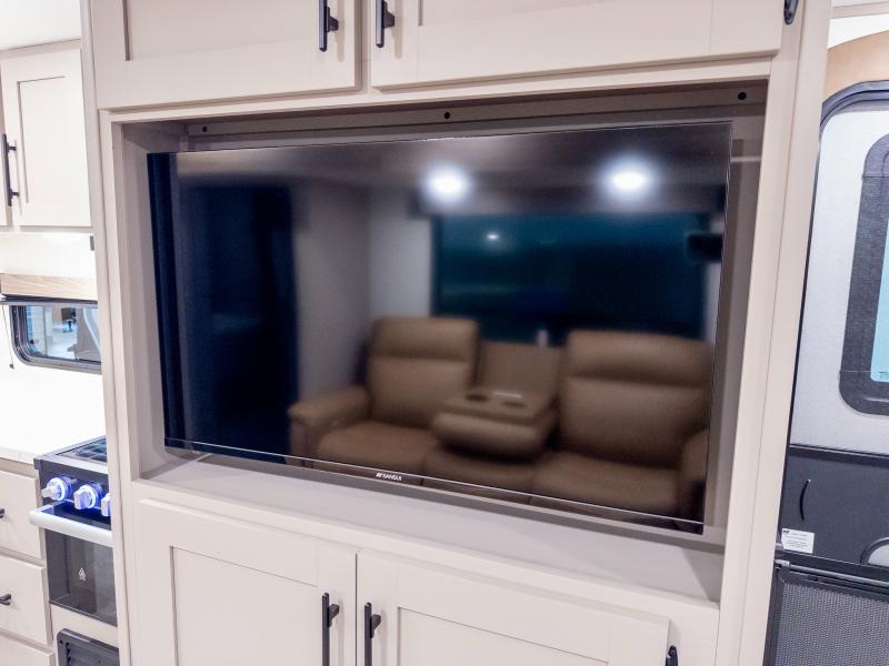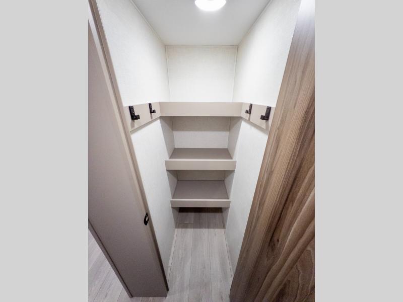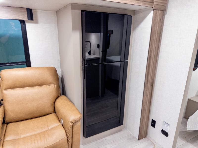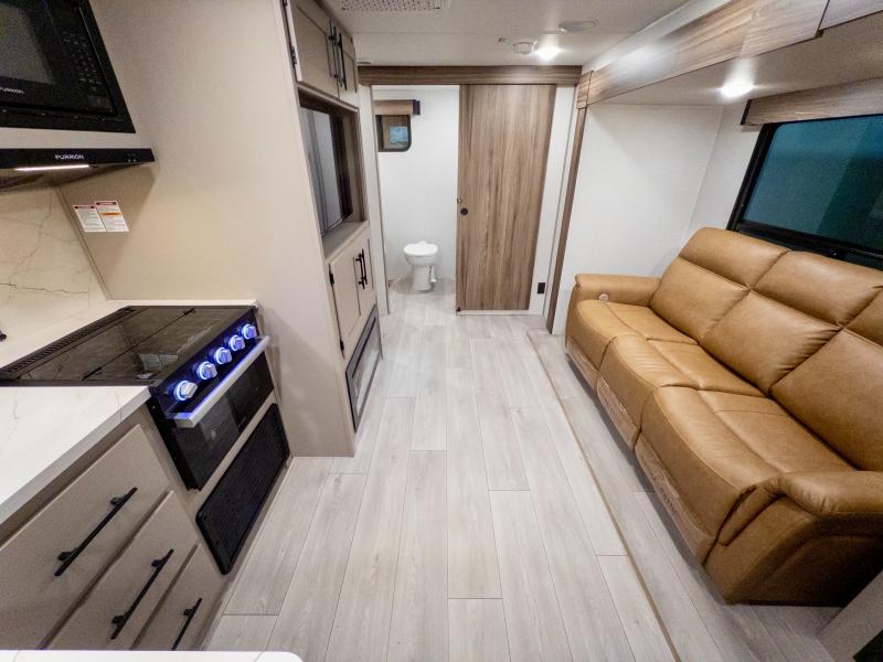Inside comforts are found throughout this trailer from the theater dinette with a table and a 10 cu. ft. refrigerator within the slide out, to the rear full bathroom with a space saving door. Outside, you will find comfort under the 16' power awning while relaxing as you decide what to do next. The pass-through storage gives you a place for your larger items like camping chairs, portable stove, charcoal and outdoor games. The cook will love the L-shaped countertop and kitchen appliances, plus the walk-in pantry includes coat hooks. At night, head to the front to enjoy your own queen bed with clothing storage on each side, plus there is a TV mount if you want to add your own TV.