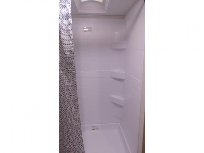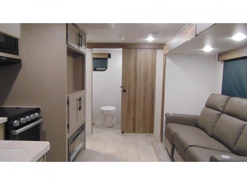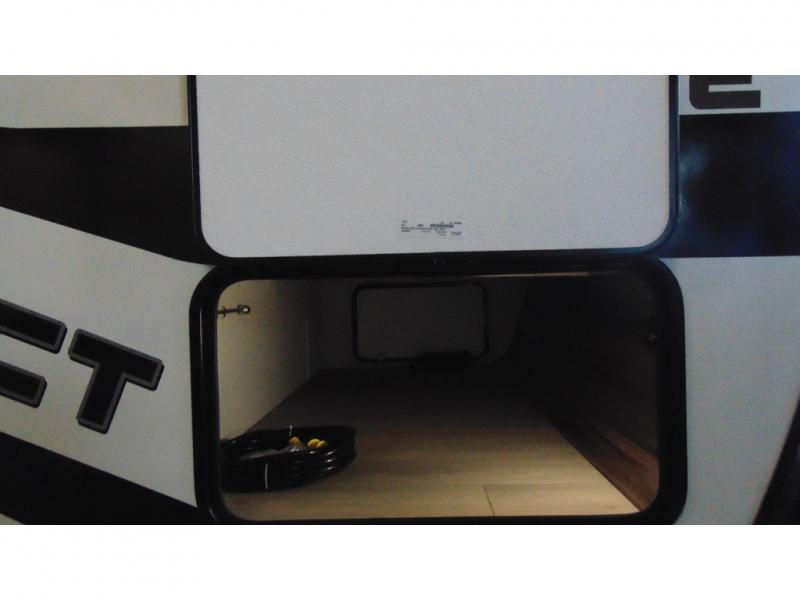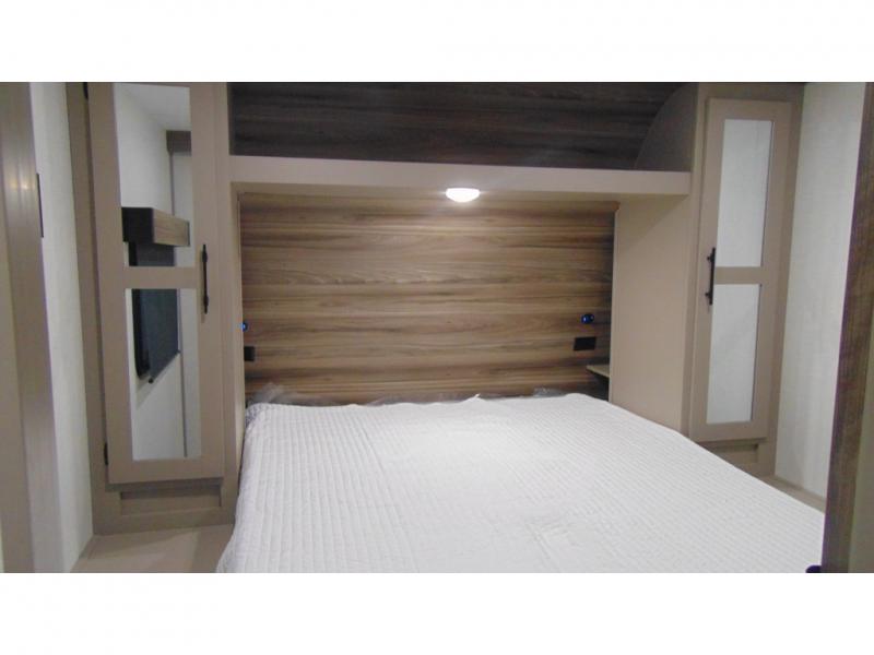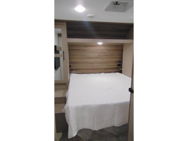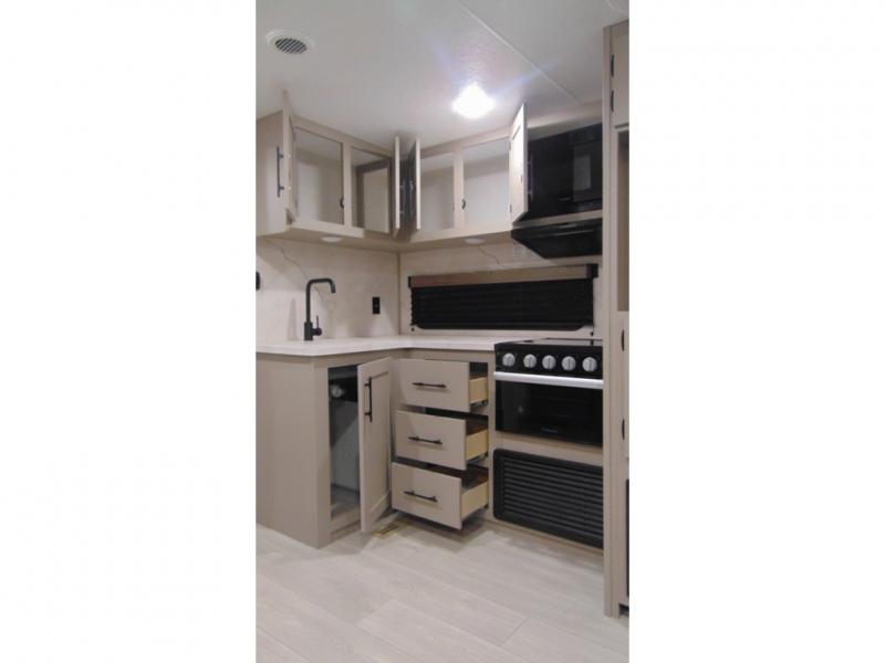 Inside comforts are found throughout this trailer from the theater dinette with a table and a 10 cu. ft. refrigerator within the slide out, to the rear full bathroom with a space saving door. Outside, you will find comfort under the 16' power awning while relaxing as you decide what to do next. The pass-through storage gives you a place for your larger items like camping chairs, portable stove, charcoal and outdoor games. The cook will love the L-shaped countertop and kitchen appliances, plus the walk-in pantry includes coat hooks. At night, head to the front to enjoy your own queen bed with clothing storage on each side, plus there is a TV mount if you want to add your own TV.