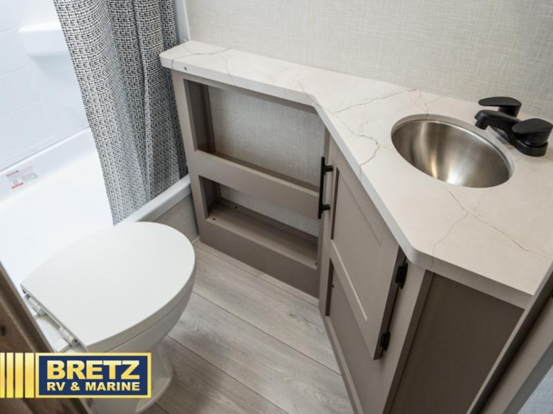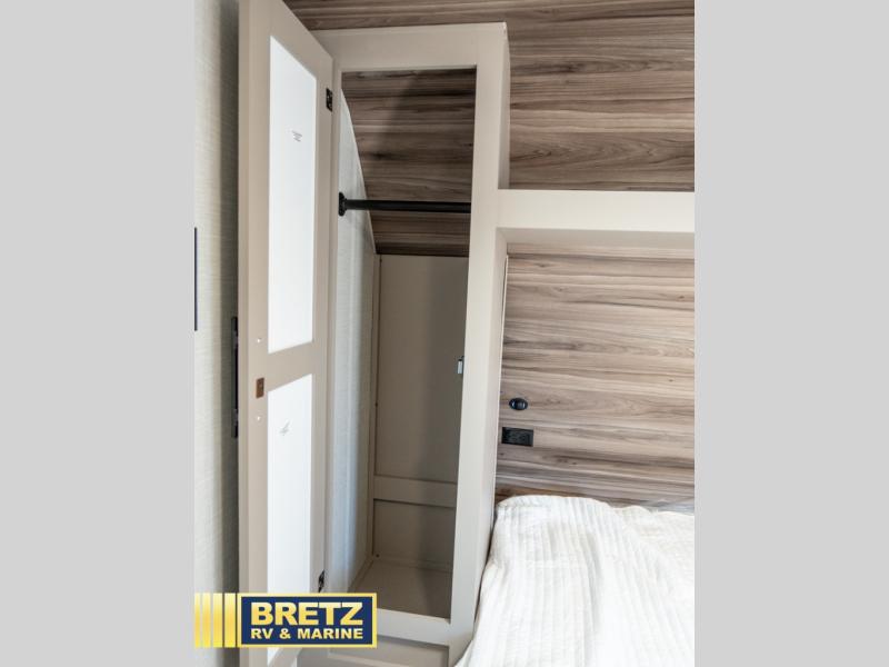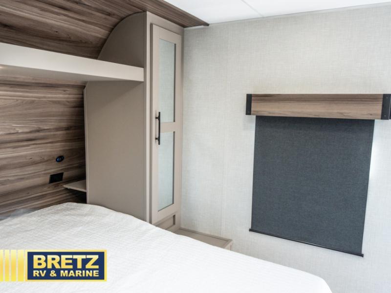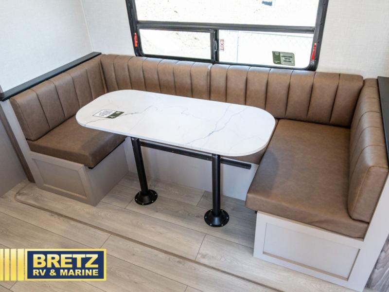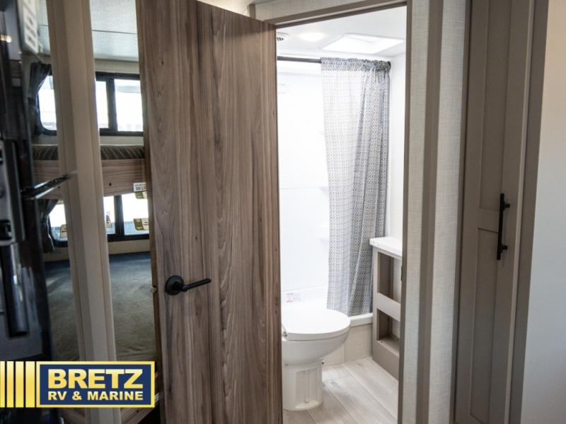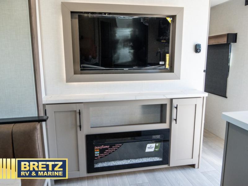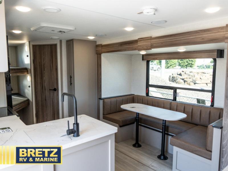 Get ready for outdoor fun at your favorite campground or RV park, and relaxation both outside and inside this trailer! The 18' power awning provides protection from the elements and the LED light strip allows you to stay up late, the outside kitchen and griddle provide amenities to make meals in the great outdoors, plus the trunk door and the pass-through storage give you access to stow items away. When you are ready to call it a night, there is a queen bed in the front private bedroom, double-size bunks next to the full bathroom, and a U-shaped dinette slide offers extra sleeping space. The next morning, the cook can make meals using the L-shaped kitchen with full amenities, or head back outdoors to use the outside amenities.