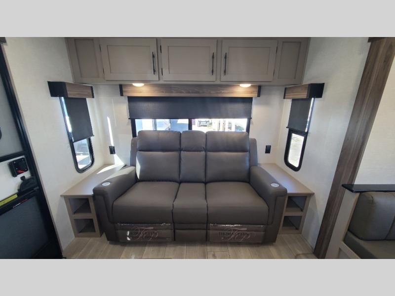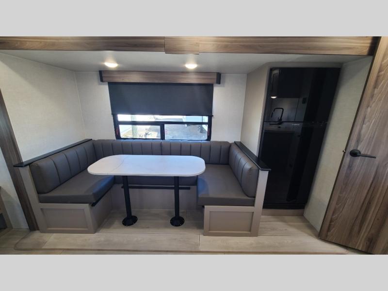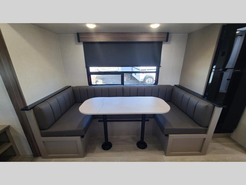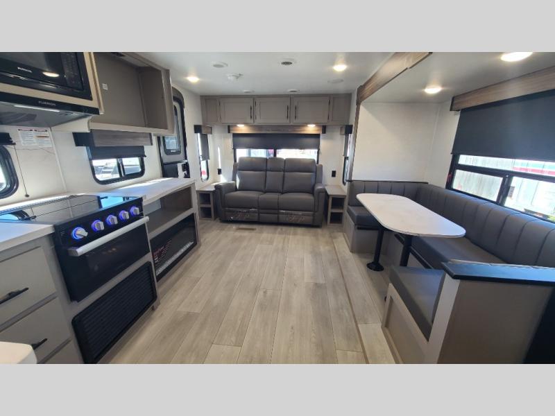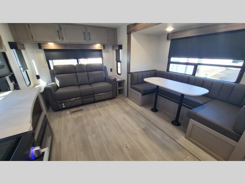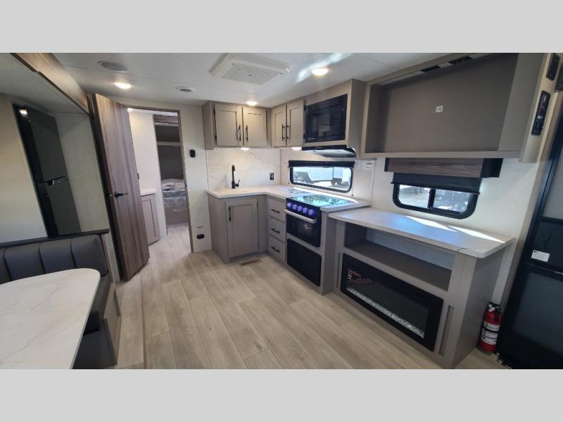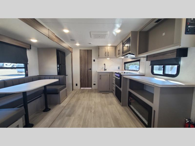 There is plenty of space throughout this travel trailer! The U-shaped dinette and refrigerator slide help to open up the living area. Across from it is an entertainment center with a 39" TV and an optional 30" fireplace that can be added below it, plus there is a rear 70" sofa with end tables on either side to set your bowl of popcorn. The walk-through bathroom is easy to access and has a 30" x 36" shower to freshen up in each morning. As you exit the bathroom, you will enter into the front private bedroom which has a 60" x 75" queen bed with wardrobes on either side and a TV to watch your favorite movies in true comfort!