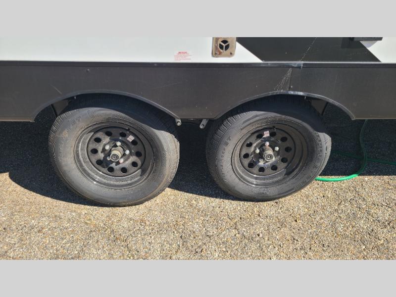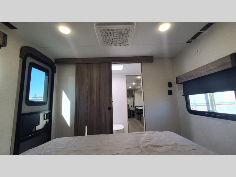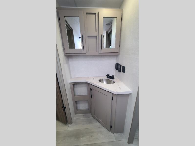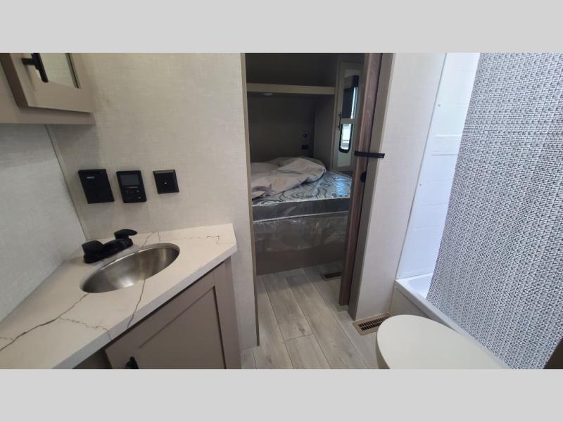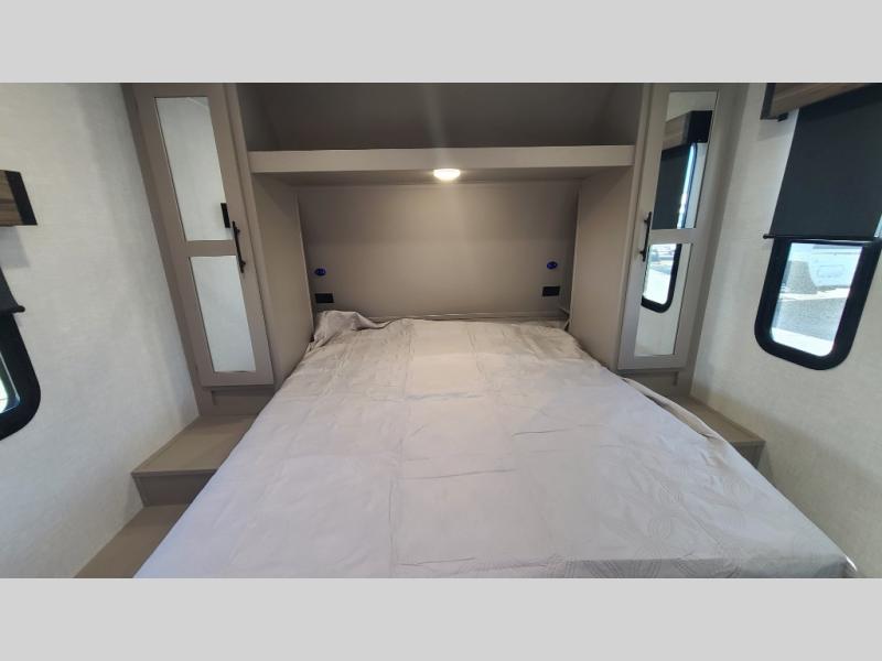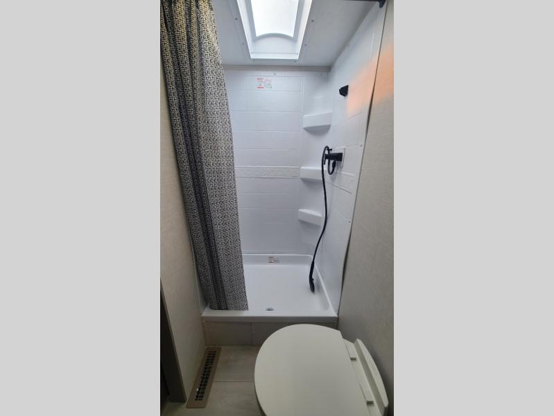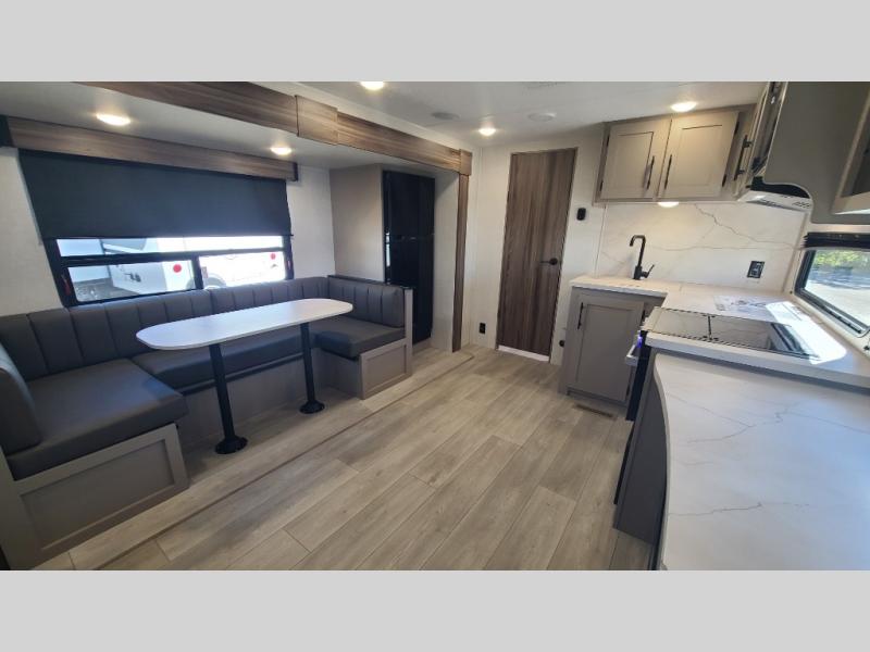 There is plenty of space throughout this travel trailer! The U-shaped dinette and refrigerator slide help to open up the living area. Across from it is an entertainment center with a 39" TV and an optional 30" fireplace that can be added below it, plus there is a rear 70" sofa with end tables on either side to set your bowl of popcorn. The walk-through bathroom is easy to access and has a 30" x 36" shower to freshen up in each morning. As you exit the bathroom, you will enter into the front private bedroom which has a 60" x 75" queen bed with wardrobes on either side and a TV to watch your favorite movies in true comfort!