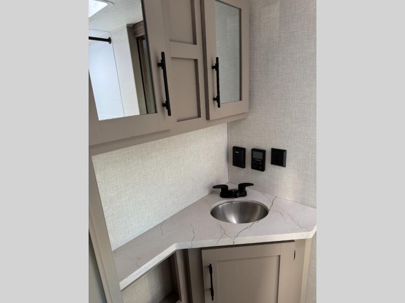 There is plenty of space throughout this travel trailer! The U-shaped dinette and refrigerator slide help to open up the living area. Across from it is an entertainment center with a 39" TV and an optional 30" fireplace that can be added below it, plus there is a rear 70" sofa with end tables on either side to set your bowl of popcorn. The walk-through bathroom is easy to access and has a 30" x 36" shower to freshen up in each morning. As you exit the bathroom, you will enter into the front private bedroom which has a 60" x 75" queen bed with wardrobes on either side and a TV to watch your favorite movies in true comfort!