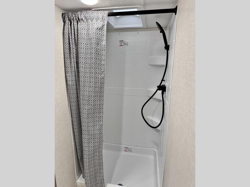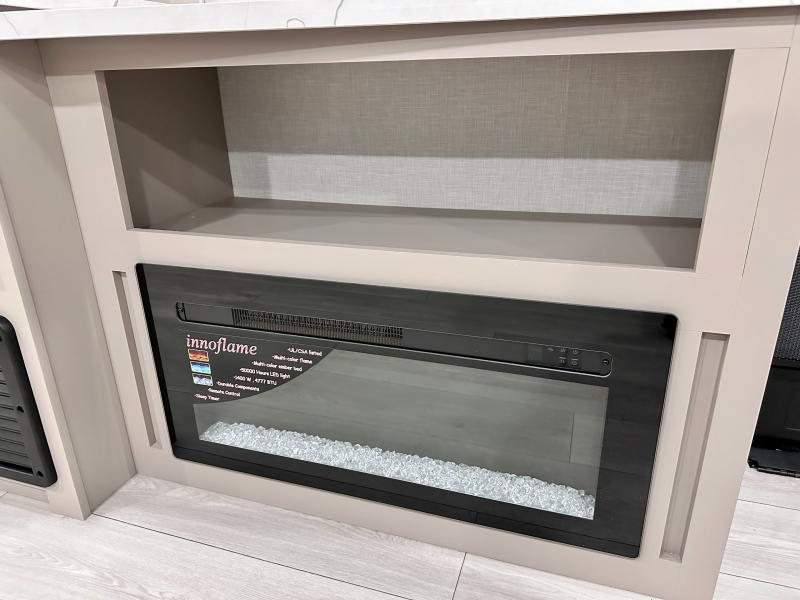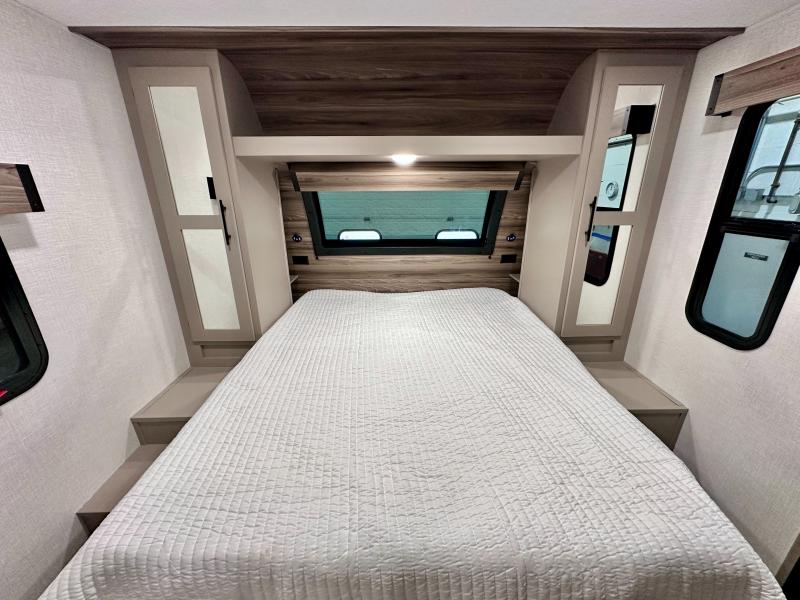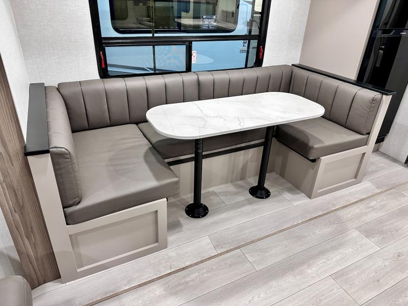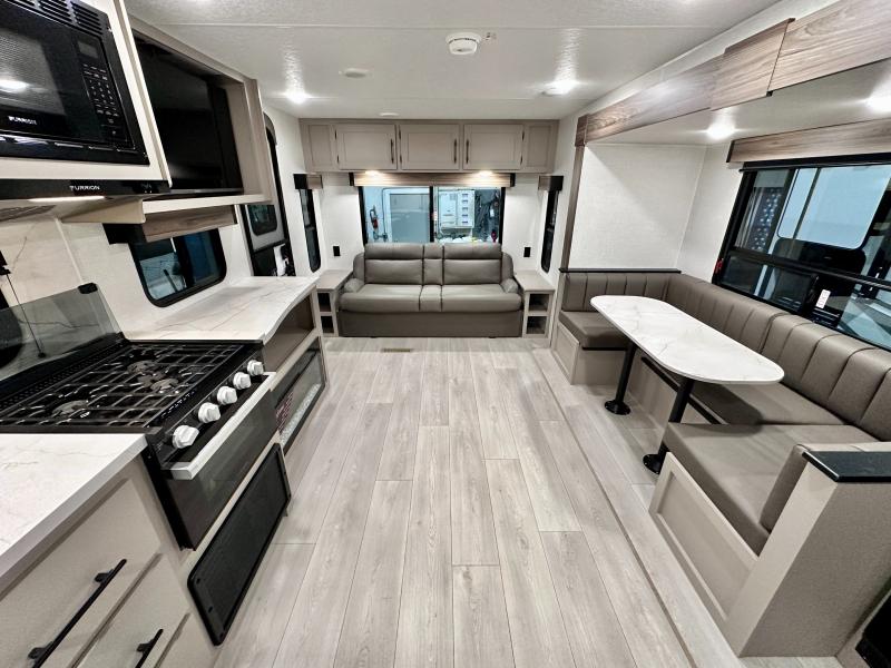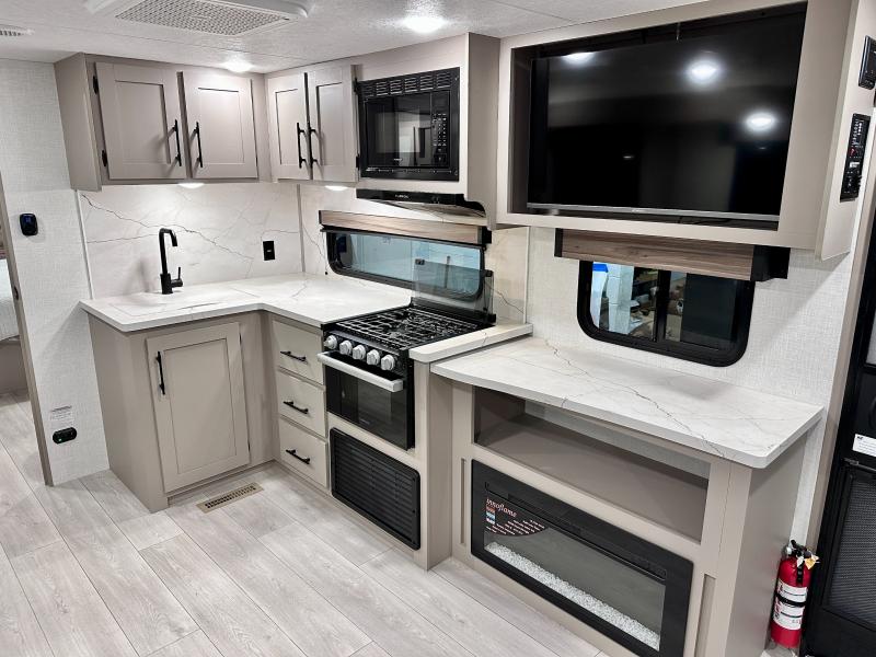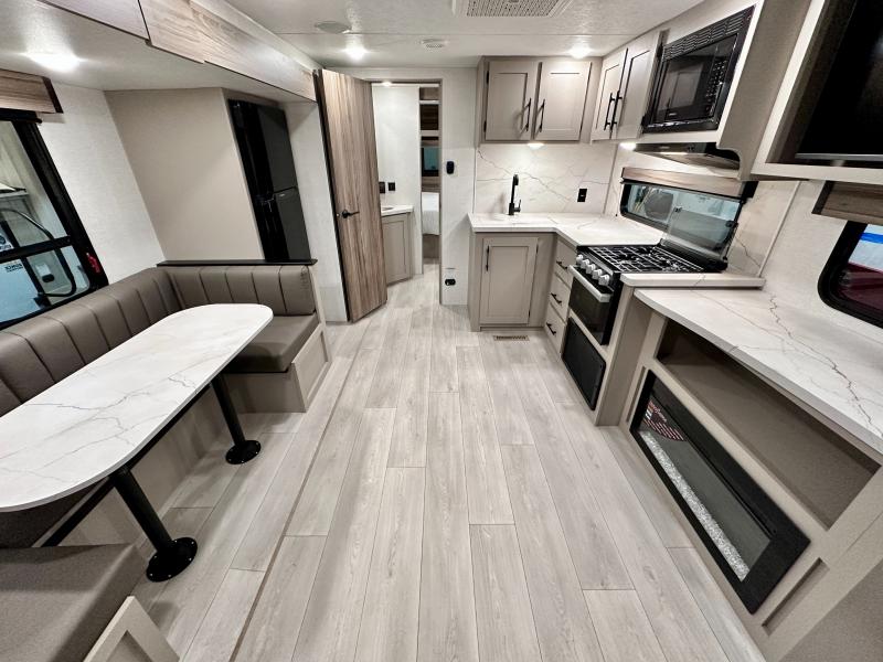 There is plenty of space throughout this travel trailer! The U-shaped dinette and refrigerator slide help to open up the living area. Across from it is an entertainment center with a 39" TV and an optional 30" fireplace that can be added below it, plus there is a rear 70" sofa with end tables on either side to set your bowl of popcorn. The walk-through bathroom is easy to access and has a 30" x 36" shower to freshen up in each morning. As you exit the bathroom, you will enter into the front private bedroom which has a 60" x 75" queen bed with wardrobes on either side and a TV to watch your favorite movies in true comfort!