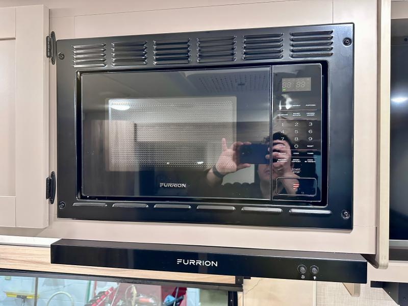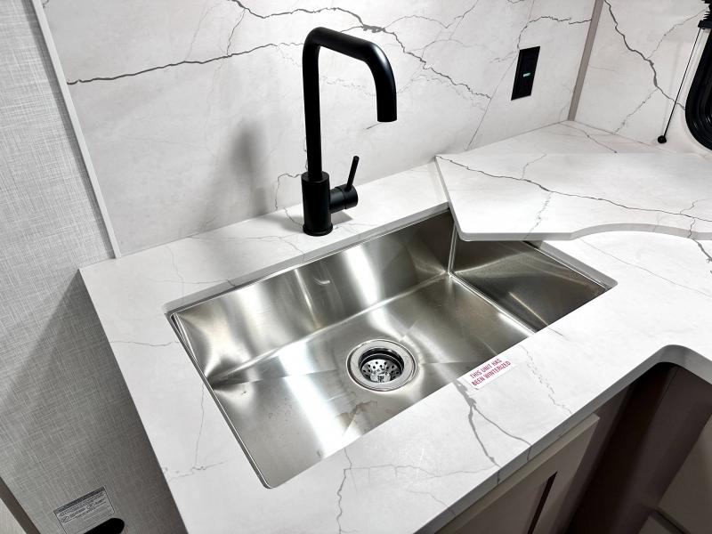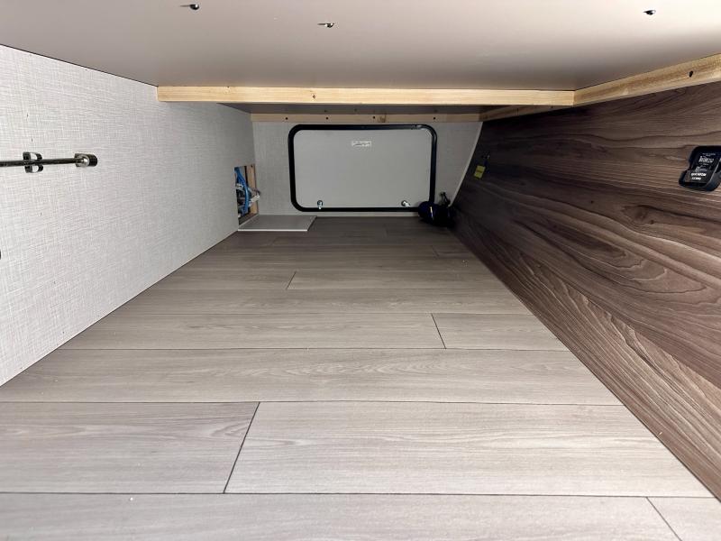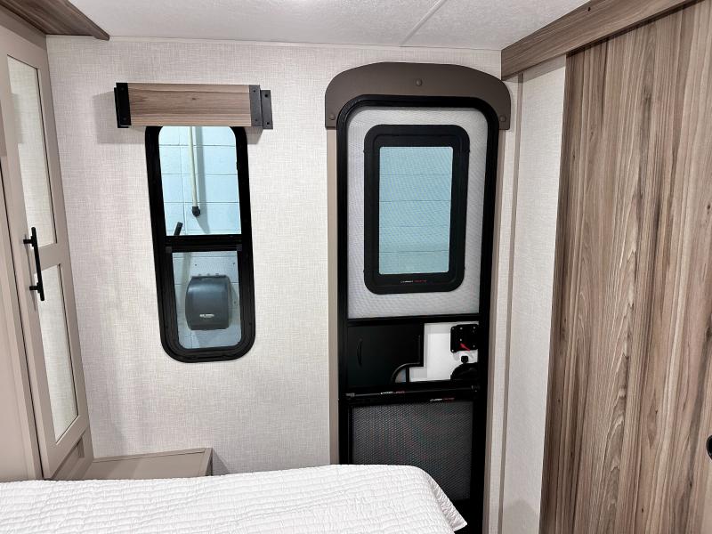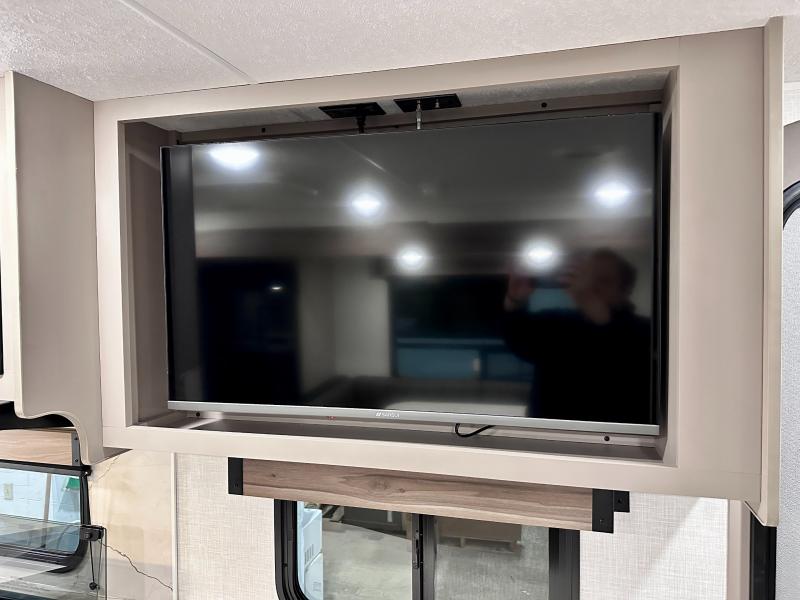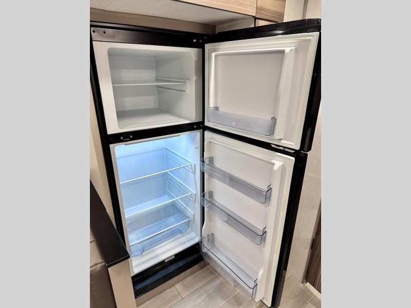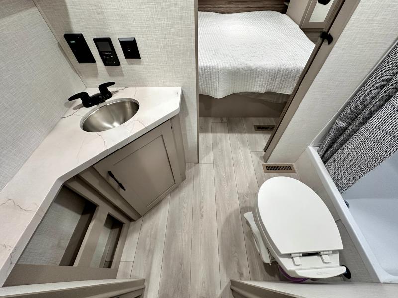 There is plenty of space throughout this travel trailer! The U-shaped dinette and refrigerator slide help to open up the living area. Across from it is an entertainment center with a 39" TV and an optional 30" fireplace that can be added below it, plus there is a rear 70" sofa with end tables on either side to set your bowl of popcorn. The walk-through bathroom is easy to access and has a 30" x 36" shower to freshen up in each morning. As you exit the bathroom, you will enter into the front private bedroom which has a 60" x 75" queen bed with wardrobes on either side and a TV to watch your favorite movies in true comfort!