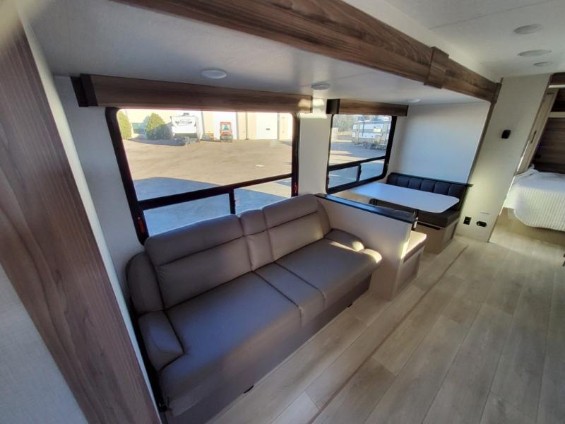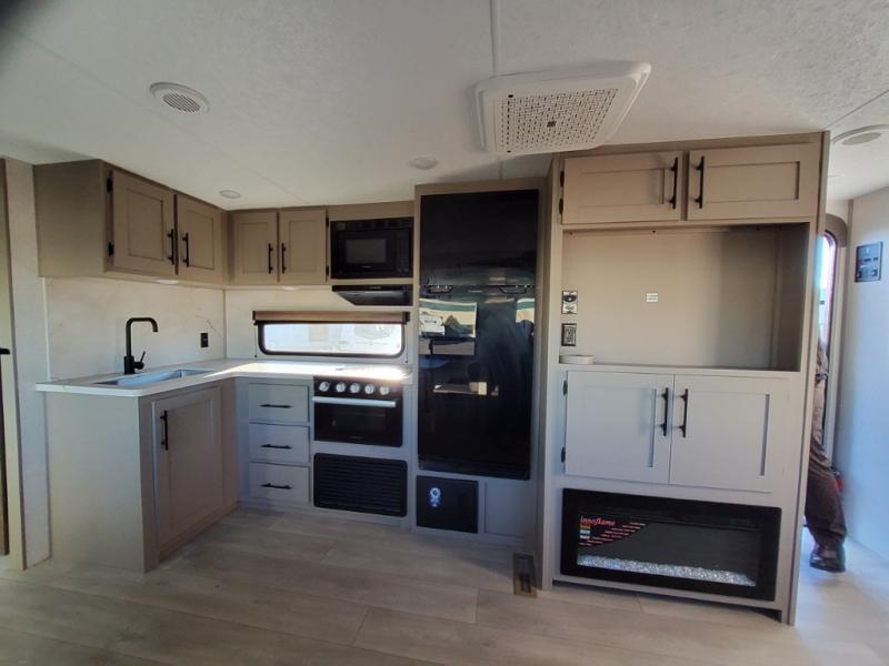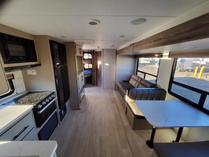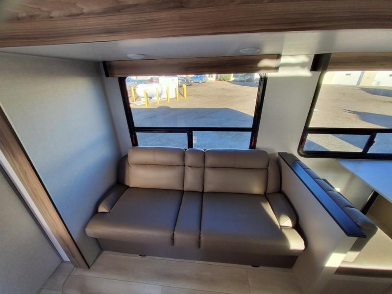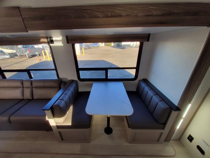 Headed to the RV park with your family and friends? Want enough space to allow overnight guests to stay the night on occasion? This trailer gives you double-size bunks, a 70" sofa and a booth dinette that offer extra sleeping space while you enjoy your own walk-around queen bed in the front private bedroom. You will also have dual wardrobes, and a TV mount to add your own TV. Everyone will stay refreshed and cleaned using the rear corner full bathroom, and fed by the cook that has an inside kitchen with full amenities including an L-shaped counter and a large sink. There is also a walk-in pantry with coat hooks next to the entry to utilize as a multi-purpose closet. And there is an outside kitchen with a griddle and a refrigerator, a 20' power awning with an LED light strip, and a pass-through storage for the larger camping items.