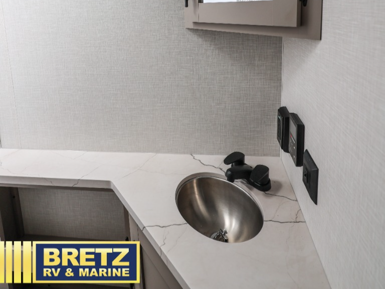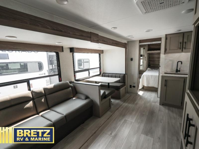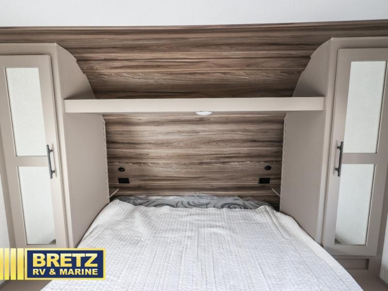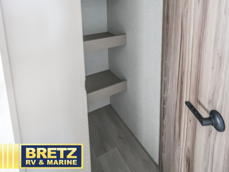 Headed to the RV park with your family and friends? Want enough space to allow overnight guests to stay the night on occasion? This trailer gives you double-size bunks, a 70" sofa and a booth dinette that offer extra sleeping space while you enjoy your own walk-around queen bed in the front private bedroom. You will also have dual wardrobes, and a TV mount to add your own TV. Everyone will stay refreshed and cleaned using the rear corner full bathroom, and fed by the cook that has an inside kitchen with full amenities including an L-shaped counter and a large sink. There is also a walk-in pantry with coat hooks next to the entry to utilize as a multi-purpose closet. And there is an outside kitchen with a griddle and a refrigerator, a 20' power awning with an LED light strip, and a pass-through storage for the larger camping items.