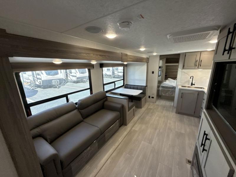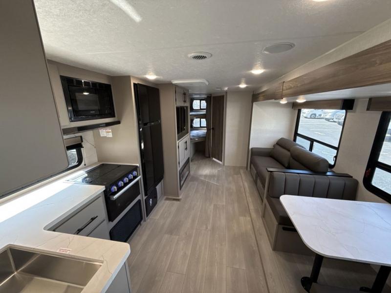Headed to the RV park with your family and friends? Want enough space to allow overnight guests to stay the night on occasion? This trailer gives you double-size bunks, a 70" sofa and a booth dinette that offer extra sleeping space while you enjoy your own walk-around queen bed in the front private bedroom. You will also have dual wardrobes, and a TV mount to add your own TV. Everyone will stay refreshed and cleaned using the rear corner full bathroom, and fed by the cook that has an inside kitchen with full amenities including an L-shaped counter and a large sink. There is also a walk-in pantry with coat hooks next to the entry to utilize as a multi-purpose closet. And there is an outside kitchen with a griddle and a refrigerator, a 20' power awning with an LED light strip, and a pass-through storage for the larger camping items.