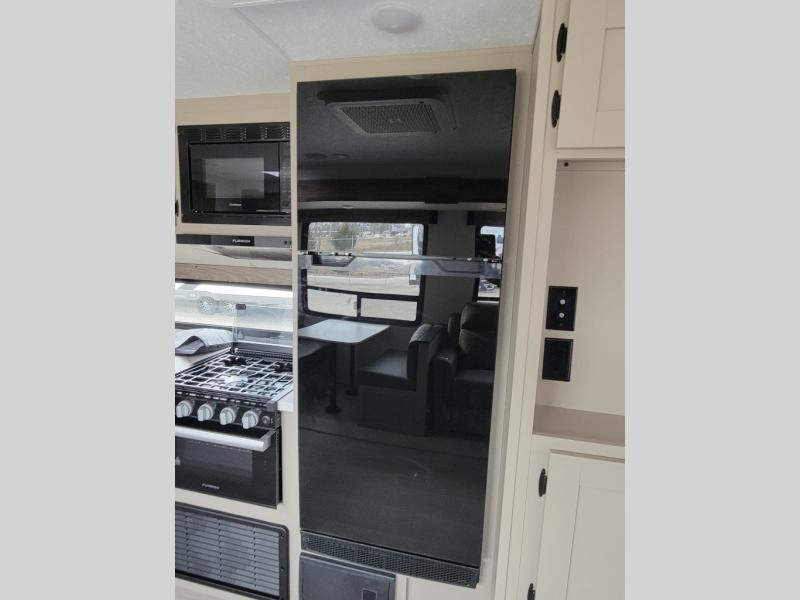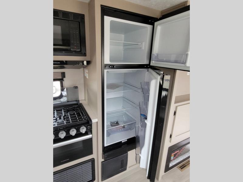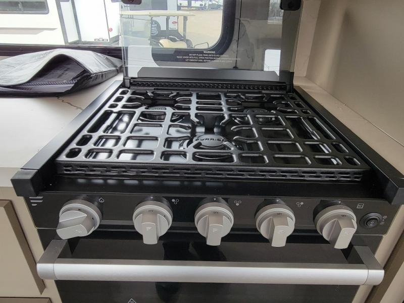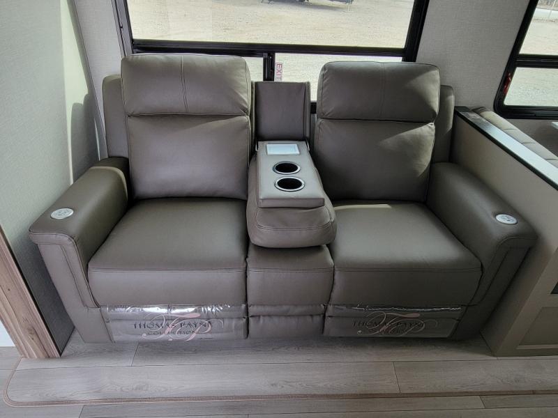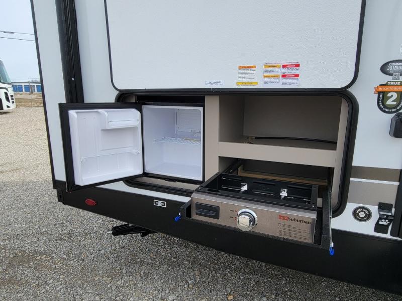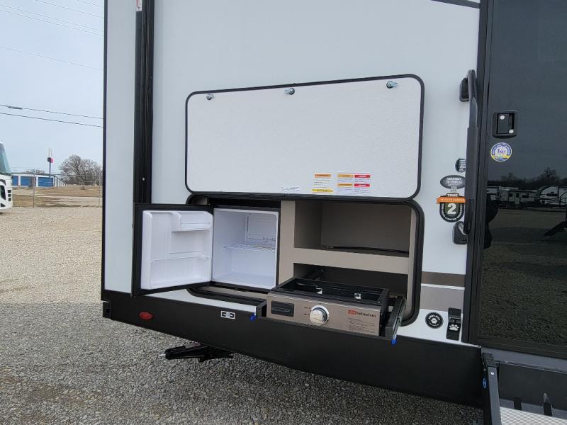 Your family will love this travel trailer. Sleep comfortably with your partner in the amazing queen bed situated in the front room, which has dual wardrobes perfect for storing your clothing. This unit is fitted with a full walk-through bathroom and a half bathroom in the rear part of the trailer, both ideal for refreshing yourself on a hot day. You can relax a little in the 70" sofa equipped with a 34" fireplace in front of it allowing you to enjoy a cozy atmosphere. You can also cook delicious meals in the incredible kitchen, fitted with a microwave, three cooktop burners, a walk-in pantry with coat hooks, a sink, a dinette, and a refrigerator, ideal for cooking any delicious dish. Finally, you will find an outdoor refrigerator and griddle excellent for cooking under the stars with your family, and a pass-through storage perfect for placing your stuff.