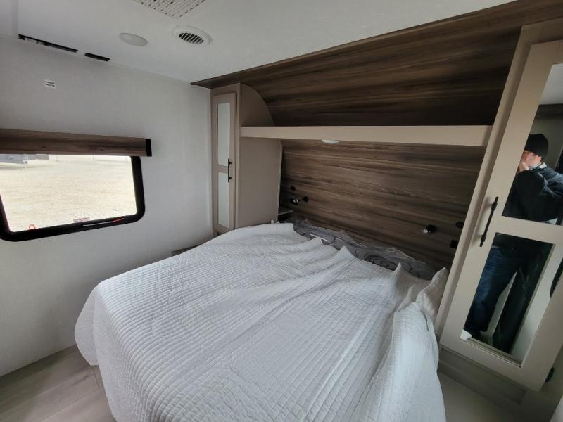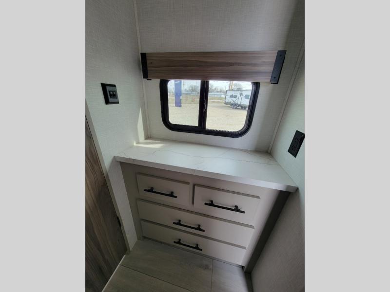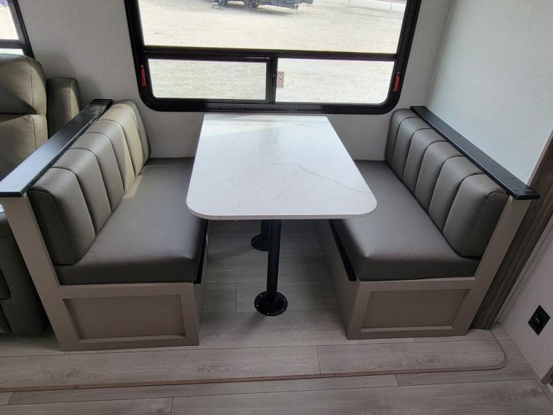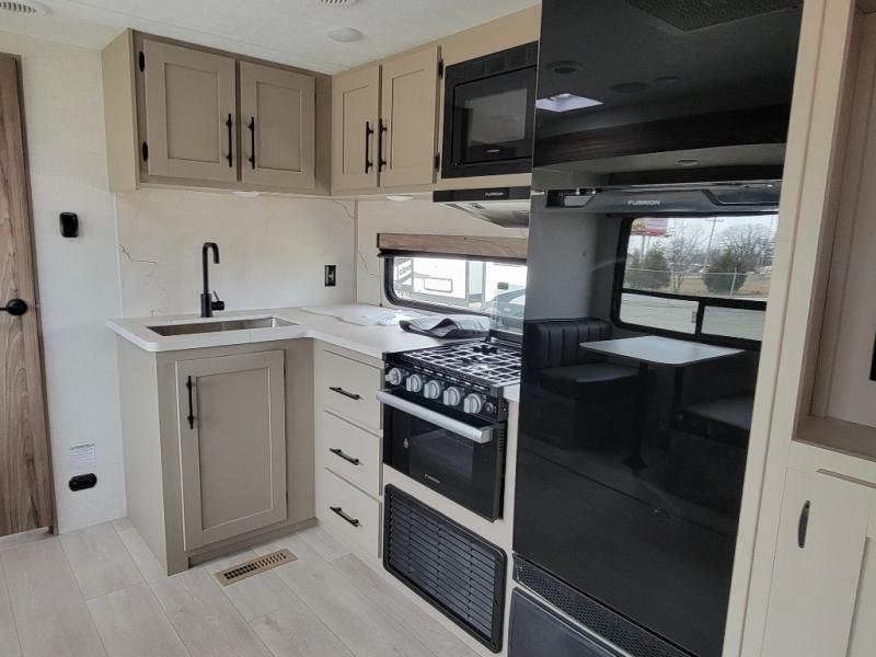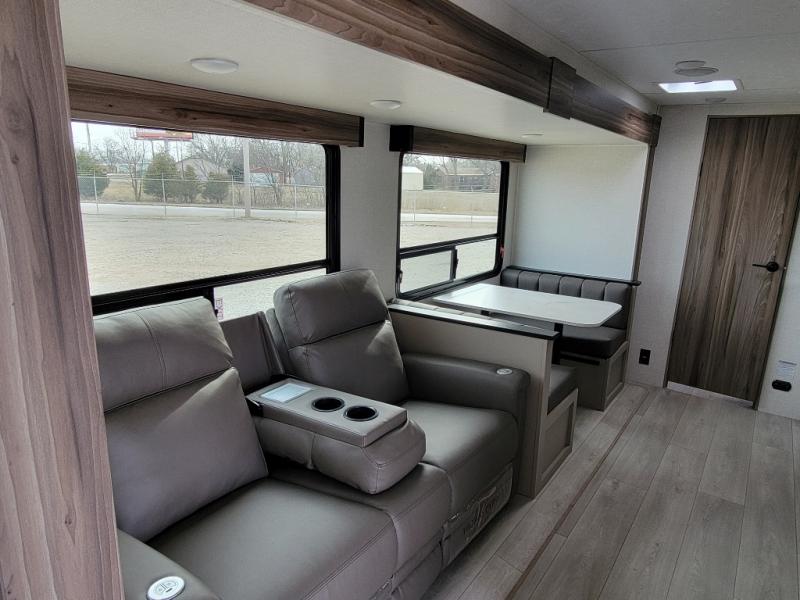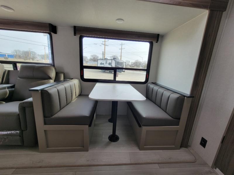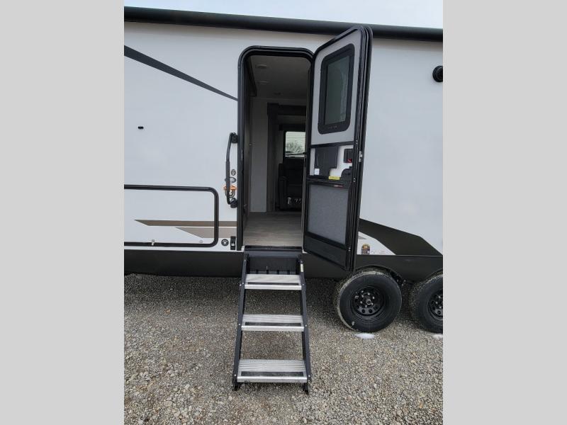Your family will love this travel trailer. Sleep comfortably with your partner in the amazing queen bed situated in the front room, which has dual wardrobes perfect for storing your clothing. This unit is fitted with a full walk-through bathroom and a half bathroom in the rear part of the trailer, both ideal for refreshing yourself on a hot day. You can relax a little in the 70" sofa equipped with a 34" fireplace in front of it allowing you to enjoy a cozy atmosphere. You can also cook delicious meals in the incredible kitchen, fitted with a microwave, three cooktop burners, a walk-in pantry with coat hooks, a sink, a dinette, and a refrigerator, ideal for cooking any delicious dish. Finally, you will find an outdoor refrigerator and griddle excellent for cooking under the stars with your family, and a pass-through storage perfect for placing your stuff.