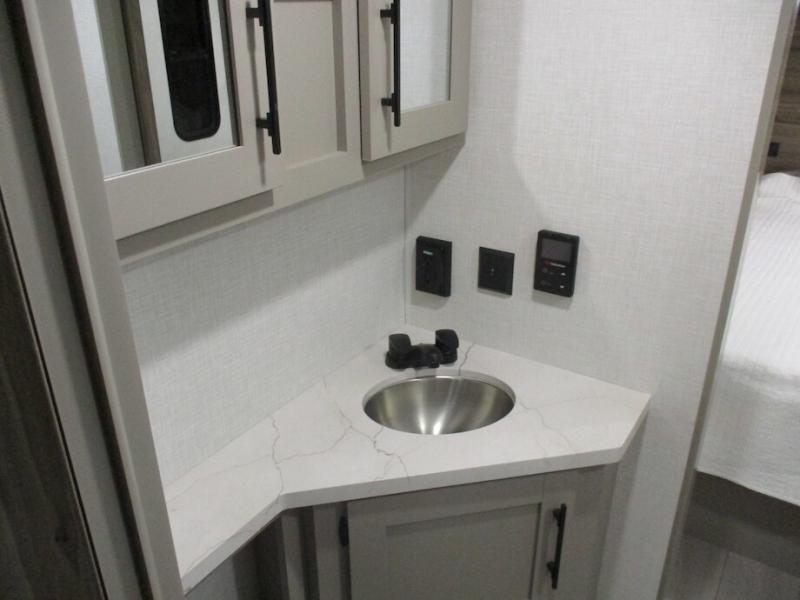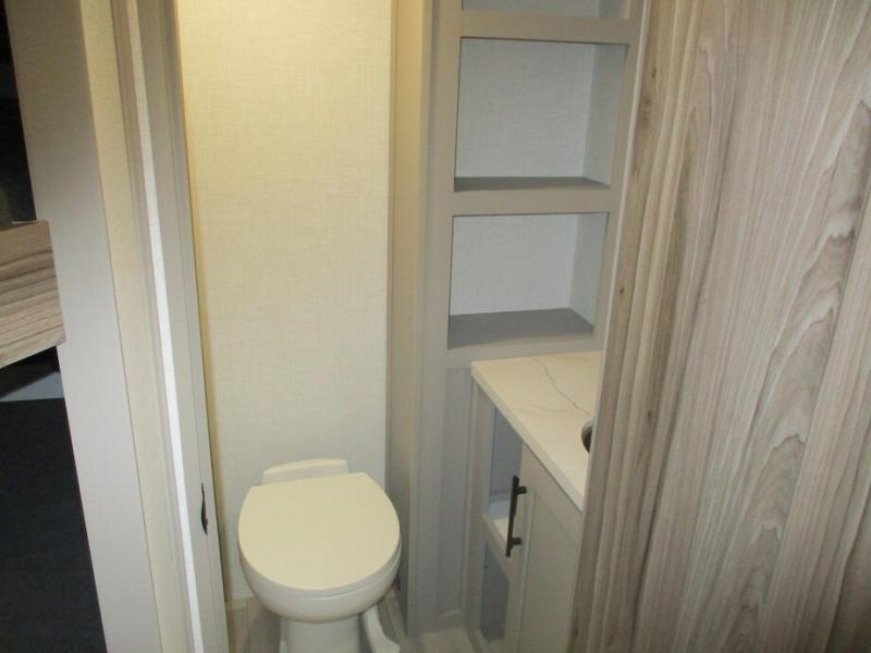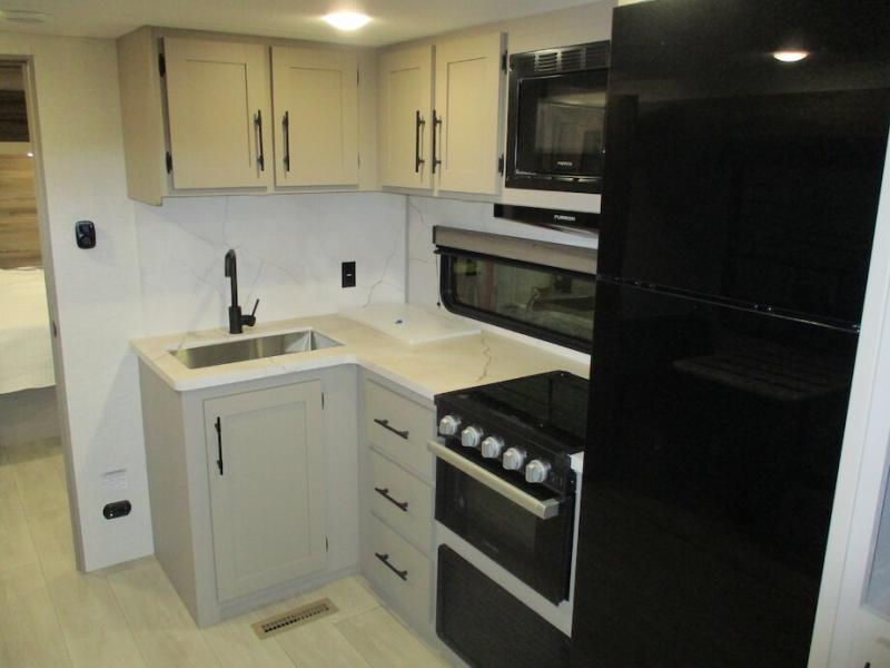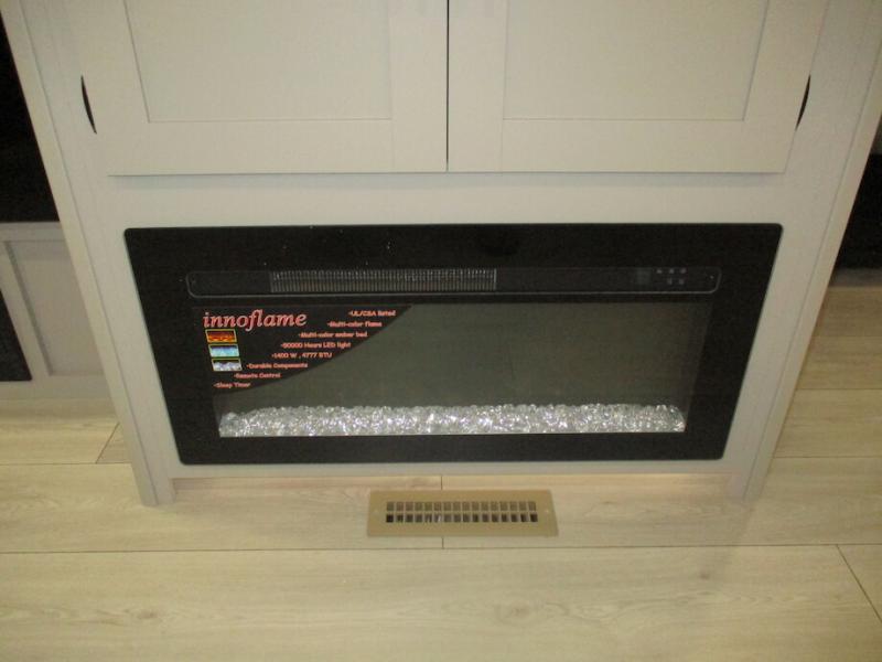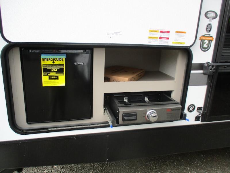 Your family will love this travel trailer. Sleep comfortably with your partner in the amazing queen bed situated in the front room, which has dual wardrobes perfect for storing your clothing. This unit is fitted with a full walk-through bathroom and a half bathroom in the rear part of the trailer, both ideal for refreshing yourself on a hot day. You can relax a little in the 70" sofa equipped with a 34" fireplace in front of it allowing you to enjoy a cozy atmosphere. You can also cook delicious meals in the incredible kitchen, fitted with a microwave, three cooktop burners, a walk-in pantry with coat hooks, a sink, a dinette, and a refrigerator, ideal for cooking any delicious dish. Finally, you will find an outdoor refrigerator and griddle excellent for cooking under the stars with your family, and a pass-through storage perfect for placing your stuff.