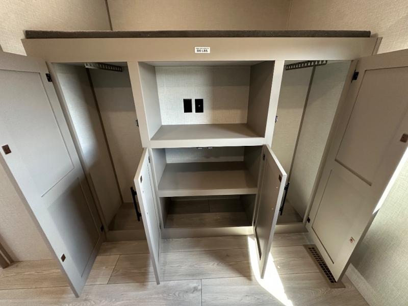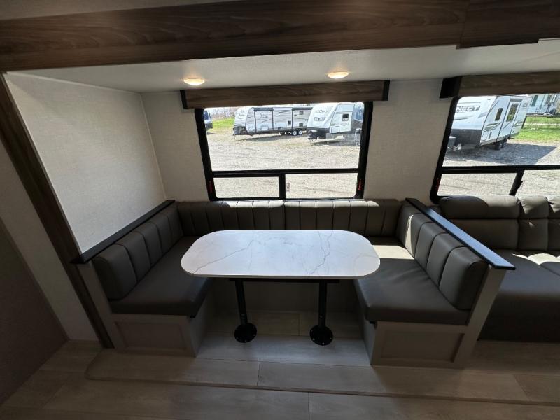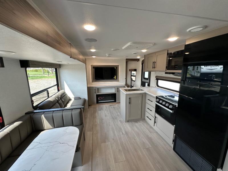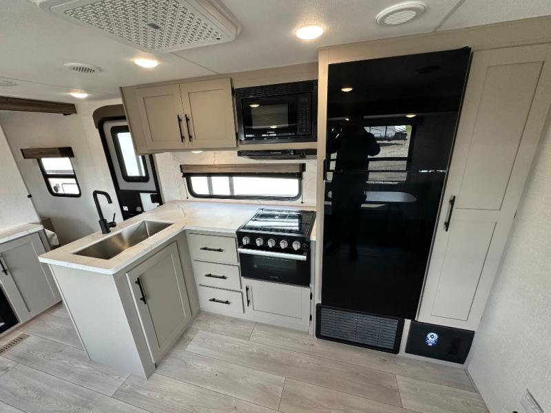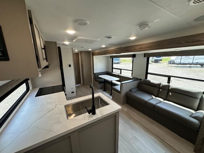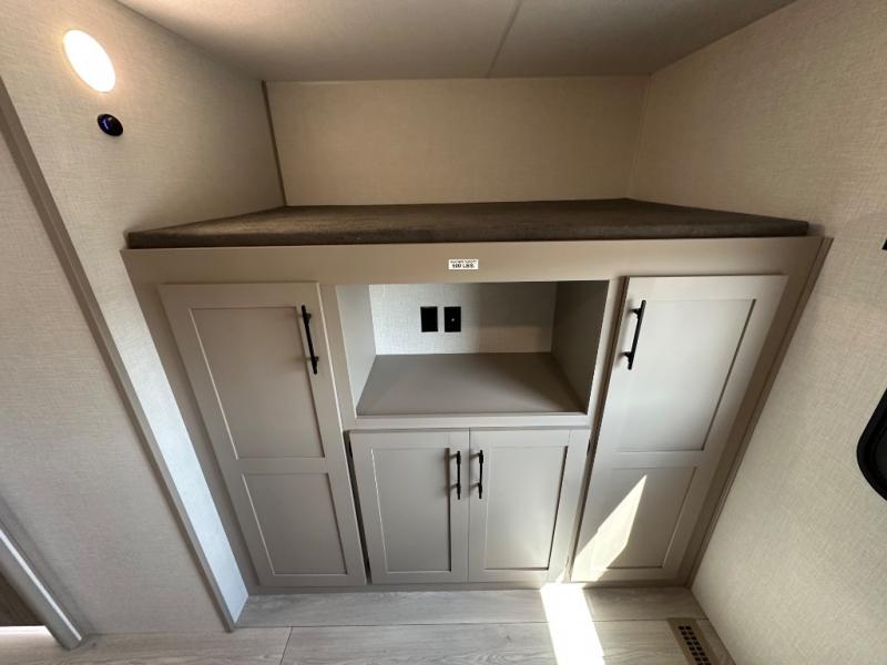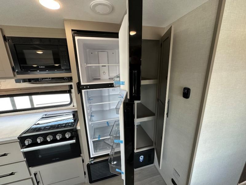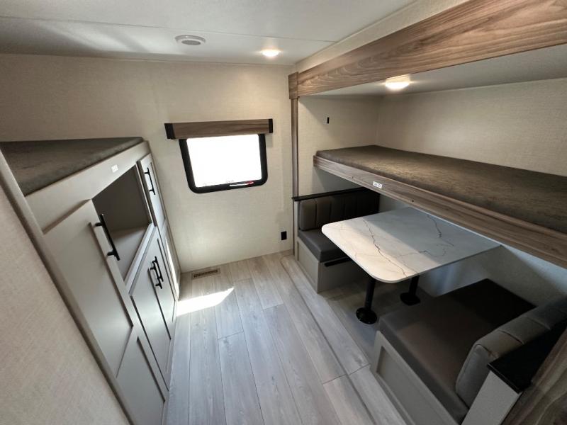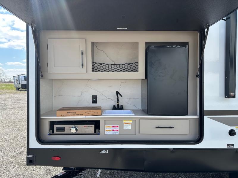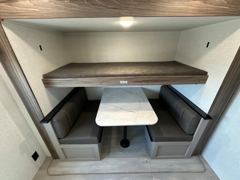 Your kids or your friends will love having their own privacy in the rear bunkhouse which offers two bunks and a dinette to play games or dine at, plus there is a closet for their storage. The full bathroom is conveniently located and includes the second exterior entry for quick and easy access to the fun happening outside. You will have your own private bedroom on the opposite side of the trailer, and it includes a walk-around queen bed, dual wardrobes and a sliding entry door. The main living and kitchen area is spacious with a large slide out, and you can relax on the 64" sofa or the 80" U-shaped dinette while the cook makes meals with full amenities including a 10 cu. ft. 12V refrigerator and a pantry for food storage.
