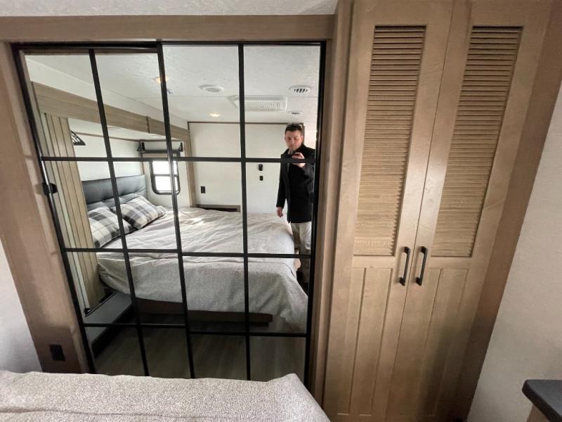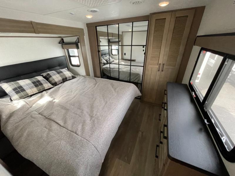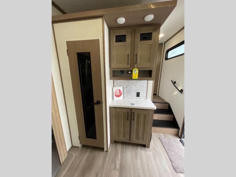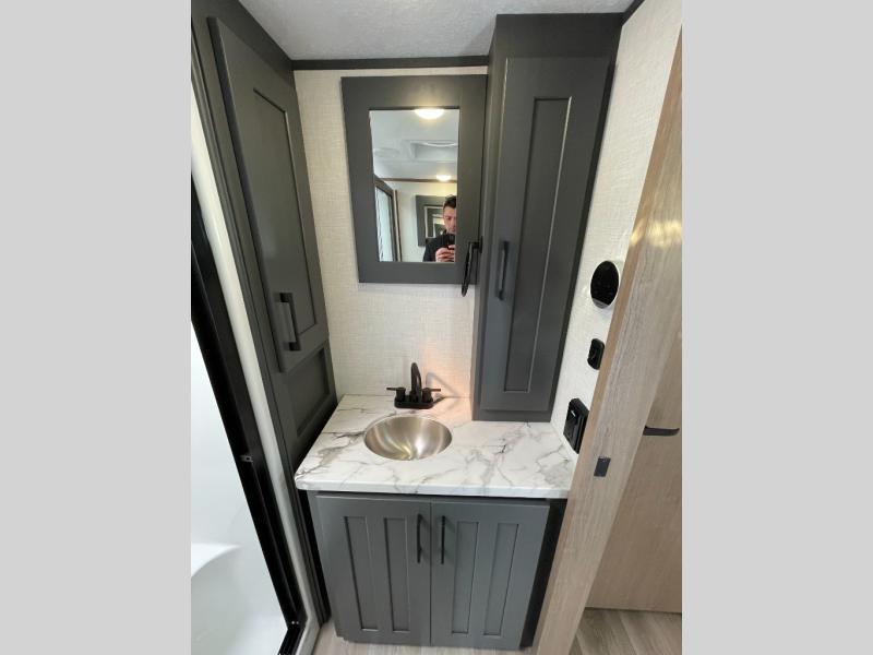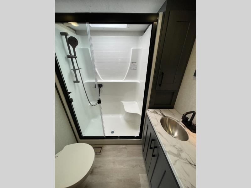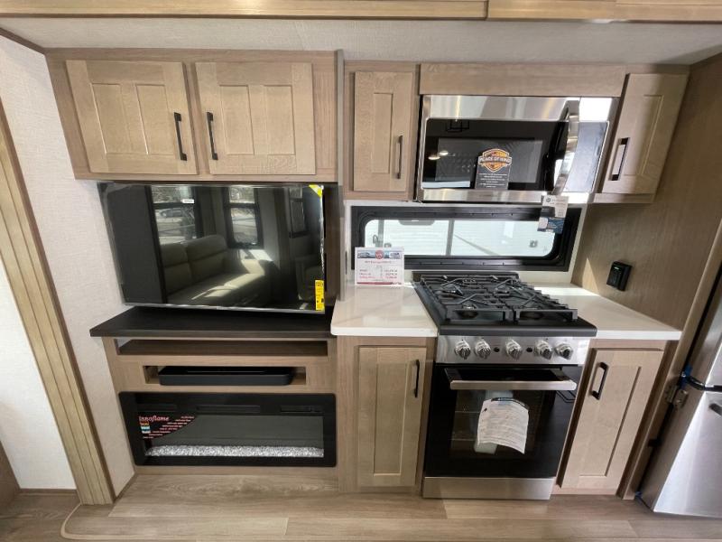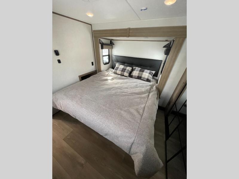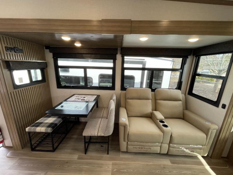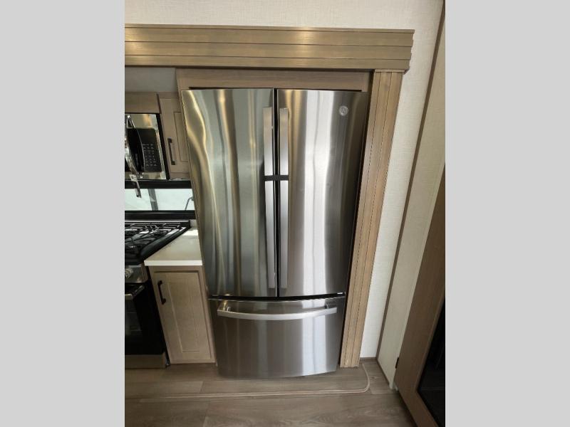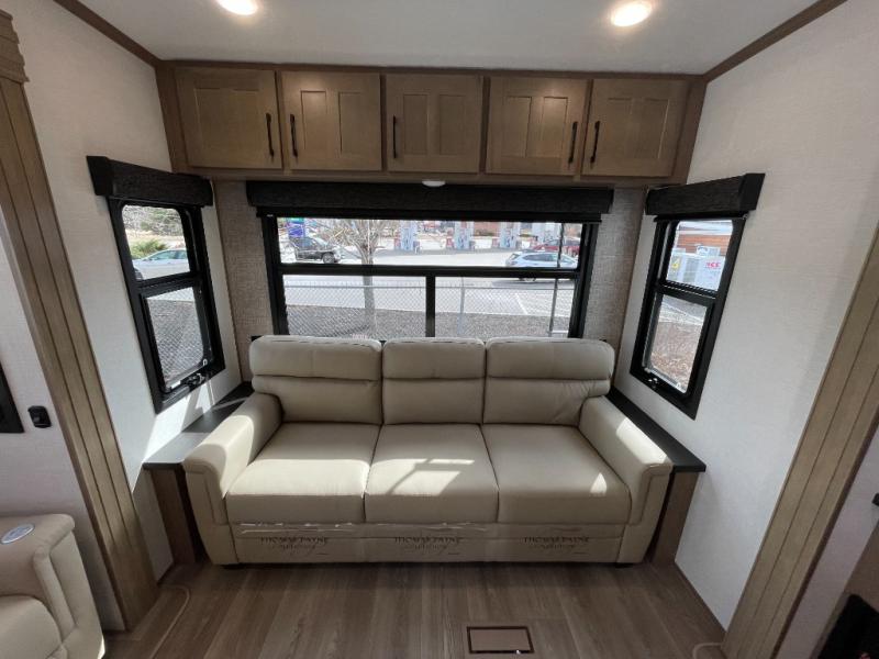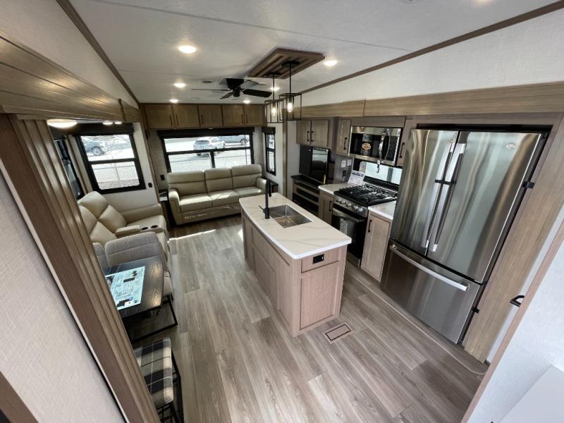 Start camping in luxury with this fifth wheel! The front private bedroom has a king bed slide which can be switched for an optional queen instead, a dresser, and a front wardrobe with washer and dryer prep. Start each morning feeling clean and fresh after showering in the 48" x 30" residential shower with a seat in the full bathroom. The kitchen has an island ideal for enjoying your morning coffee while reading the newspaper and socializing with the chef whipping up some scrambled eggs on the four burner range. The hutch can store your dishes, the pantry can store your canned goods, and the 18 cu. ft. refrigerator will keep your perishables fresh. If mother nature is raining on your parade then read a book on the rear hide-a-bed sofa or relax in the theater seating which has USB charging. And the entertainment center with a fireplace and 43" smart LED TV will keep you entertained!