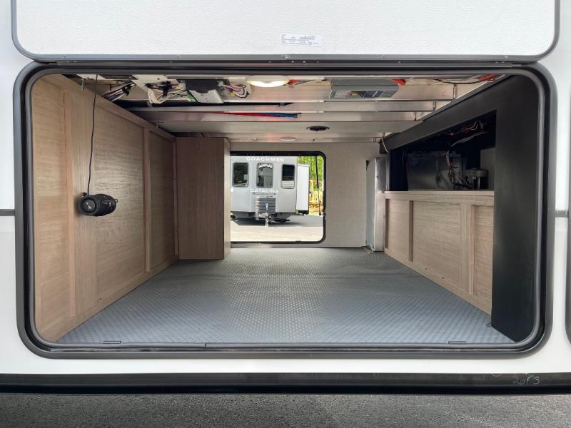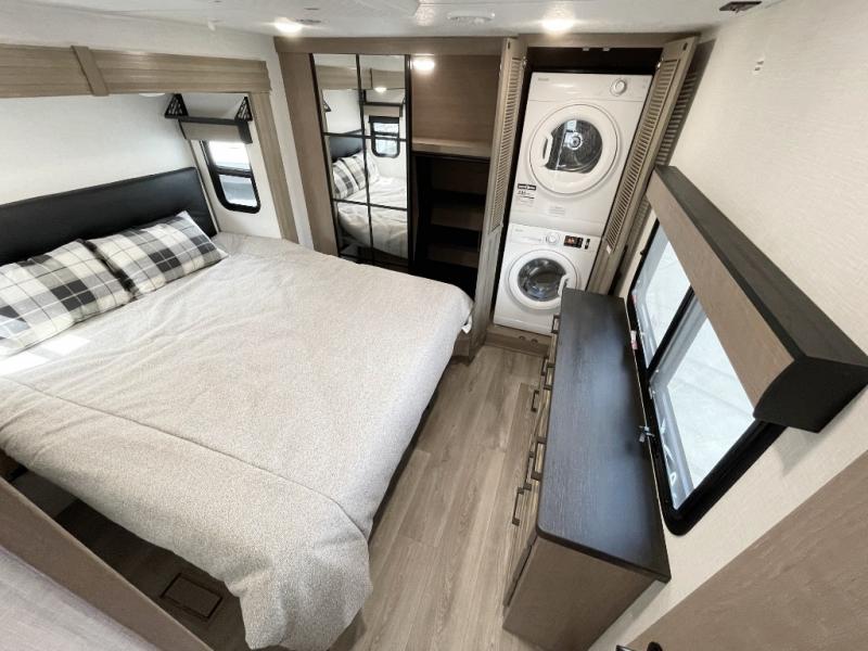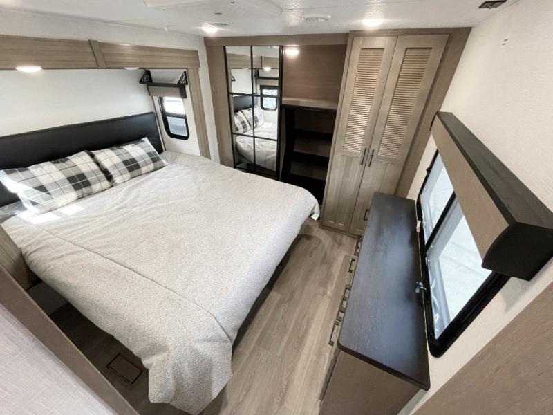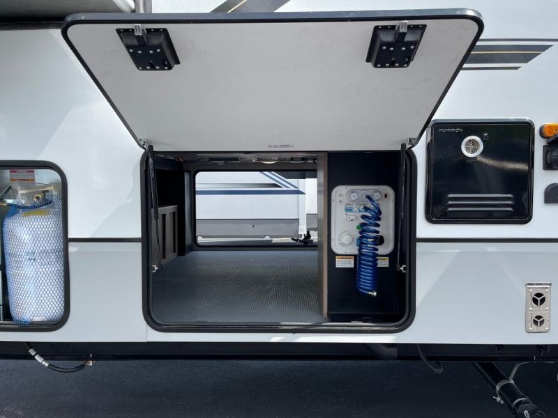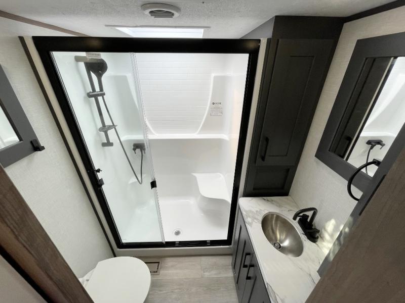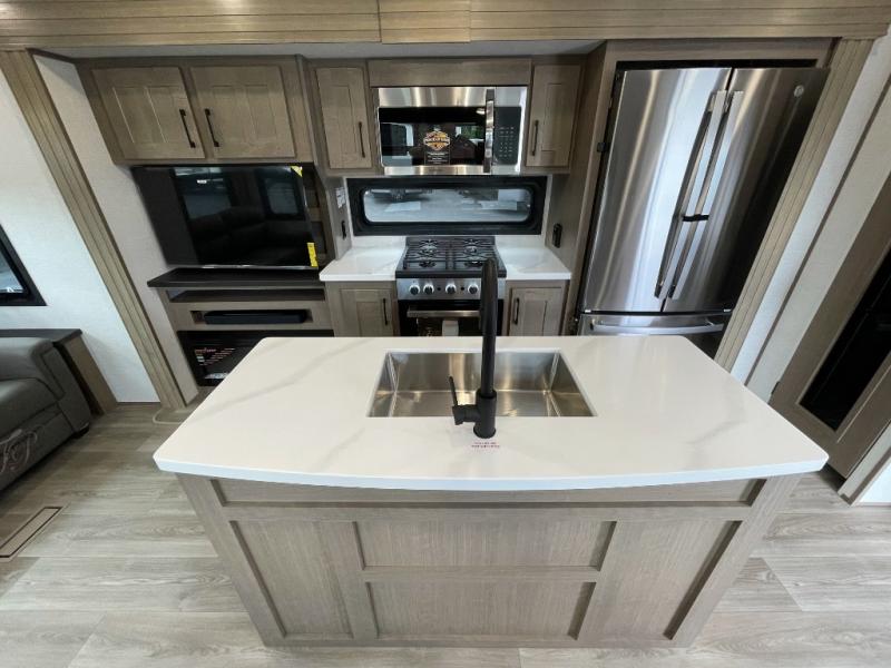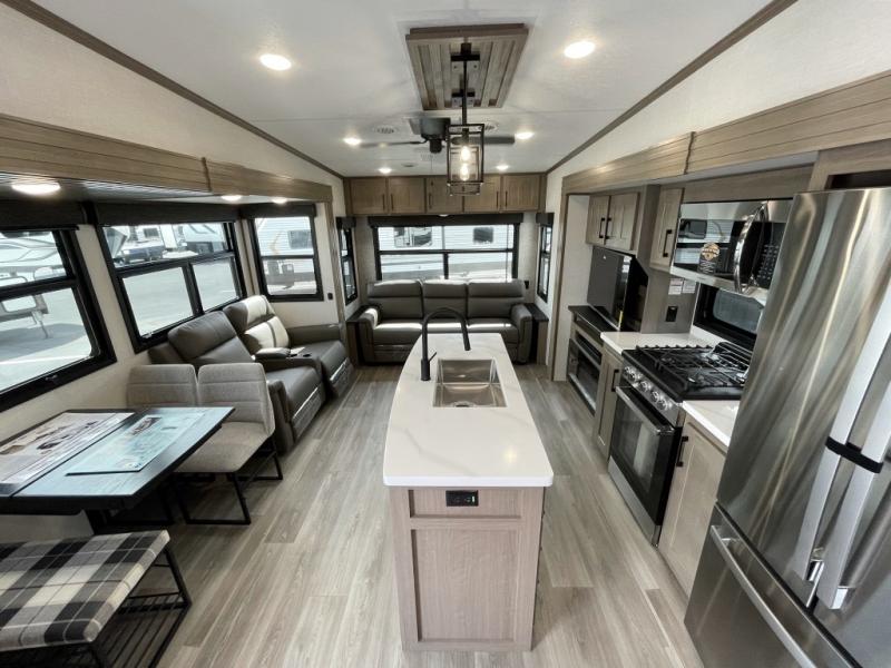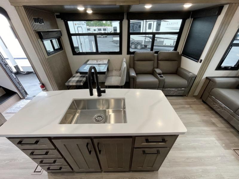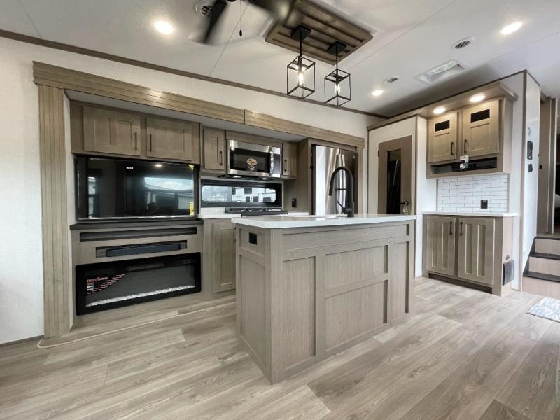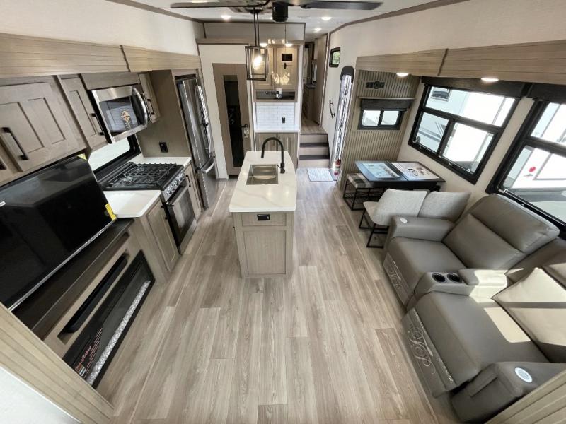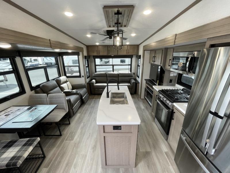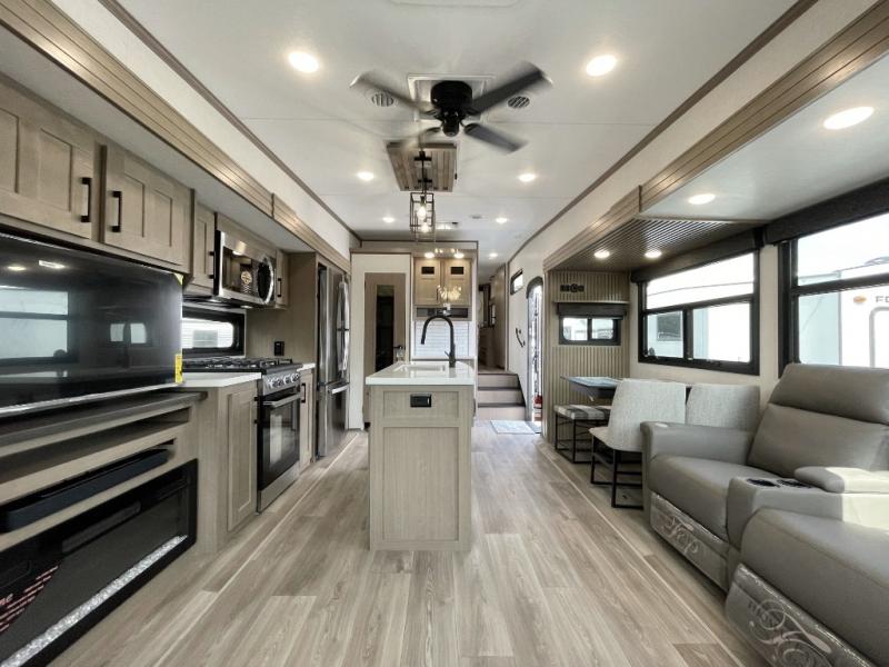 Start camping in luxury with this fifth wheel! The front private bedroom has a king bed slide which can be switched for an optional queen instead, a dresser, and a front wardrobe with washer and dryer prep. Start each morning feeling clean and fresh after showering in the 48" x 30" residential shower with a seat in the full bathroom. The kitchen has an island ideal for enjoying your morning coffee while reading the newspaper and socializing with the chef whipping up some scrambled eggs on the four burner range. The hutch can store your dishes, the pantry can store your canned goods, and the 18 cu. ft. refrigerator will keep your perishables fresh. If mother nature is raining on your parade then read a book on the rear hide-a-bed sofa or relax in the theater seating which has USB charging. And the entertainment center with a fireplace and 43" smart LED TV will keep you entertained!