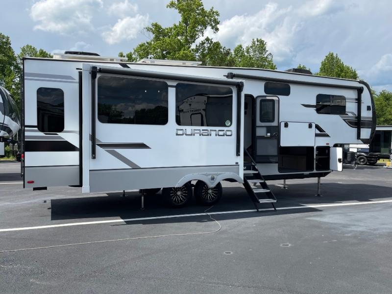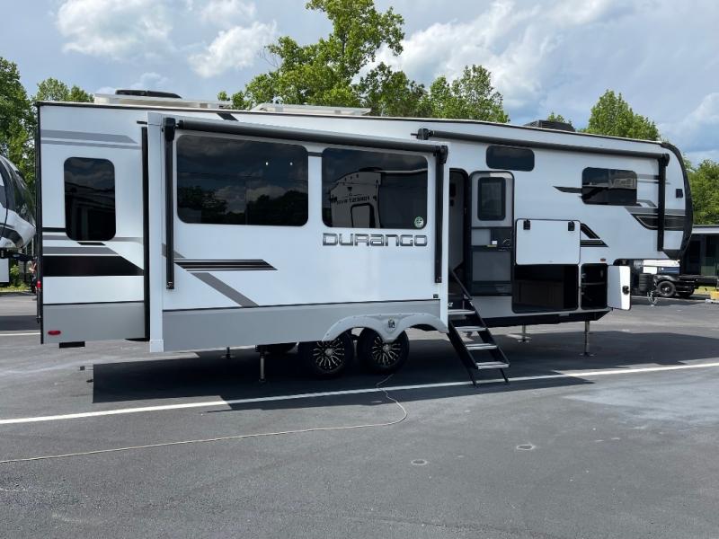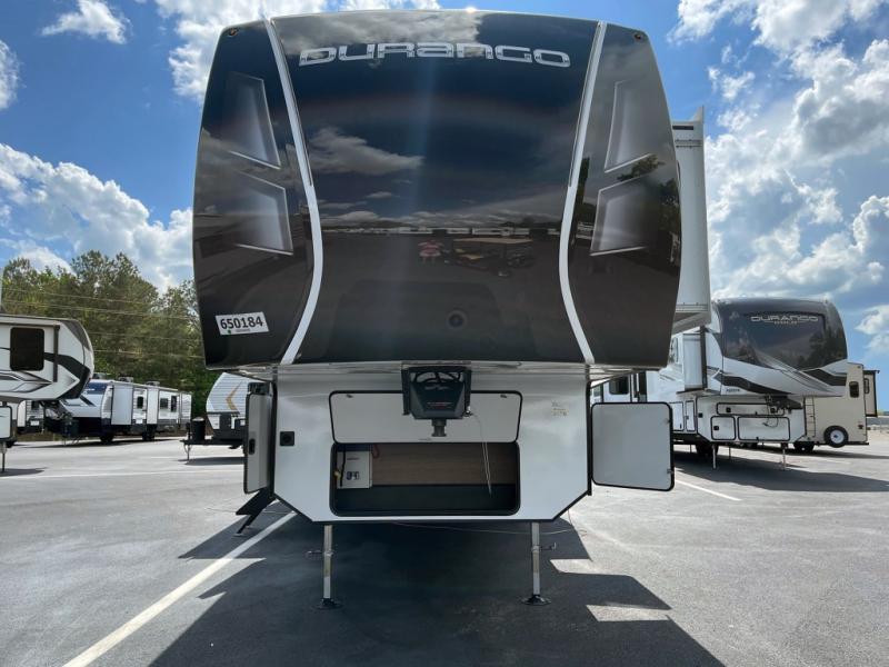 Enjoy full time living, an affordable price, and a wide body construction for more living space with every one of these KZ Durango light high-profile fifth wheels! These luxury units can be used all year round with the all-weather insulation package, the 3" x 14" foam-core in-floor straight-line heating system with a 35,000 BTU furnace, and the 15,000 BTU ducted roof A/C which optimizes the airflow by an average of 40% for better performance, cooling time, and reduction of noise. A few other construction features you will appreciate include a one piece, seamless walk-on Tufflex roofing material, Pex® in-floor heated waterlines, a Lamilux® gelcoat fiberglass exterior, and Dexter® axles with self adjusting brakes and height adjusting hangers. Inside, blancher cherry cabinetry, a king size bed, and smart TVs will have you feeling like you never left home!