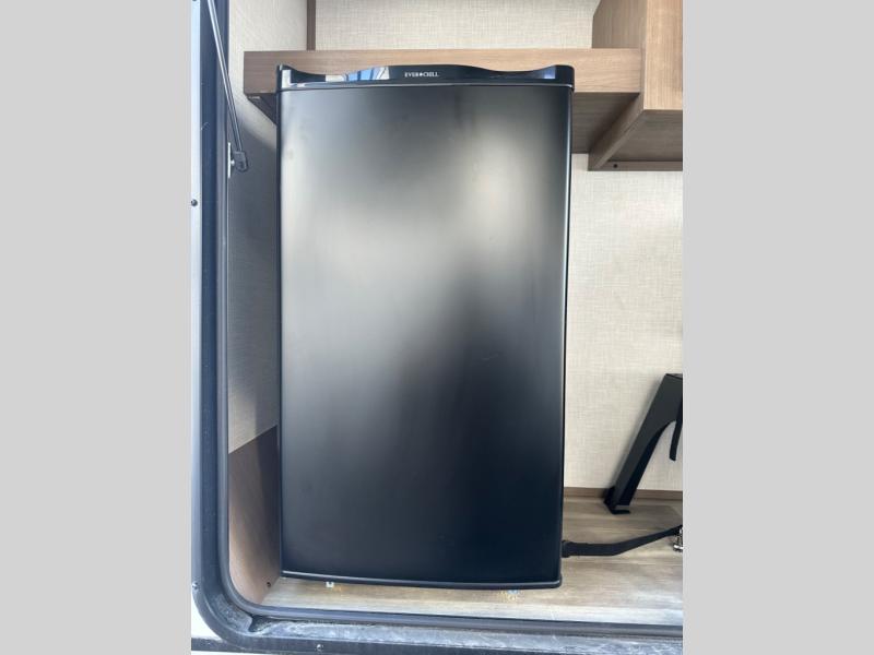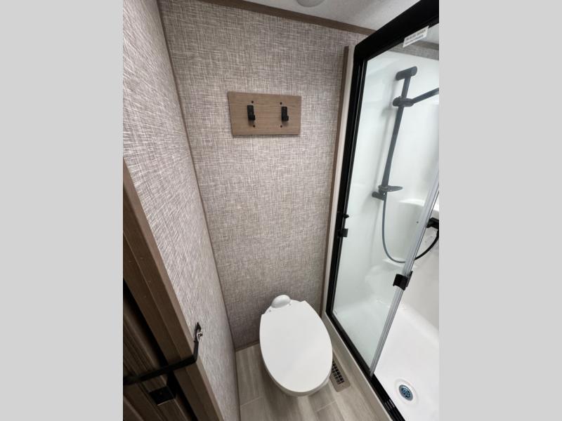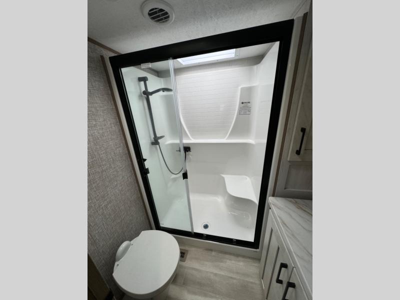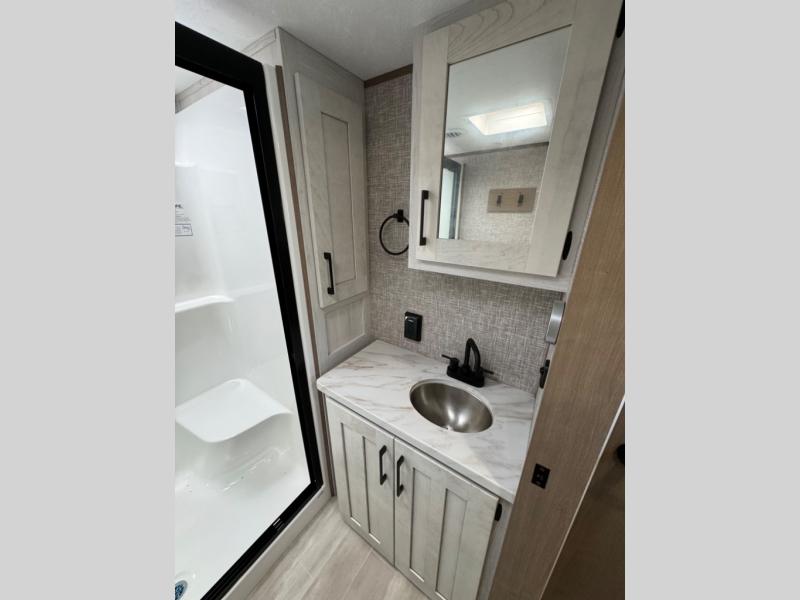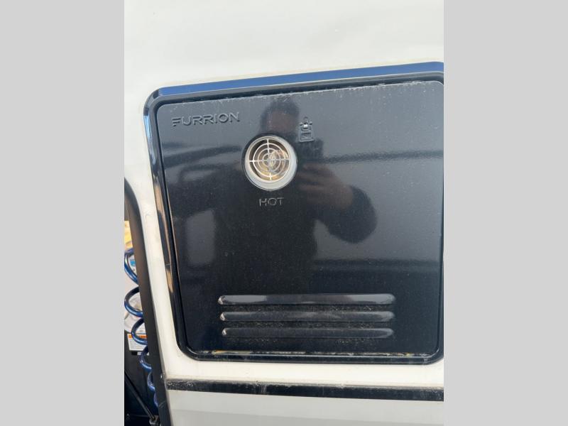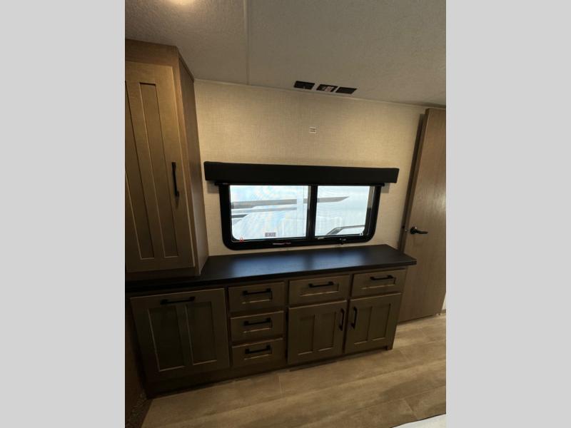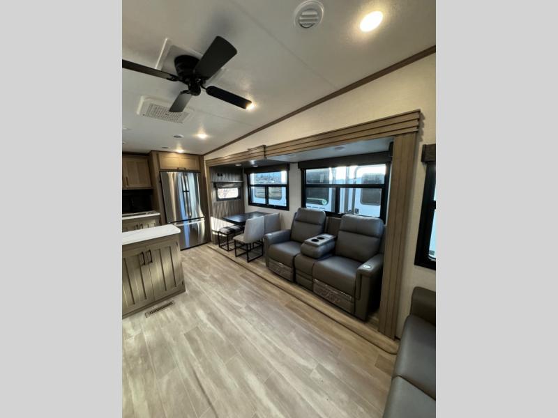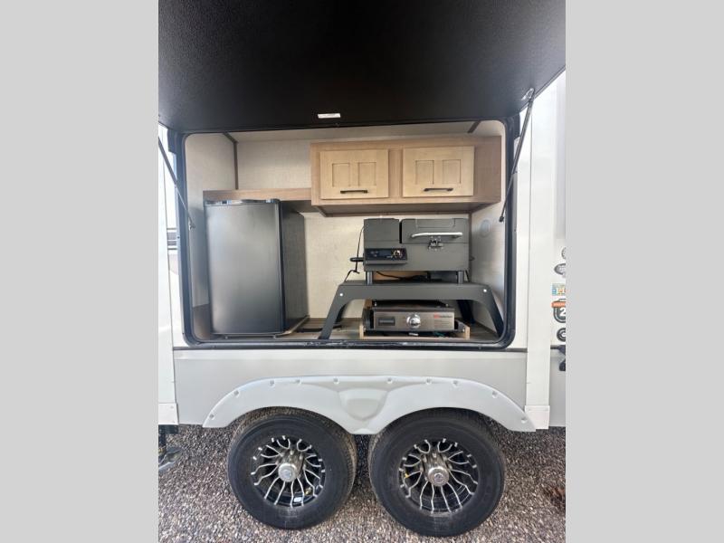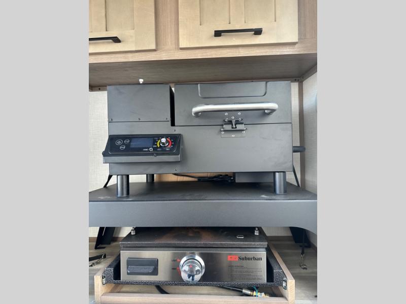The chef will love cooking in the rear kitchen of this fifth wheel! They could even cook the catch of the day on the outside griddle while enjoying a cold beverage from the refrigerator, plus there is a pellet smoker at the outside kitchen. You can enjoy your meals at the table and chairs then lay down on the hide-a-bed sofa after stuffing yourself full. The theater seating with USB charging also offers a comfortable place to relax in front of the 40" fireplace at the entertainment center. Freshen up each morning in the full bathroom with the 48" x 30" residential shower with a seat and easily grab your towel from the linen closet next to it. When you're ready to wind down your nights, head to the front private bedroom to change into your pajamas stored in the dresser with a built-in hamper or from the front wardrobe with washer and dryer prep. There is also a king bed slide out or you can choose the optional queen bed if you want more floor space.