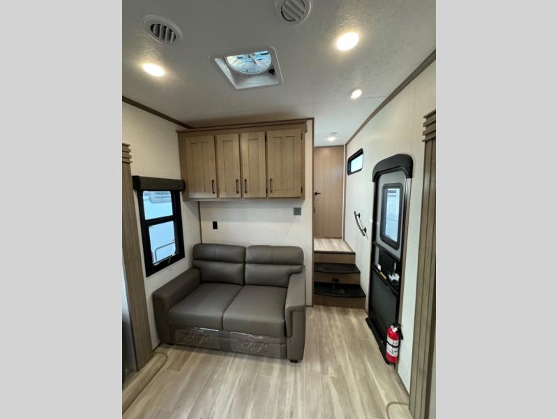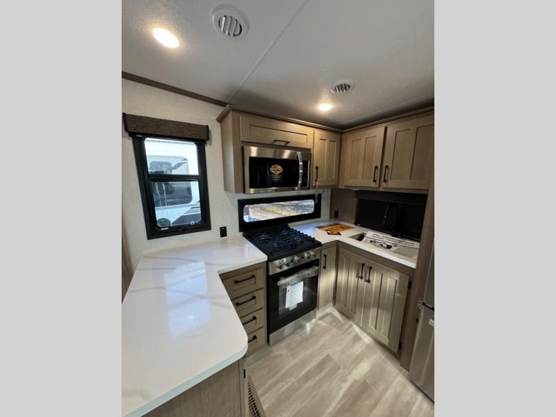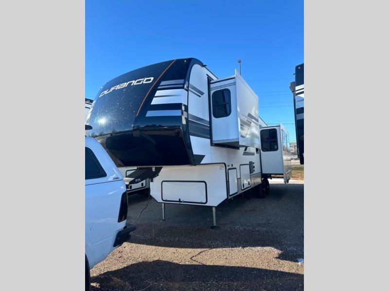 Enjoy full time living, an affordable price, and a wide body construction for more living space with every one of these KZ Durango light high-profile fifth wheels! These luxury units can be used all year round with the all-weather insulation package, the 3" x 14" foam-core in-floor straight-line heating system with a 35,000 BTU furnace, and the 15,000 BTU ducted roof A/C which optimizes the airflow by an average of 40% for better performance, cooling time, and reduction of noise. A few other construction features you will appreciate include a one piece, seamless walk-on Tufflex roofing material, Pex® in-floor heated waterlines, a Lamilux® gelcoat fiberglass exterior, and Dexter® axles with self adjusting brakes and height adjusting hangers. You can even venture off the beaten path with the now standard Off-The-Grid Solar Package that comes with two 220W solar panels. Inside, modern farmhouse cabinetry, a king size bed, and smart TVs will have you feeling like you never left home!