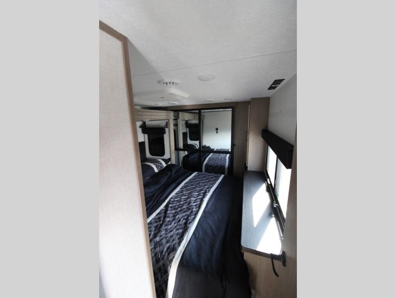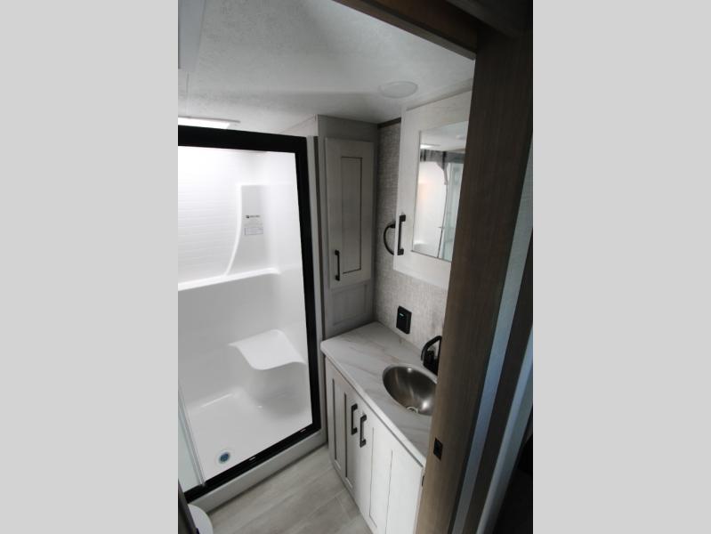 The chef will love cooking in the rear kitchen of this fifth wheel! They could even cook the catch of the day on the outside griddle while enjoying a cold beverage from the refrigerator, plus there is a pellet smoker at the outside kitchen. You can enjoy your meals at the table and chairs then lay down on the hide-a-bed sofa after stuffing yourself full. The theater seating with USB charging also offers a comfortable place to relax in front of the 40" fireplace at the entertainment center. Freshen up each morning in the full bathroom with the 48" x 30" residential shower with a seat and easily grab your towel from the linen closet next to it. When you're ready to wind down your nights, head to the front private bedroom to change into your pajamas stored in the dresser with a built-in hamper or from the front wardrobe with washer and dryer prep. There is also a king bed slide out or you can choose the optional queen bed if you want more floor space.