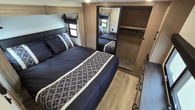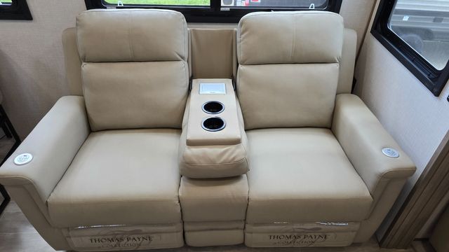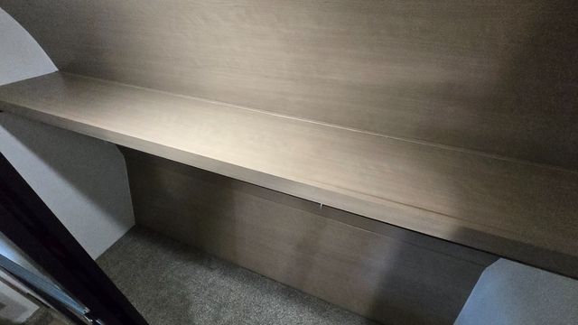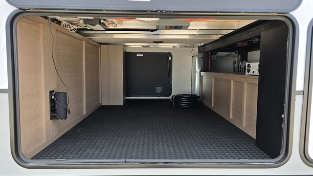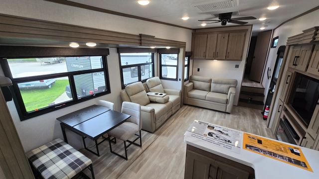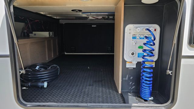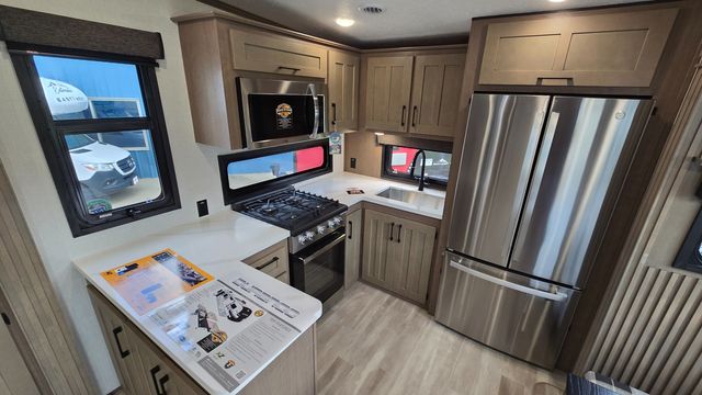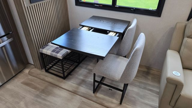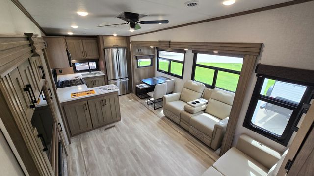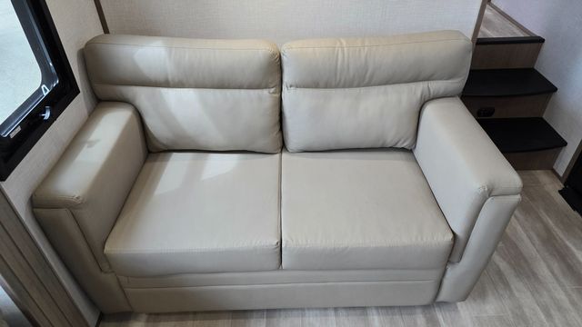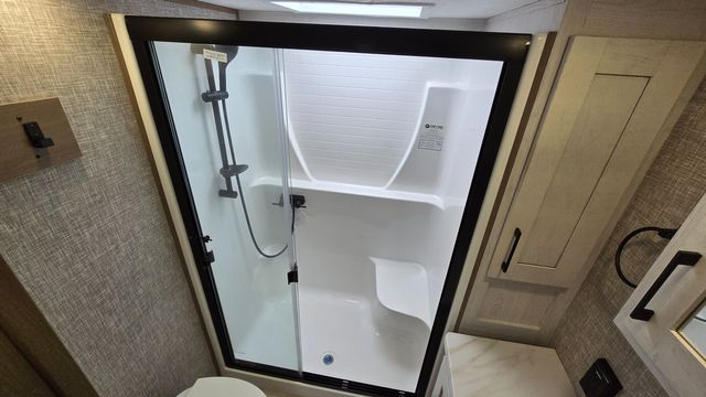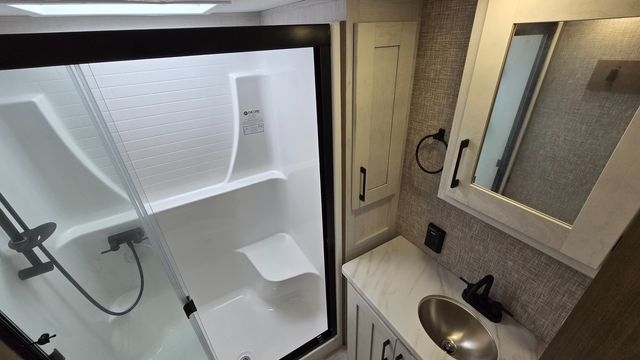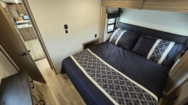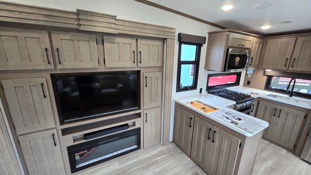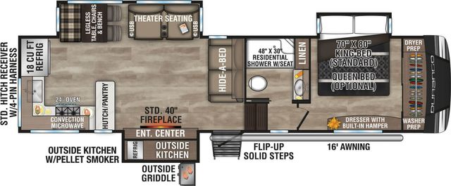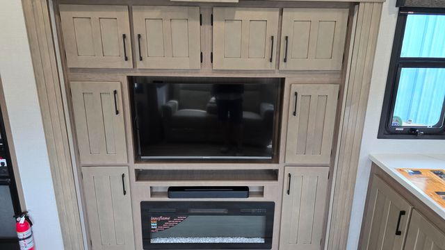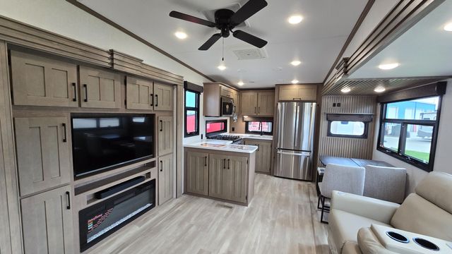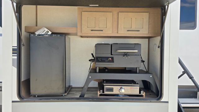 The chef will love cooking in the rear kitchen of this fifth wheel! They could even cook the catch of the day on the outside griddle while enjoying a cold beverage from the refrigerator, plus there is a smart TV at the outside kitchen. You can enjoy your meals at the table and chairs then lay down on the hide-a-bed sofa after stuffing yourself full. The theater seating with USB charging also offers a comfortable place to relax in front of the 40" fireplace at the entertainment center. Freshen up each morning in the full bathroom with the 48" x 30" residential shower with a seat and easily grab your towel from the linen closet next to it. When you're ready to wind down your nights, head to the front private bedroom to change into your pajamas stored in the dresser or from the front wardrobe with washer and dryer prep. There is also a king bed slide out or you can choose the optional queen bed if you want more floor space.