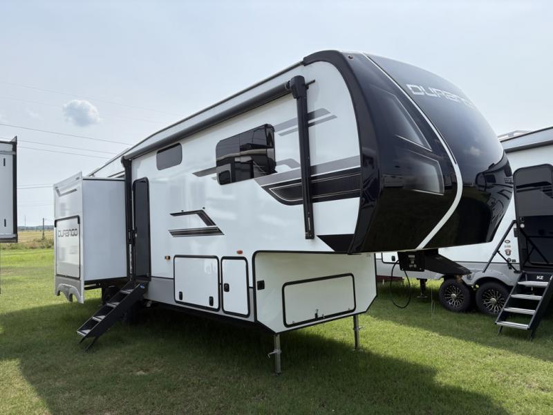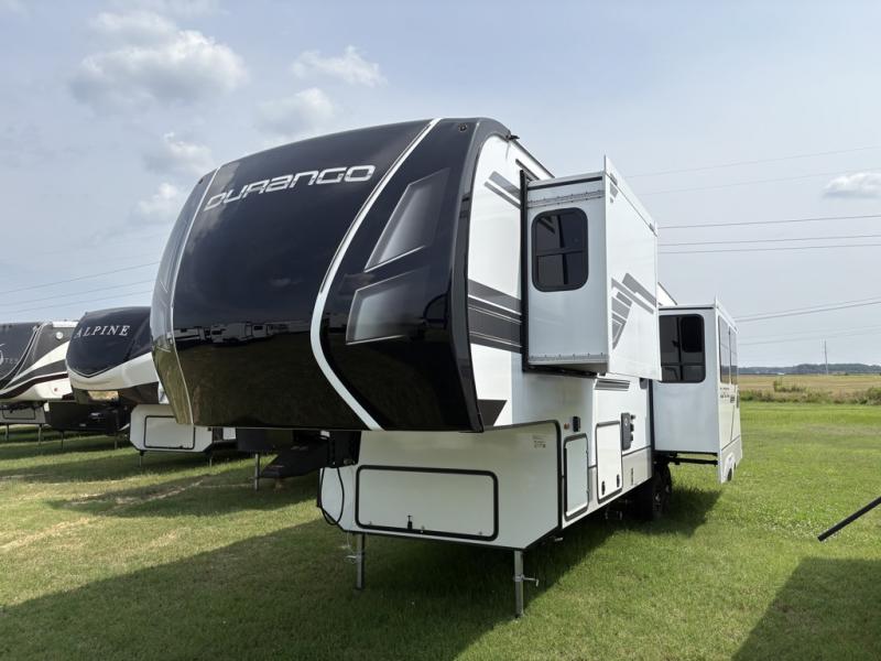 Enjoy full time living, an affordable price, and a wide body construction for more living space with every one of these KZ Durango light high-profile fifth wheels! These luxury units can be used all year round with the all-weather insulation package, the 3" x 14" foam-core in-floor straight-line heating system with a 35,000 BTU furnace, and the 15,000 BTU ducted roof A/C which optimizes the airflow by an average of 40% for better performance, cooling time, and reduction of noise. A few other construction features you will appreciate include a one piece, seamless walk-on Tufflex roofing material, Pex® in-floor heated waterlines, a Lamilux® gelcoat fiberglass exterior, and Dexter® axles with self adjusting brakes and height adjusting hangers. Inside, blancher cherry cabinetry, a king size bed, and smart TVs will have you feeling like you never left home!