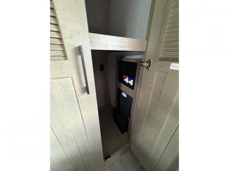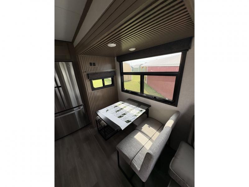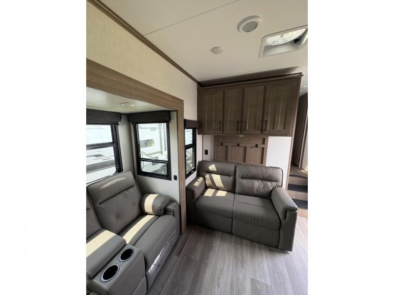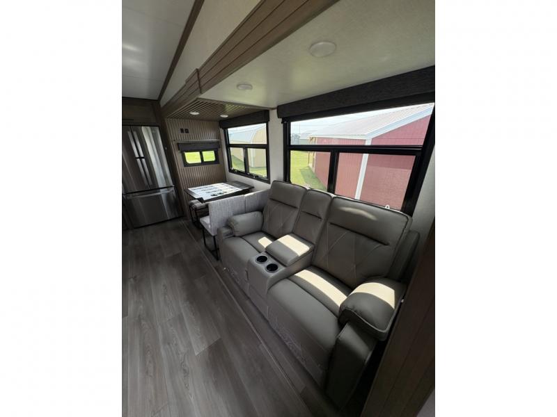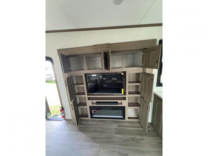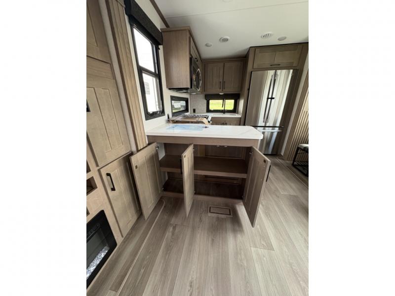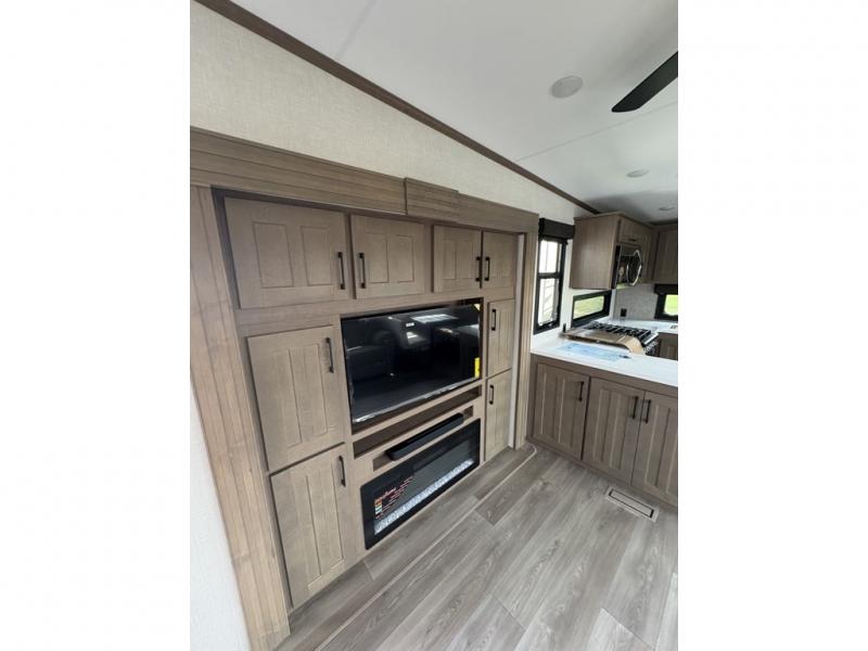 The chef will love cooking in the rear kitchen of this fifth wheel! They could even cook the catch of the day on the outside griddle while enjoying a cold beverage from the refrigerator, plus there is a smart TV at the outside kitchen. You can enjoy your meals at the table and chairs then lay down on the hide-a-bed sofa after stuffing yourself full. The theater seating with USB charging also offers a comfortable place to relax in front of the 40" fireplace at the entertainment center. Freshen up each morning in the full bathroom with the 48" x 30" residential shower with a seat and easily grab your towel from the linen closet next to it. When you're ready to wind down your nights, head to the front private bedroom to change into your pajamas stored in the dresser or from the front wardrobe with washer and dryer prep. There is also a king bed slide out or you can choose the optional queen bed if you want more floor space.