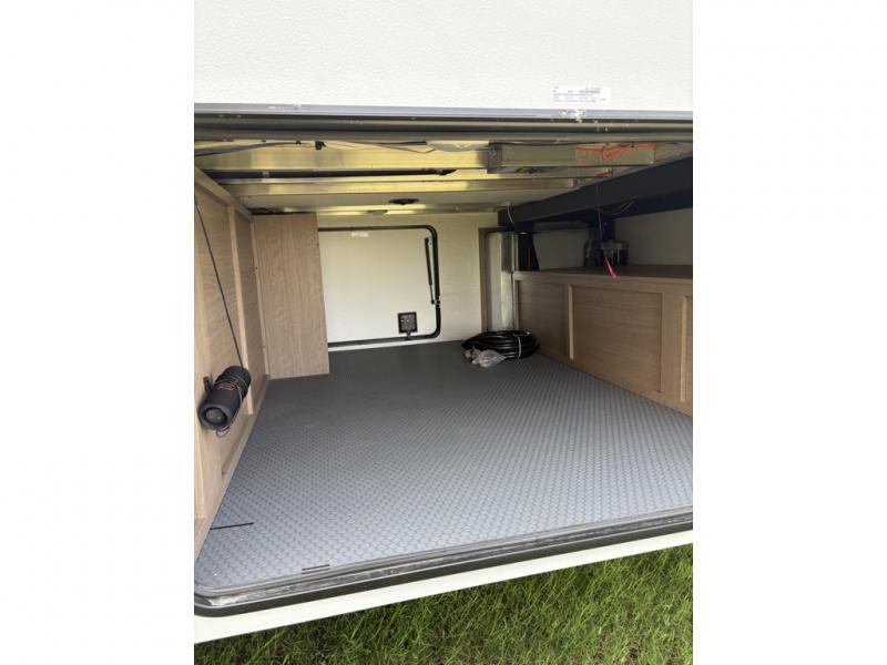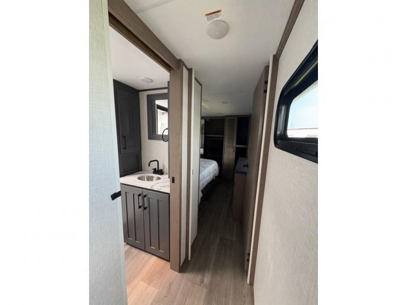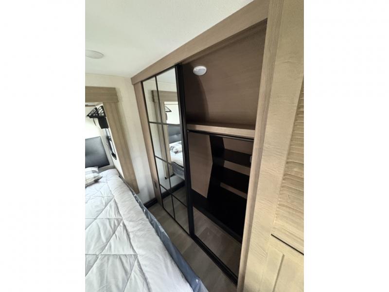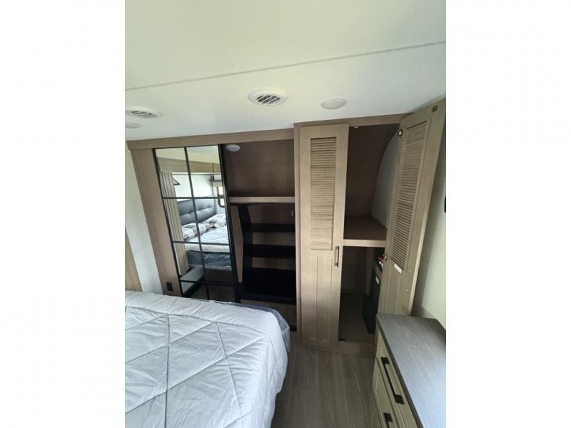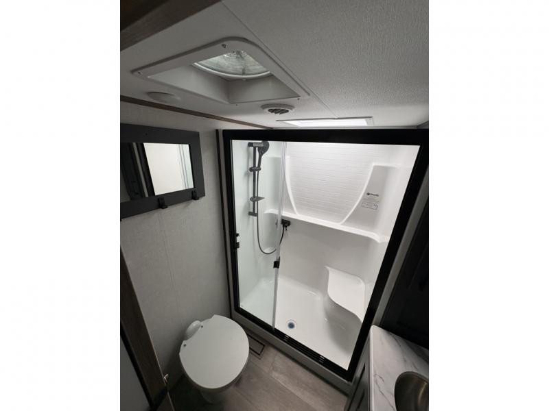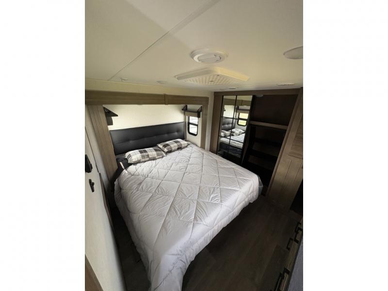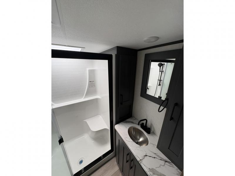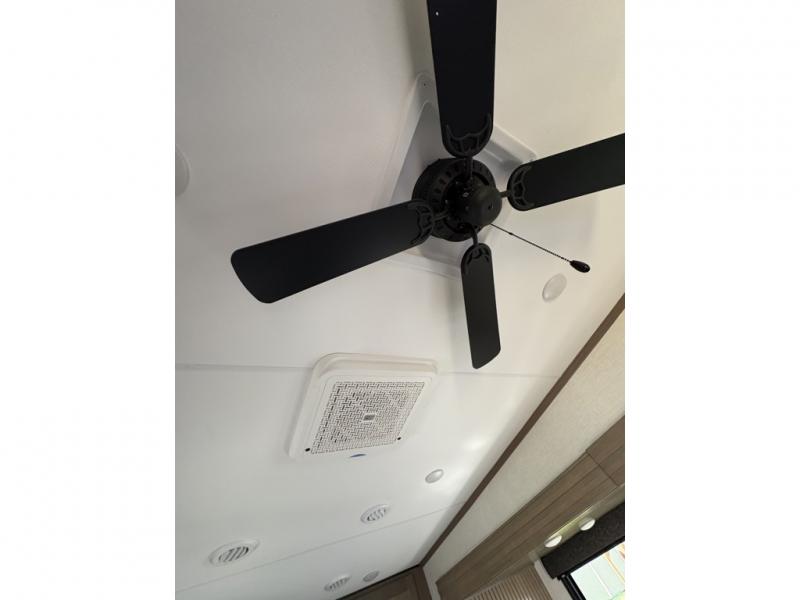 The chef will love cooking in the rear kitchen of this fifth wheel! They could even cook the catch of the day on the outside griddle while enjoying a cold beverage from the refrigerator, plus there is a smart TV at the outside kitchen. You can enjoy your meals at the table and chairs then lay down on the hide-a-bed sofa after stuffing yourself full. The theater seating with USB charging also offers a comfortable place to relax in front of the 40" fireplace at the entertainment center. Freshen up each morning in the full bathroom with the 48" x 30" residential shower with a seat and easily grab your towel from the linen closet next to it. When you're ready to wind down your nights, head to the front private bedroom to change into your pajamas stored in the dresser or from the front wardrobe with washer and dryer prep. There is also a king bed slide out or you can choose the optional queen bed if you want more floor space.