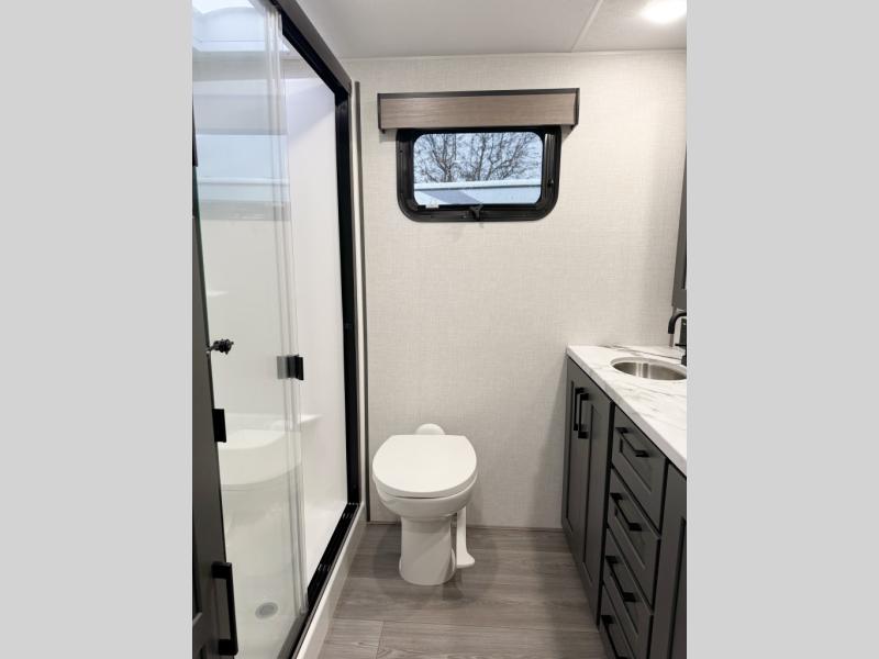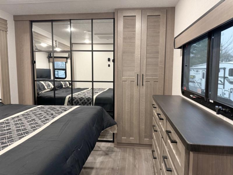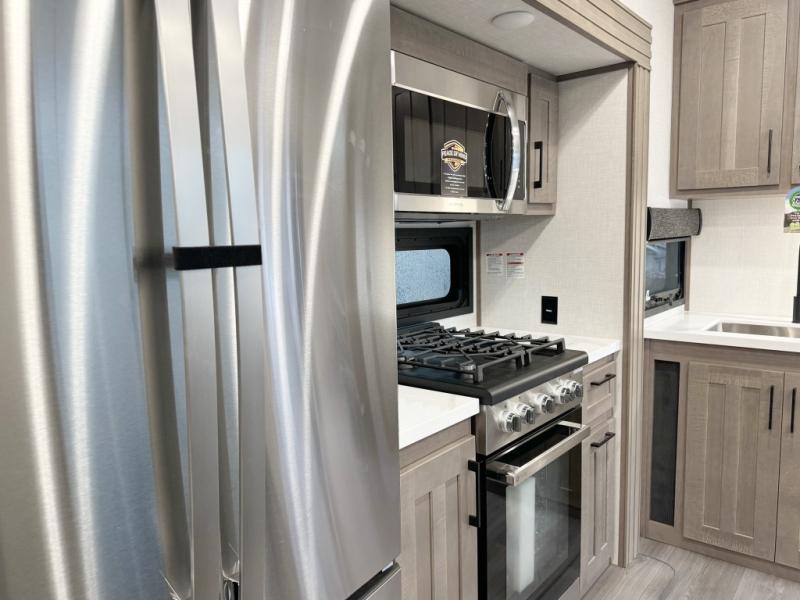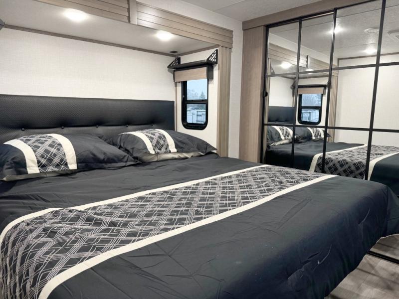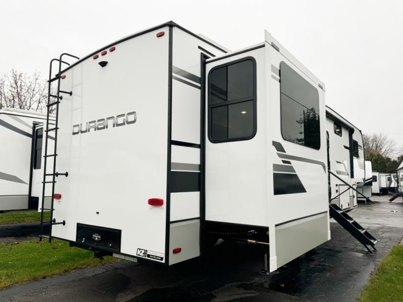 Enjoy full time living, an affordable price, and a wide body construction for more living space with every one of these KZ Durango light high-profile fifth wheels! These luxury units can be used all year round with the all-weather insulation package, the 3" x 14" foam-core in-floor straight-line heating system with a 35,000 BTU furnace, and the 15,000 BTU ducted roof A/C which optimizes the airflow by an average of 40% for better performance, cooling time, and reduction of noise. A few other construction features you will appreciate include a one piece, seamless walk-on Tufflex roofing material, Pex® in-floor heated waterlines, a Lamilux® gelcoat fiberglass exterior, and Dexter® axles with self adjusting brakes and height adjusting hangers. You can even venture off the beaten path with the now standard Off-The-Grid Solar Package that comes with two 220W solar panels. Inside, modern farmhouse cabinetry, a king size bed, and smart TVs will have you feeling like you never left home!