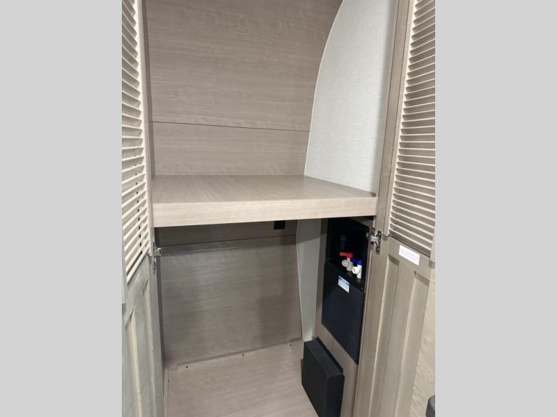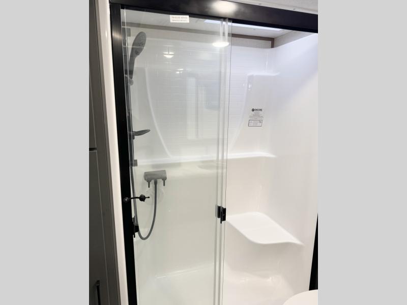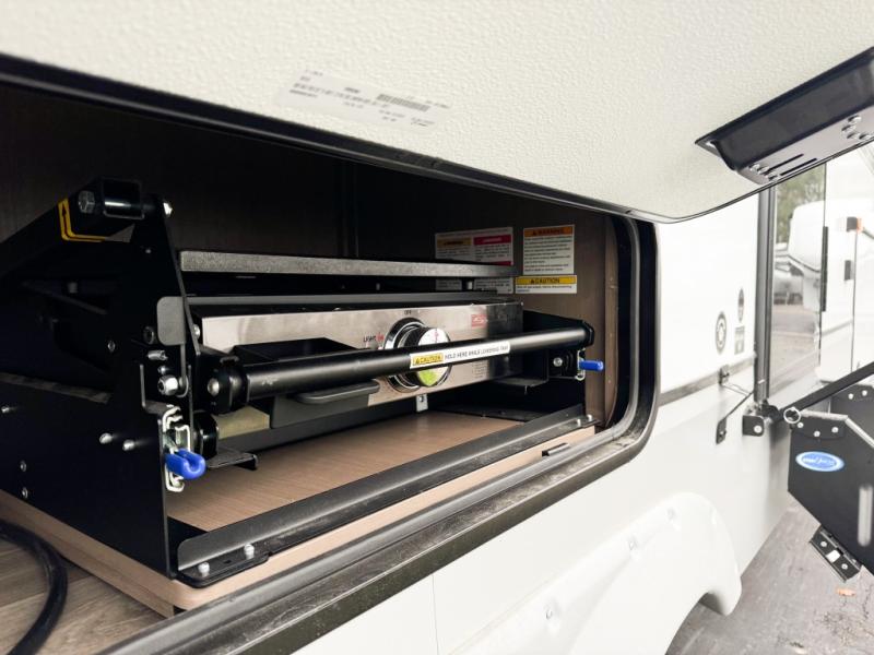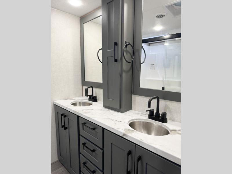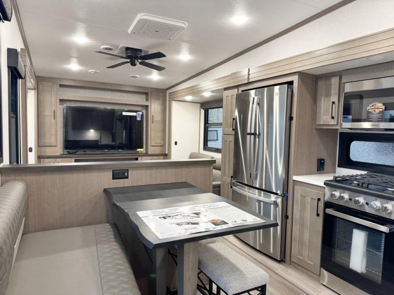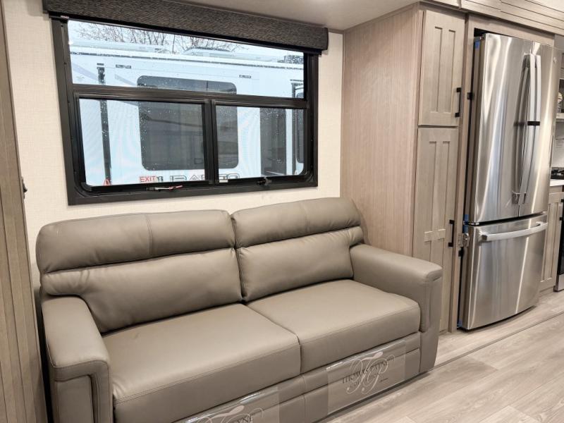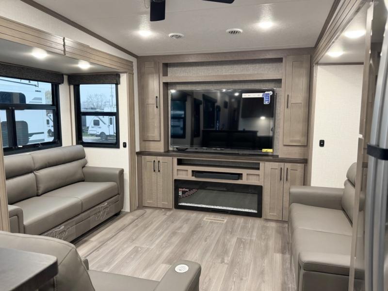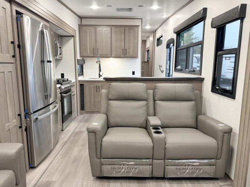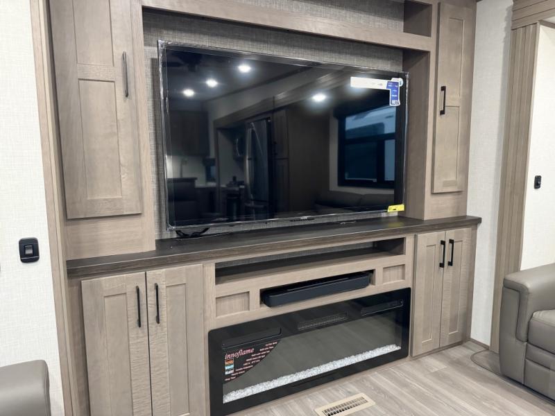 The rear living area of this fifth wheel will be the talk of the campground! It features a rear entertainment center with a 65" smart LED TV and a 48" fireplace, as well as opposing hide-a-bed sofa slides and theater seating with USB charging. The kitchen has everything you need to prepare your best meals including a 24" oven with the four burner range and booth seating with two chairs on the other side to enjoy your meals and play card games. Two can get ready at once in the full bathroom with the dual sink vanity and rinse the sand out of your hair with the 48" x 30" residential shower with a seat. The front private bedroom has a king bed slide across from a dresser with a built-in hamper and a front wardrobe with washer and dryer prep. There is even an outside griddle to cook some pancakes for a sunrise breakfast!