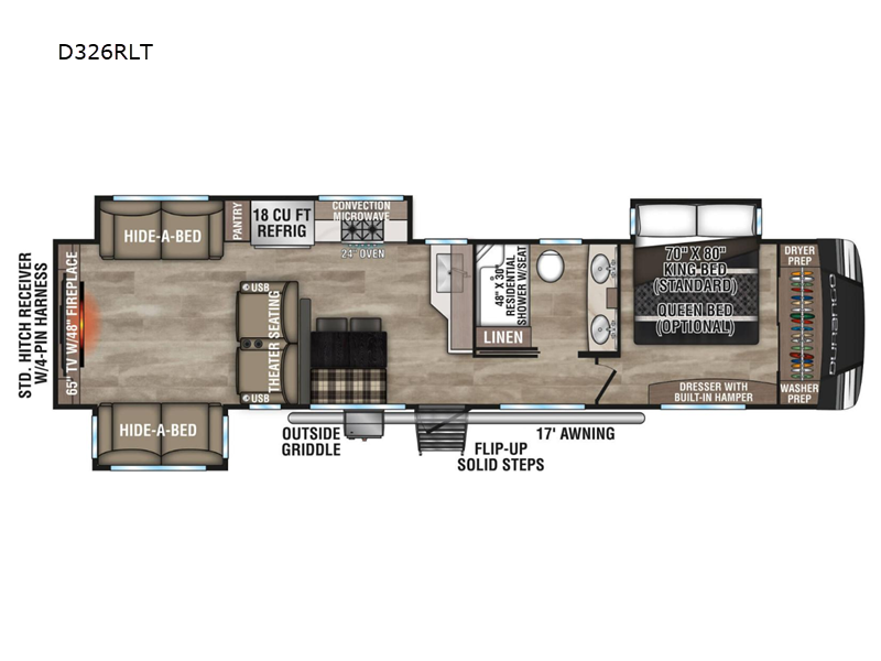 The rear living area of this fifth wheel will be the talk of the campground! It features a rear entertainment center with a 65" smart LED TV and a 48" fireplace, as well as opposing hide-a-bed sofa slides and theater seating with USB charging. The kitchen has everything you need to prepare your best meals including a 24" oven with the four burner range and booth seating with two chairs on the other side to enjoy your meals and play card games. Two can get ready at once in the full bathroom with the dual sink vanity and rinse the sand out of your hair with the 48" x 30" residential shower with a seat. The front private bedroom has a king bed slide across from a dresser with a built-in hamper and a front wardrobe with washer and dryer prep. There is even an outside griddle to cook some pancakes for a sunrise breakfast!