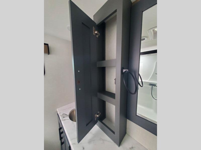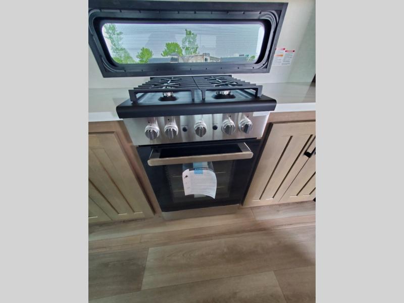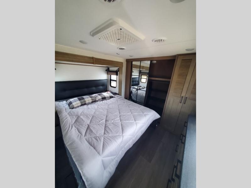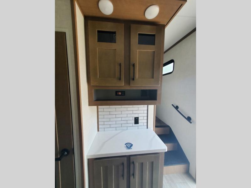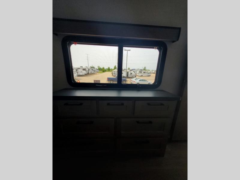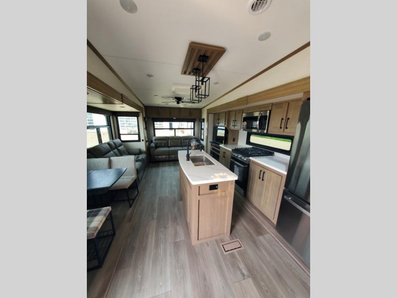 Don't pass up your chance to camp in true luxury with this fifth wheel! There is a kitchen island for others to help prepare dinner which can be either cooked on the four burner range or inside the 24" oven. The hutch can store your dishes and the large pantry can store your favorite snacks/canned goods. After a fun day at the beach, rinse the sand out in the 48" x 30" residential shower with a seat in the full bathroom, plus it has a dual sink vanity for two to get ready at once in the morning. When it's time to relax either lay down on the king bed slide in the front private bedroom or head to the rear living area where you can lay on the hide-a-bed sofa or sit in the theater seating with USB charging. There is also an entertainment center with a 40" fireplace and 43" smart LED TV to watch a movie!