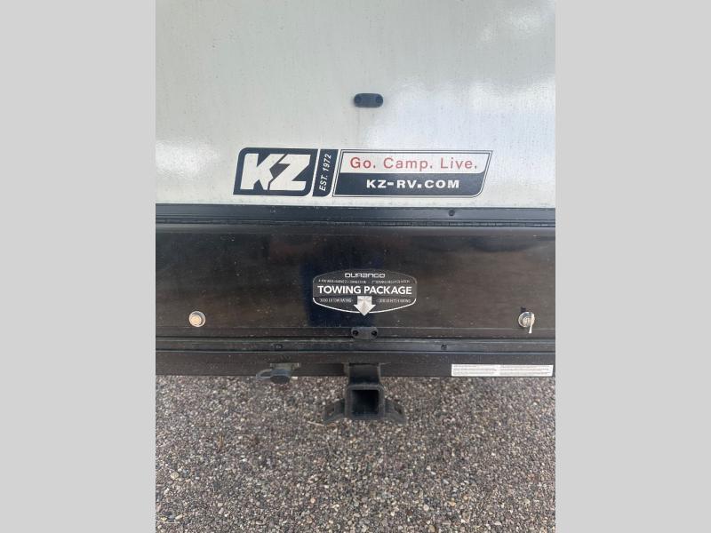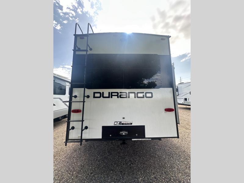 Enjoy full time living, an affordable price, and a wide body construction for more living space with every one of these KZ Durango light high-profile fifth wheels! These luxury units can be used all year round with the all-weather insulation package, the 3" x 14" foam-core in-floor straight-line heating system with a 35,000 BTU furnace, and the 15,000 BTU ducted roof A/C which optimizes the airflow by an average of 40% for better performance, cooling time, and reduction of noise. A few other construction features you will appreciate include a one piece, seamless walk-on Tufflex roofing material, Pex® in-floor heated waterlines, a Lamilux® gelcoat fiberglass exterior, and Dexter® axles with self adjusting brakes and height adjusting hangers. Inside, blancher cherry cabinetry, a king size bed, and smart TVs will have you feeling like you never left home!