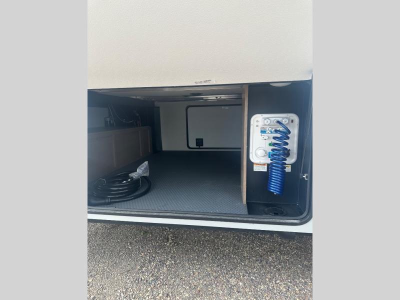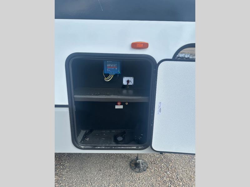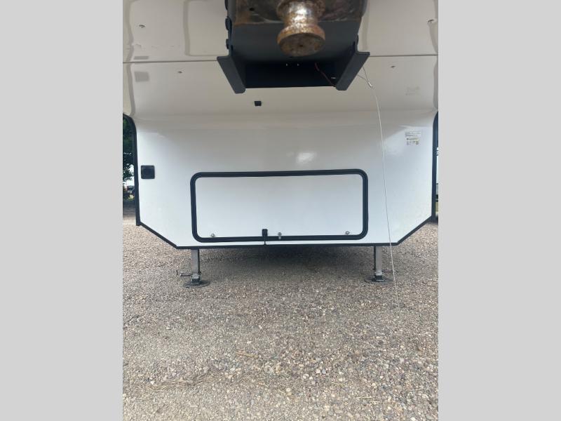 Don't pass up your chance to camp in true luxury with this fifth wheel! There is a kitchen island for others to help prepare dinner which can be either cooked on the four burner range or inside the 24" oven. The hutch can store your dishes and the large pantry can store your favorite snacks/canned goods. After a fun day at the beach, rinse the sand out in the 48" x 30" residential shower with a seat in the full bathroom, plus it has a dual sink vanity for two to get ready at once in the morning. When it's time to relax either lay down on the king bed slide in the front private bedroom or head to the rear living area where you can lay on the hide-a-bed sofa or sit in the theater seating with USB charging. There is also an entertainment center with a 40" fireplace and 43" smart LED TV to watch a movie!