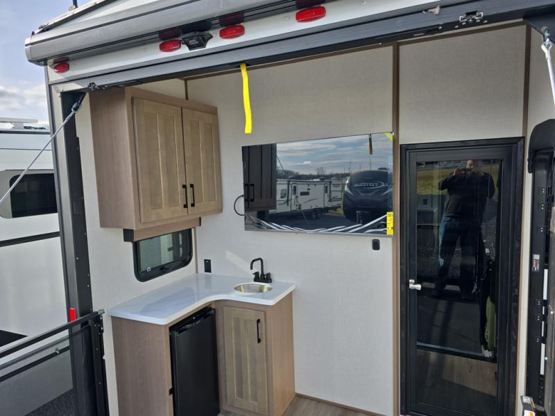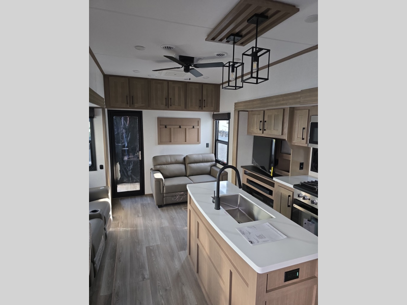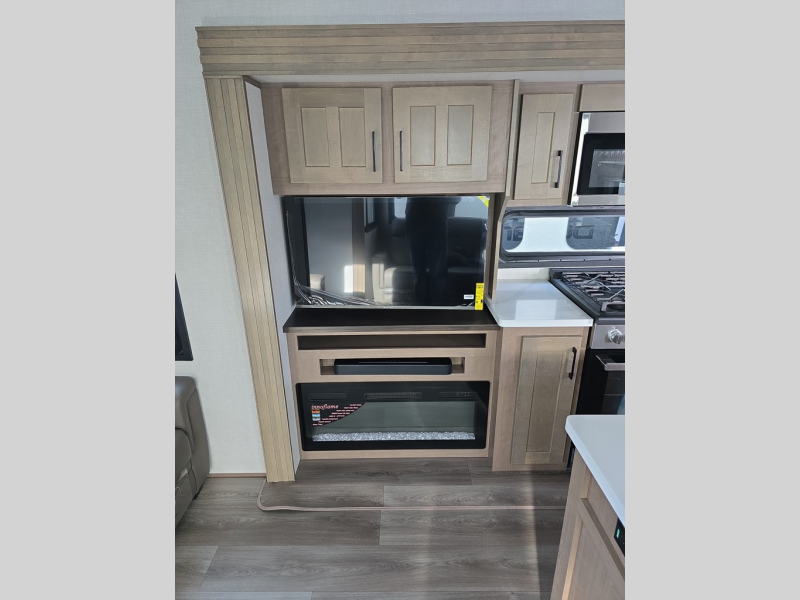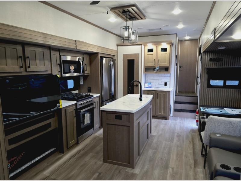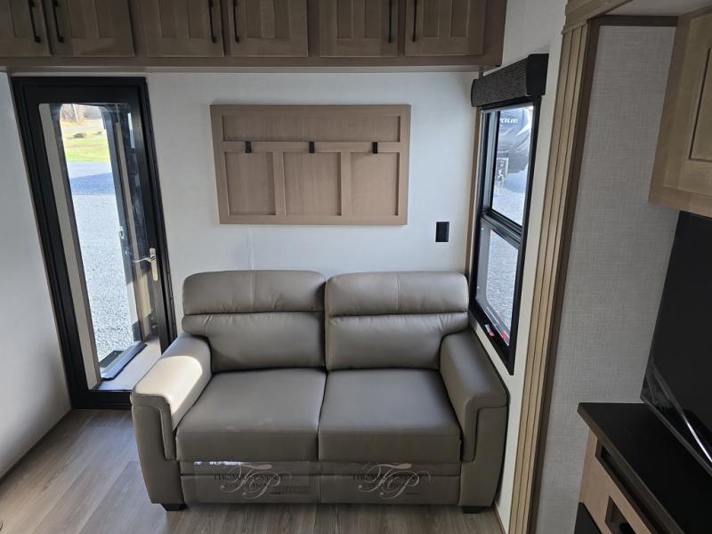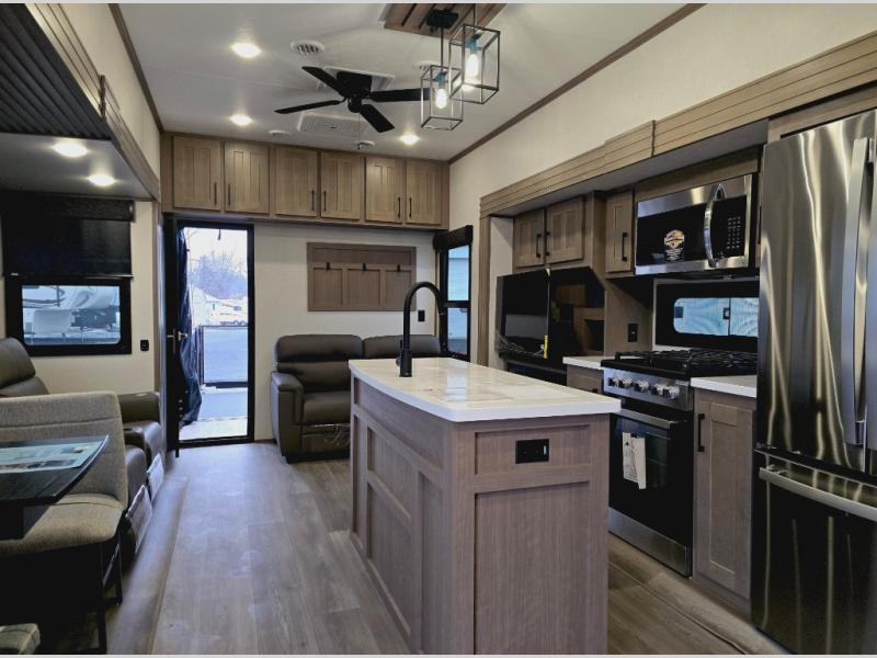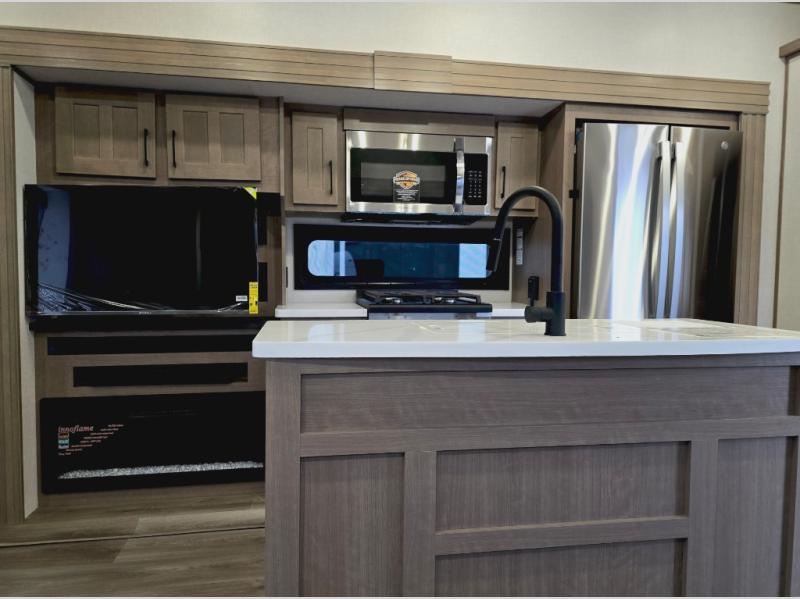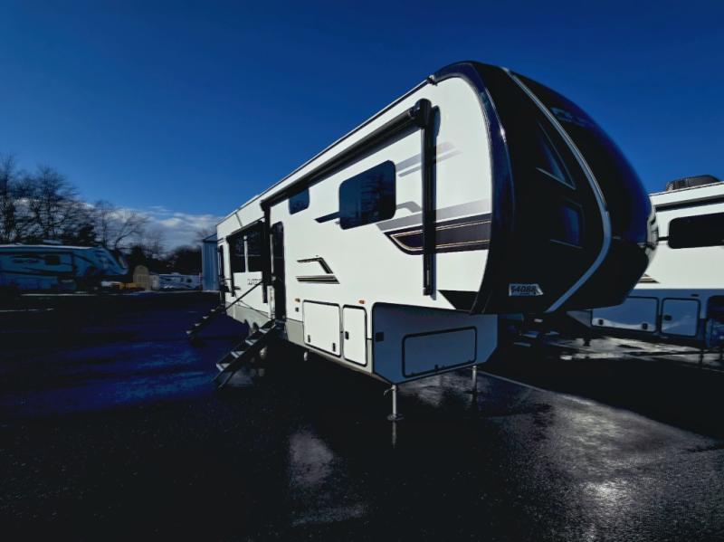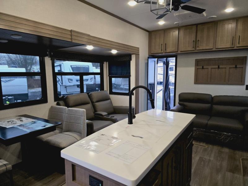 Experience the pinnacle of luxury fifth-wheel living! The front private bedroom has a king bed slide which can be switched for an optional queen instead, a dresser, and a front wardrobe with washer and dryer prep. Start feeling clean and fresh each morning after showering in the 48" x 30" residential shower with a seat in the full bathroom. The kitchen has an island that will make cooking time easy and allow you to mingle with the chef whipping up some scrambled eggs on the four-burner range. The hutch can store your dishes, the pantry can store your canned goods, and the 18 cu. ft. refrigerator will keep your perishables fresh. To experience a quiet time and relaxing time read a book on the rear hide-a-bed sofa or relax in the theater seating with USB charging. And the entertainment center with a fireplace and 50" smart LED TV will keep you entertained! Finally, this unit offers a flexible storage space ideal for keeping all organized and neat, and a patio deck, perfect for spending time outside connecting with nature.