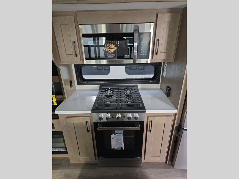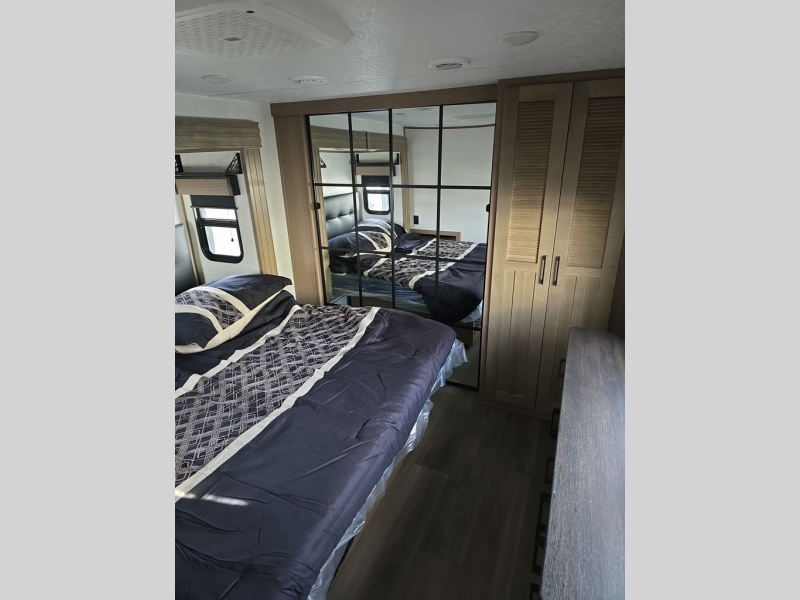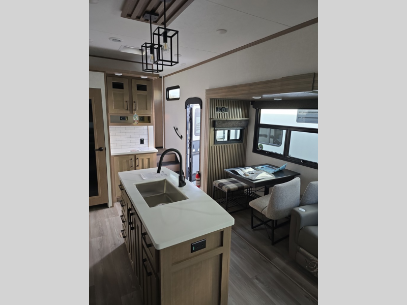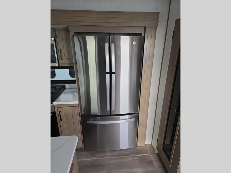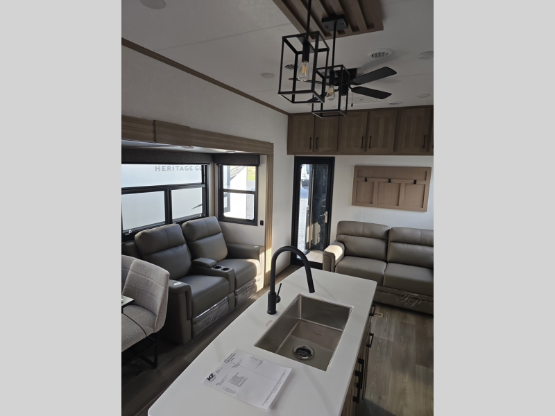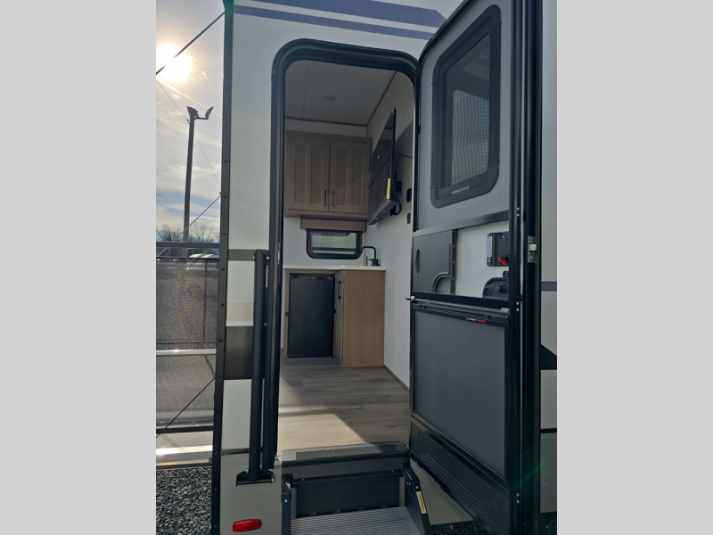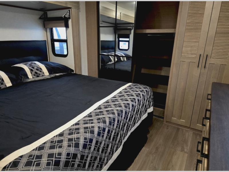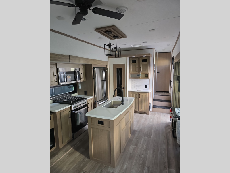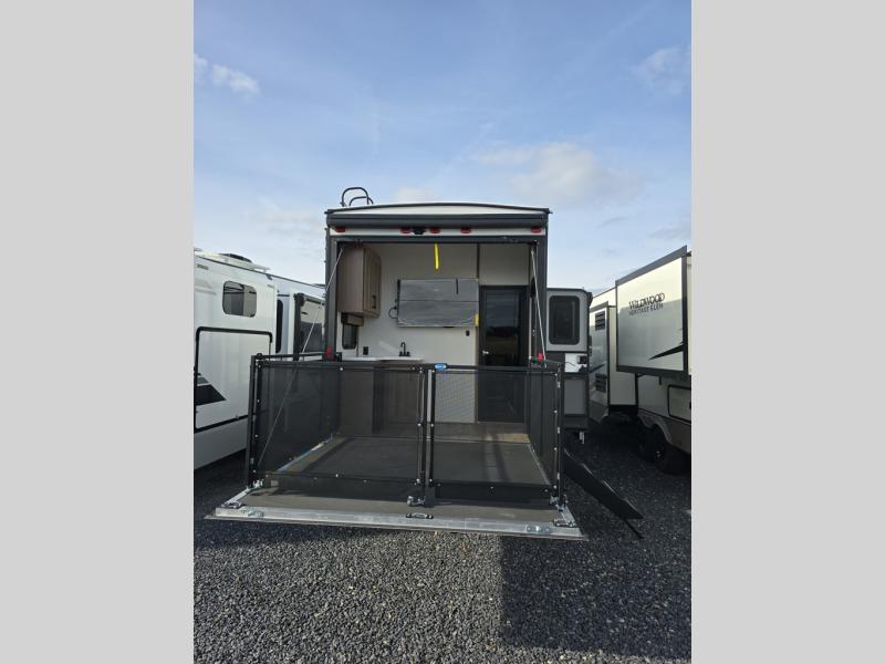 Experience the pinnacle of luxury fifth-wheel living! The front private bedroom has a king bed slide which can be switched for an optional queen instead, a dresser, and a front wardrobe with washer and dryer prep. Start feeling clean and fresh each morning after showering in the 48" x 30" residential shower with a seat in the full bathroom. The kitchen has an island that will make cooking time easy and allow you to mingle with the chef whipping up some scrambled eggs on the four-burner range. The hutch can store your dishes, the pantry can store your canned goods, and the 18 cu. ft. refrigerator will keep your perishables fresh. To experience a quiet time and relaxing time read a book on the rear hide-a-bed sofa or relax in the theater seating with USB charging. And the entertainment center with a fireplace and 50" smart LED TV will keep you entertained! Finally, this unit offers a flexible storage space ideal for keeping all organized and neat, and a patio deck, perfect for spending time outside connecting with nature.