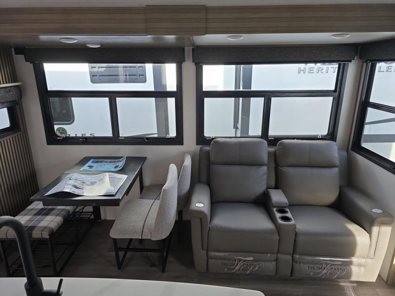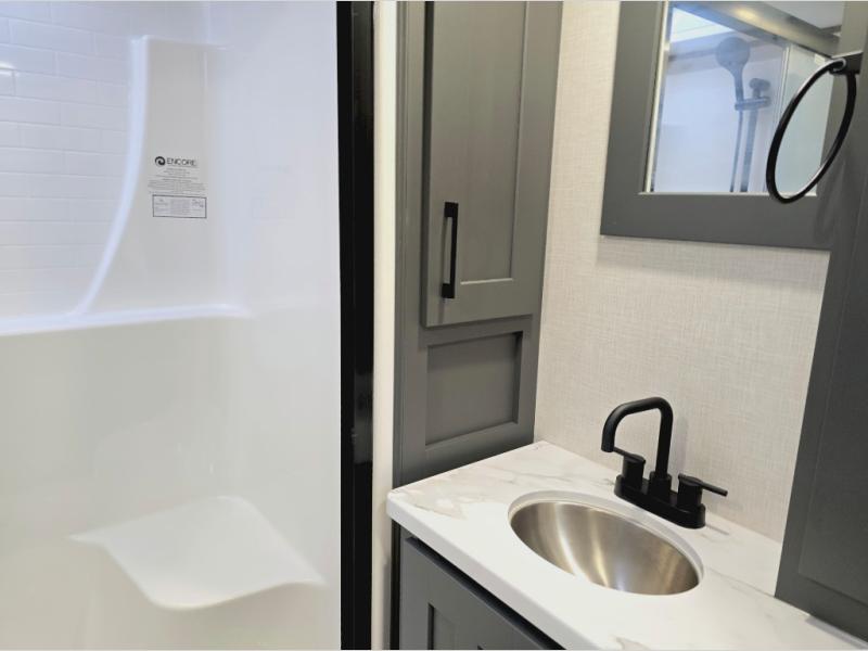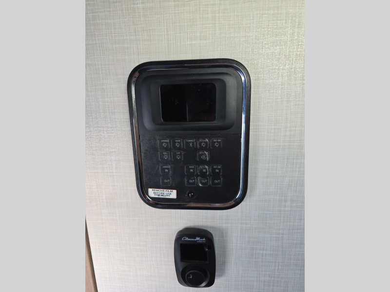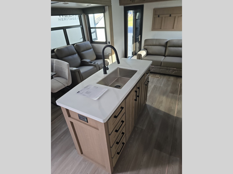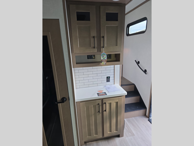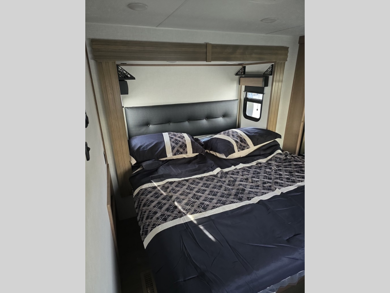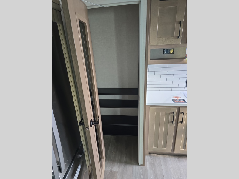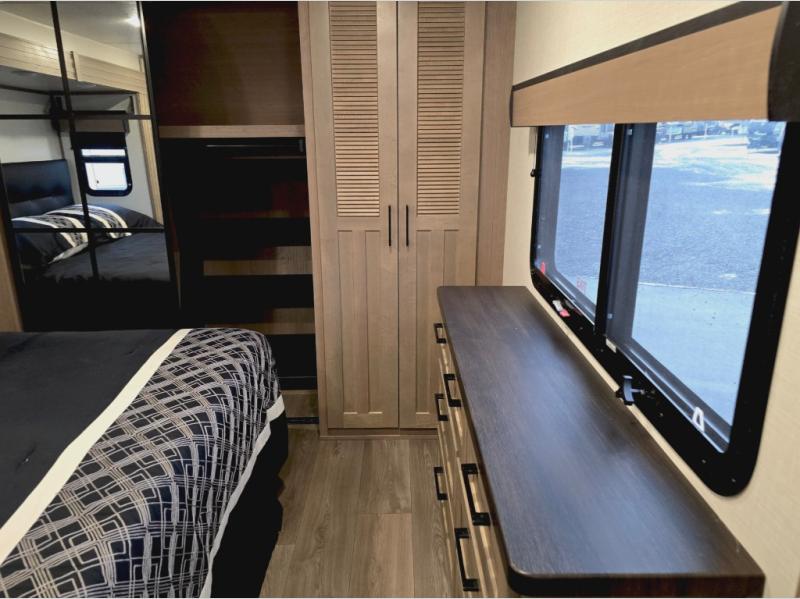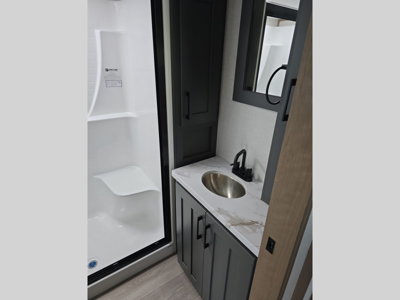 Experience the pinnacle of luxury fifth-wheel living! The front private bedroom has a king bed slide which can be switched for an optional queen instead, a dresser, and a front wardrobe with washer and dryer prep. Start feeling clean and fresh each morning after showering in the 48" x 30" residential shower with a seat in the full bathroom. The kitchen has an island that will make cooking time easy and allow you to mingle with the chef whipping up some scrambled eggs on the four-burner range. The hutch can store your dishes, the pantry can store your canned goods, and the 18 cu. ft. refrigerator will keep your perishables fresh. To experience a quiet time and relaxing time read a book on the rear hide-a-bed sofa or relax in the theater seating with USB charging. And the entertainment center with a fireplace and 50" smart LED TV will keep you entertained! Finally, this unit offers a flexible storage space ideal for keeping all organized and neat, and a patio deck, perfect for spending time outside connecting with nature.