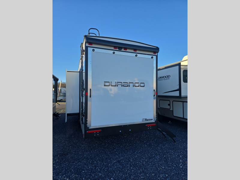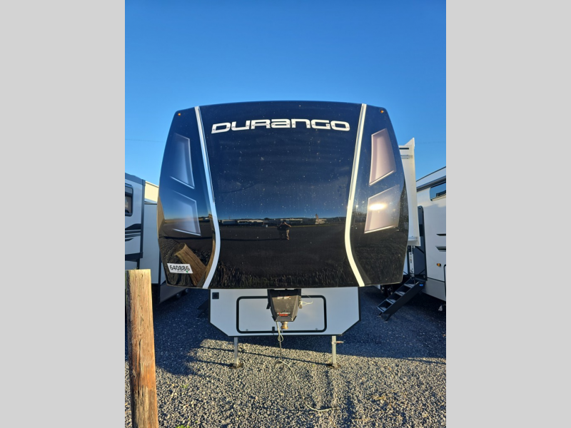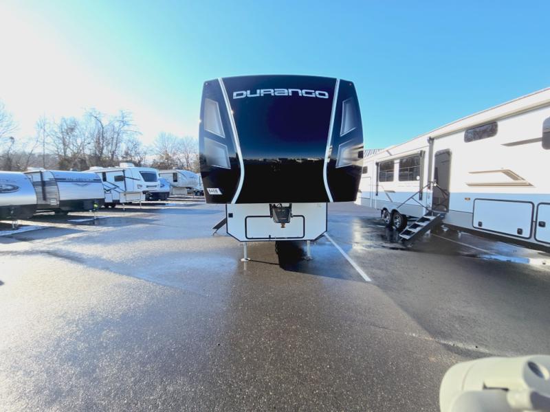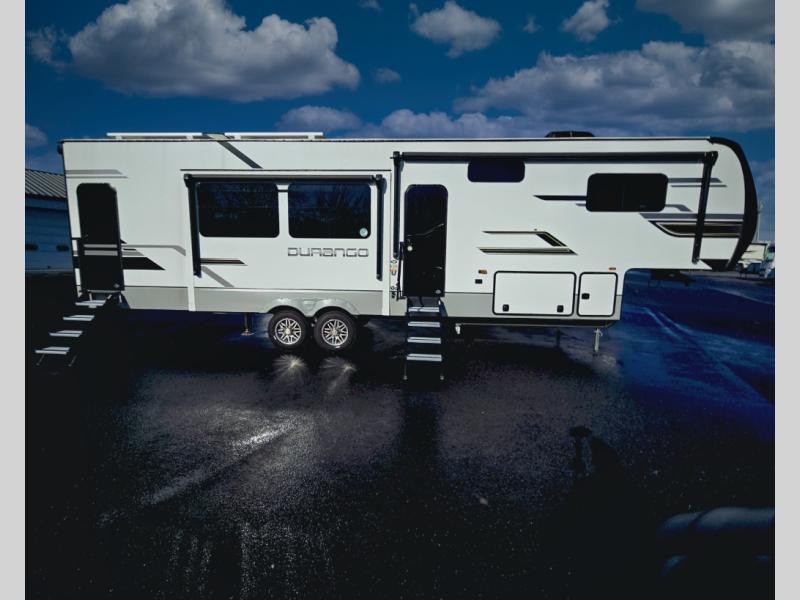 Enjoy full time living, an affordable price, and a wide body construction for more living space with every one of these KZ Durango light high-profile fifth wheels! These luxury units can be used all year round with the all-weather insulation package, the 3" x 14" foam-core in-floor straight-line heating system with a 35,000 BTU furnace, and the 15,000 BTU ducted roof A/C which optimizes the airflow by an average of 40% for better performance, cooling time, and reduction of noise. A few other construction features you will appreciate include a one piece, seamless walk-on Tufflex roofing material, Pex® in-floor heated waterlines, a Lamilux® gelcoat fiberglass exterior, and Dexter® axles with self adjusting brakes and height adjusting hangers. Inside, blancher cherry cabinetry, a king size bed, and smart TVs will have you feeling like you never left home!