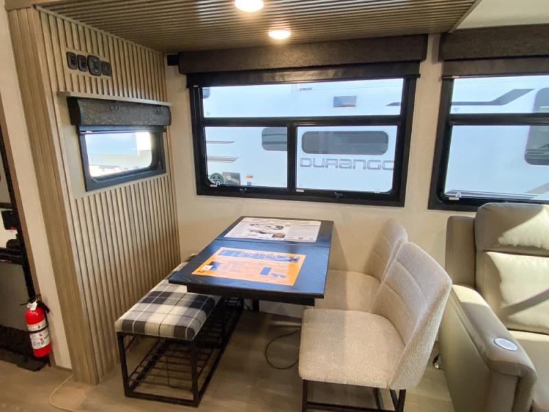 Enjoy full time living, an affordable price, and a wide body construction for more living space with every one of these KZ Durango light high-profile fifth wheels! These luxury units can be used all year round with the all-weather insulation package, the 3" x 14" foam-core in-floor straight-line heating system with a 35,000 BTU furnace, and the 15,000 BTU ducted roof A/C which optimizes the airflow by an average of 40% for better performance, cooling time, and reduction of noise. A few other construction features you will appreciate include a one piece, seamless walk-on Tufflex roofing material, Pex® in-floor heated waterlines, a Lamilux® gelcoat fiberglass exterior, and Dexter® axles with self adjusting brakes and height adjusting hangers. Inside, blancher cherry cabinetry, a king size bed, and smart TVs will have you feeling like you never left home!