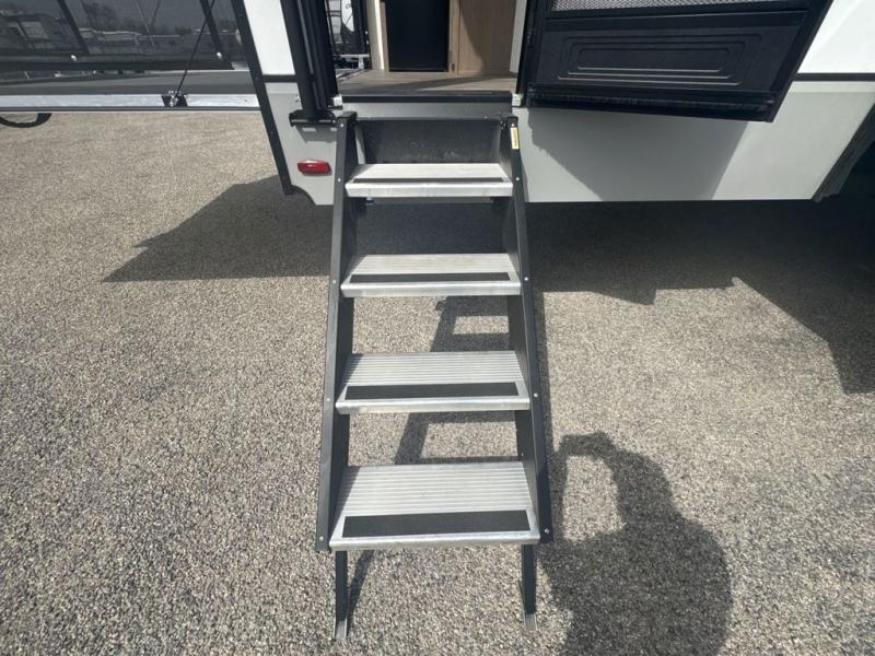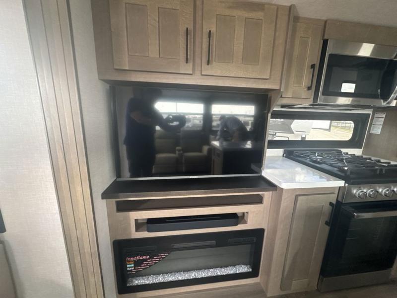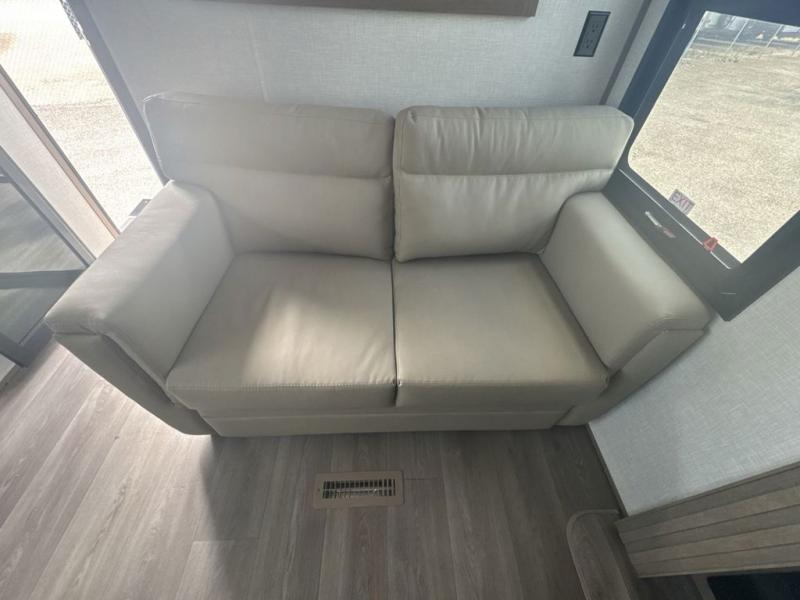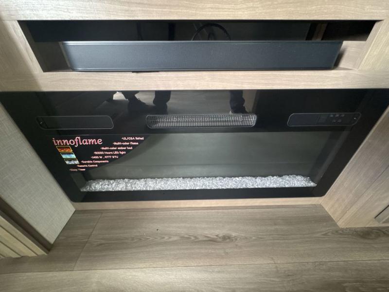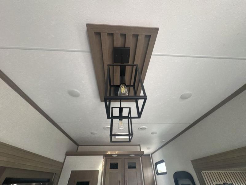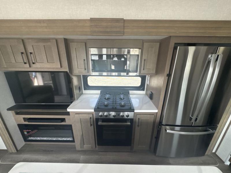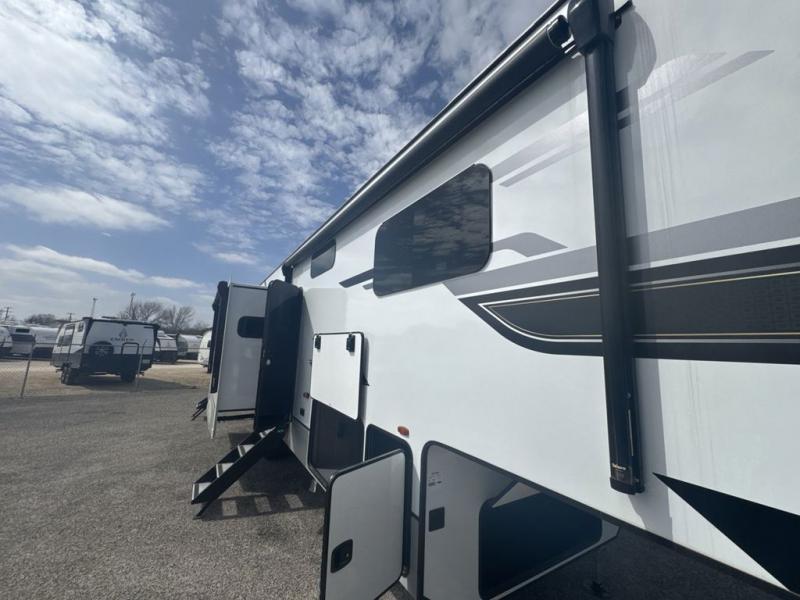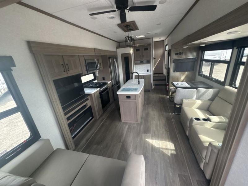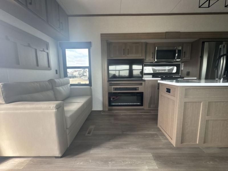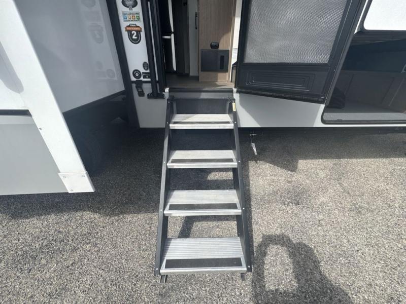 Experience the pinnacle of luxury fifth-wheel living! The front private bedroom has a king bed slide which can be switched for an optional queen instead, a dresser, and a front wardrobe with washer and dryer prep. Start feeling clean and fresh each morning after showering in the 48" x 30" residential shower with a seat in the full bathroom. The kitchen has an island that will make cooking time easy and allow you to mingle with the chef whipping up some scrambled eggs on the four-burner range. The hutch can store your dishes, the pantry can store your canned goods, and the 18 cu. ft. refrigerator will keep your perishables fresh. To experience a quiet time and relaxing time read a book on the rear hide-a-bed sofa or relax in the theater seating with USB charging. And the entertainment center with a fireplace and 50" smart LED TV will keep you entertained! Finally, this unit offers a flexible storage space ideal for keeping all organized and neat, and a patio deck, perfect for spending time outside connecting with nature.