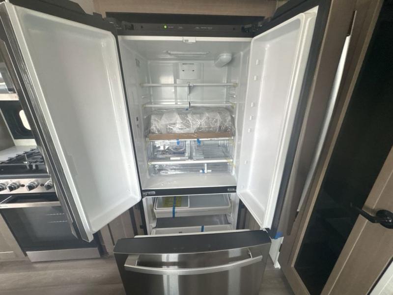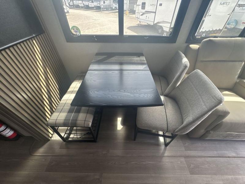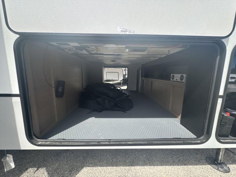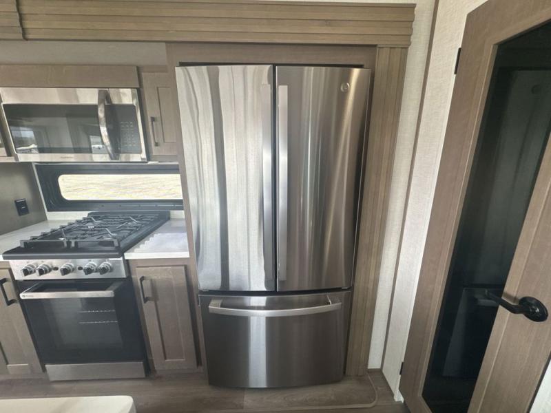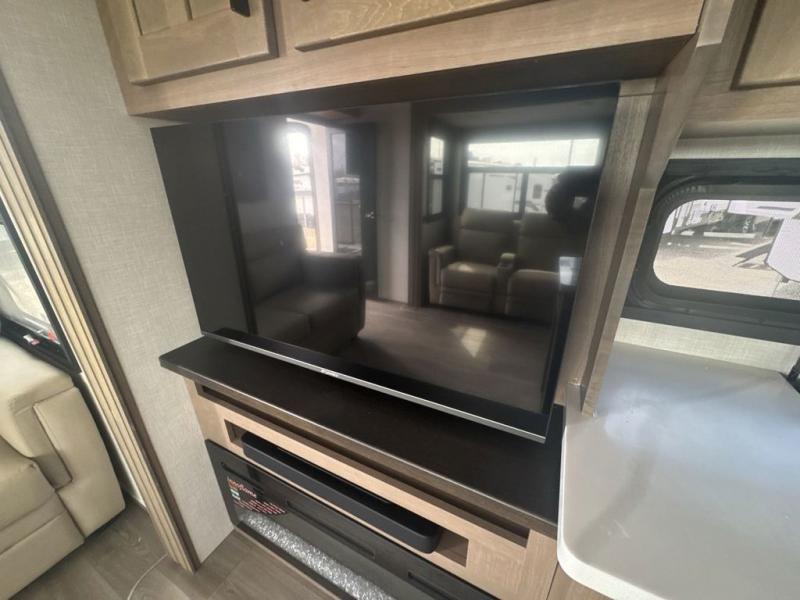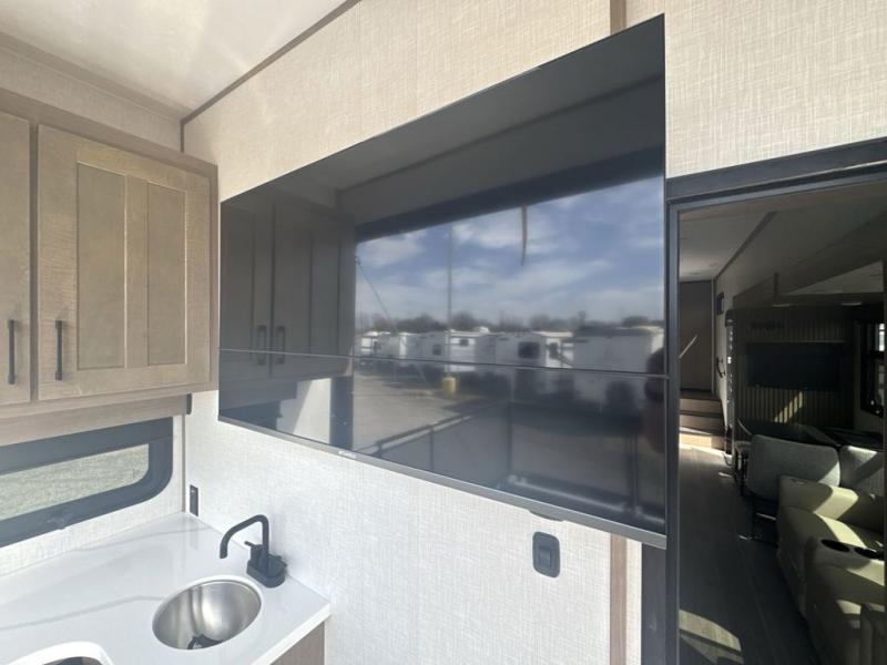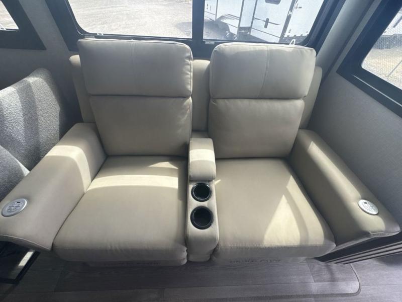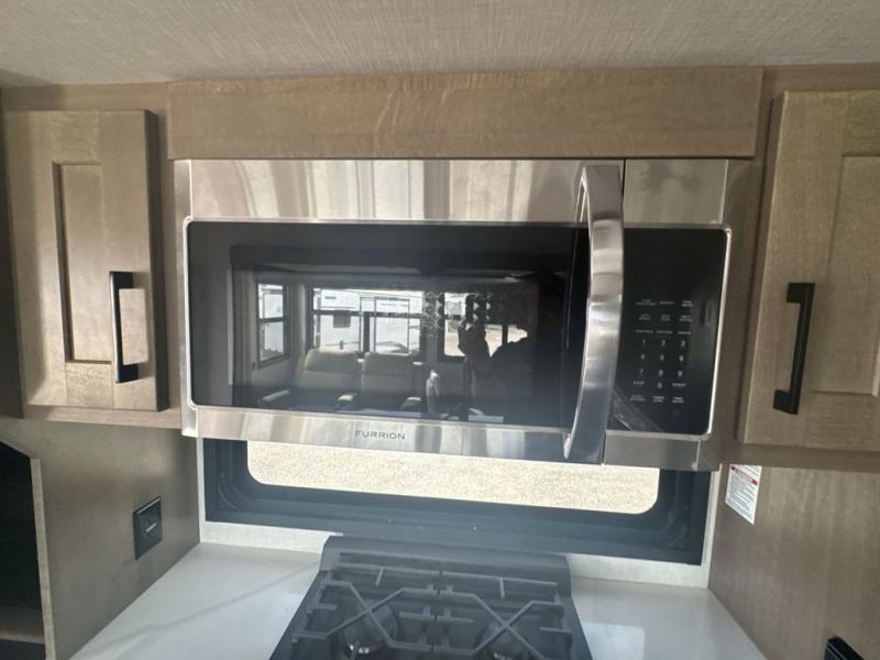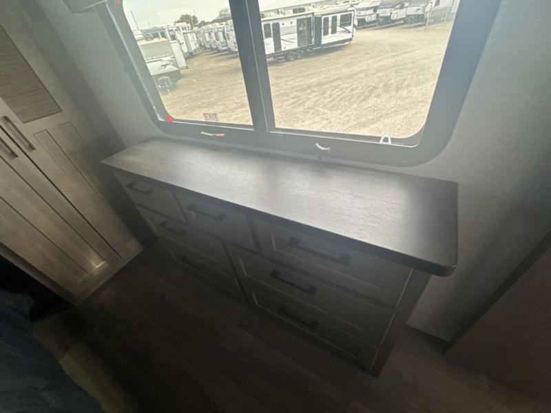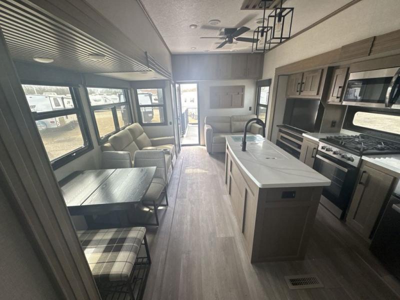 Experience the pinnacle of luxury fifth-wheel living! The front private bedroom has a king bed slide which can be switched for an optional queen instead, a dresser, and a front wardrobe with washer and dryer prep. Start feeling clean and fresh each morning after showering in the 48" x 30" residential shower with a seat in the full bathroom. The kitchen has an island that will make cooking time easy and allow you to mingle with the chef whipping up some scrambled eggs on the four-burner range. The hutch can store your dishes, the pantry can store your canned goods, and the 18 cu. ft. refrigerator will keep your perishables fresh. To experience a quiet time and relaxing time read a book on the rear hide-a-bed sofa or relax in the theater seating with USB charging. And the entertainment center with a fireplace and 50" smart LED TV will keep you entertained! Finally, this unit offers a flexible storage space ideal for keeping all organized and neat, and a patio deck, perfect for spending time outside connecting with nature.