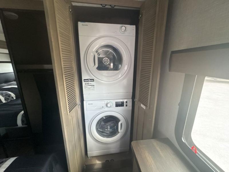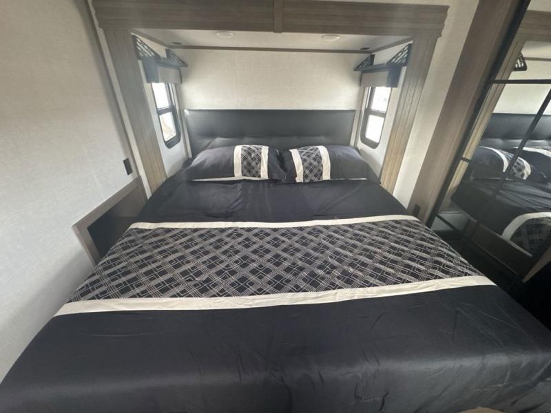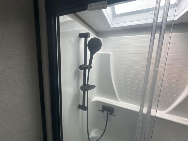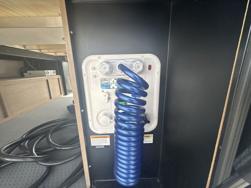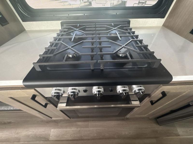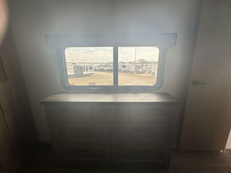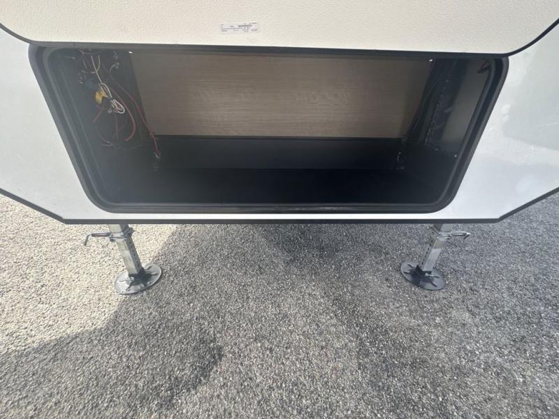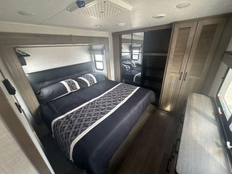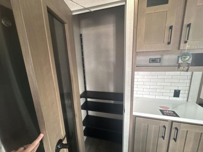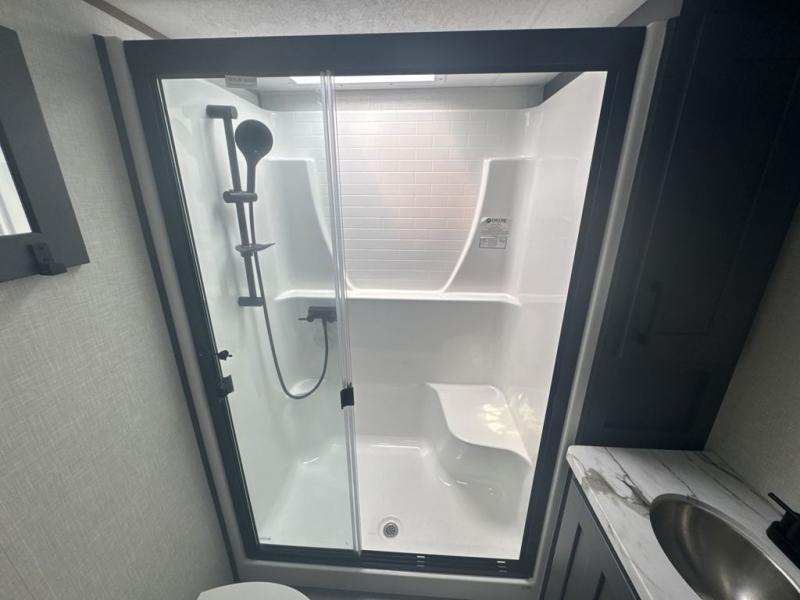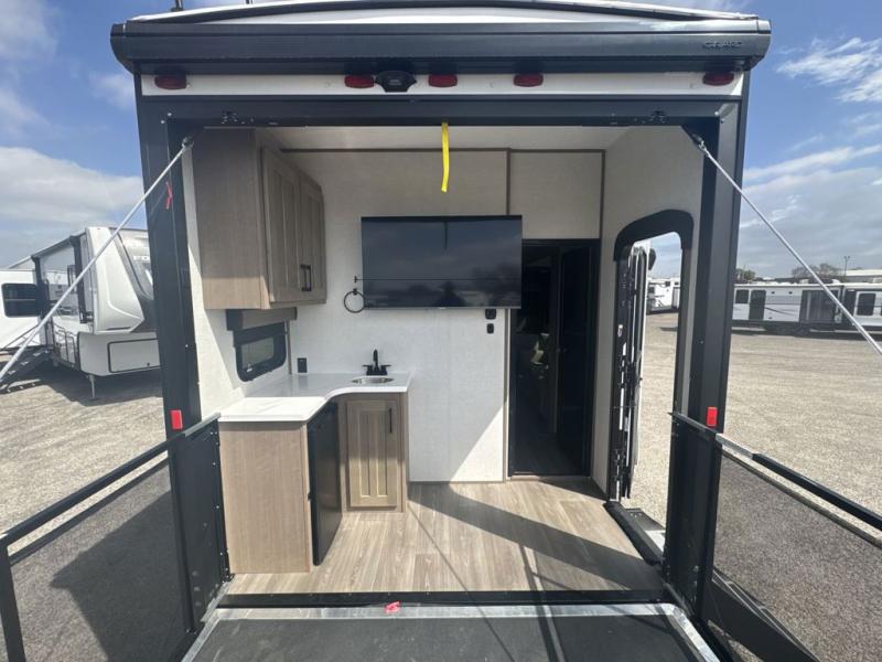 Experience the pinnacle of luxury fifth-wheel living! The front private bedroom has a king bed slide which can be switched for an optional queen instead, a dresser, and a front wardrobe with washer and dryer prep. Start feeling clean and fresh each morning after showering in the 48" x 30" residential shower with a seat in the full bathroom. The kitchen has an island that will make cooking time easy and allow you to mingle with the chef whipping up some scrambled eggs on the four-burner range. The hutch can store your dishes, the pantry can store your canned goods, and the 18 cu. ft. refrigerator will keep your perishables fresh. To experience a quiet time and relaxing time read a book on the rear hide-a-bed sofa or relax in the theater seating with USB charging. And the entertainment center with a fireplace and 50" smart LED TV will keep you entertained! Finally, this unit offers a flexible storage space ideal for keeping all organized and neat, and a patio deck, perfect for spending time outside connecting with nature.
