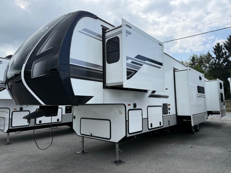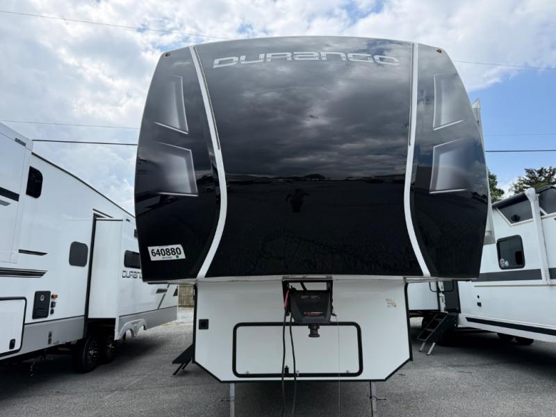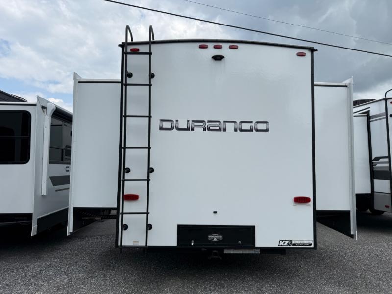 Enjoy full time living, an affordable price, and a wide body construction for more living space with every one of these KZ Durango light high-profile fifth wheels! These luxury units can be used all year round with the all-weather insulation package, the 3" x 14" foam-core in-floor straight-line heating system with a 35,000 BTU furnace, and the 15,000 BTU ducted roof A/C which optimizes the airflow by an average of 40% for better performance, cooling time, and reduction of noise. A few other construction features you will appreciate include a one piece, seamless walk-on Tufflex roofing material, Pex® in-floor heated waterlines, a Lamilux® gelcoat fiberglass exterior, and Dexter® axles with self adjusting brakes and height adjusting hangers. You can even venture off the beaten path with the now standard Off-The-Grid Solar Package that comes with two 220W solar panels. Inside, modern farmhouse cabinetry, a king size bed, and smart TVs will have you feeling like you never left home!