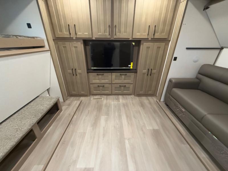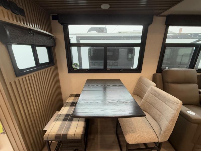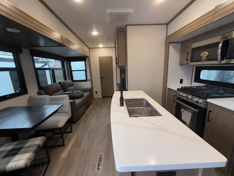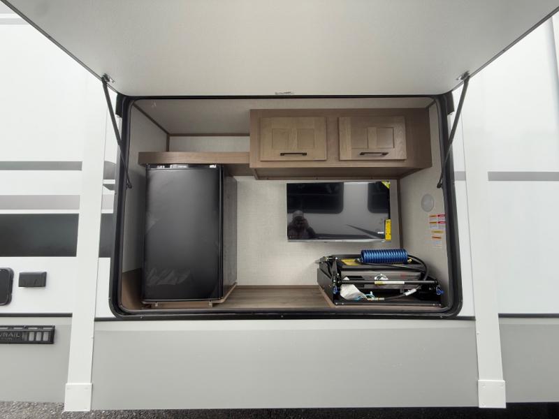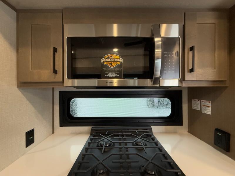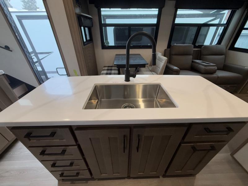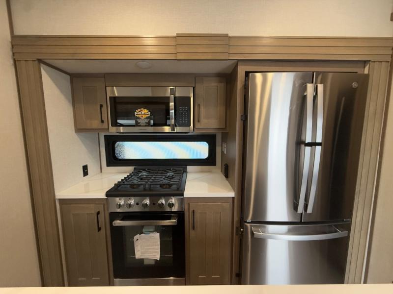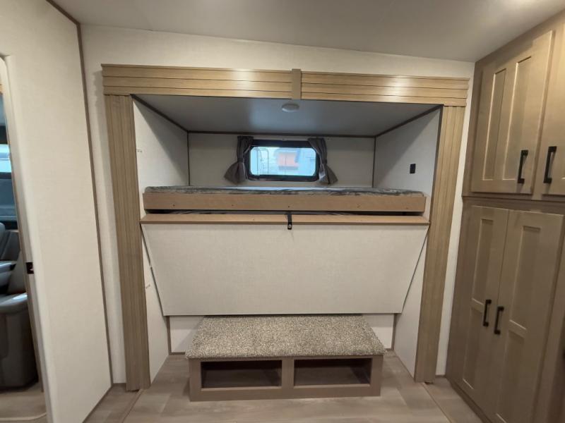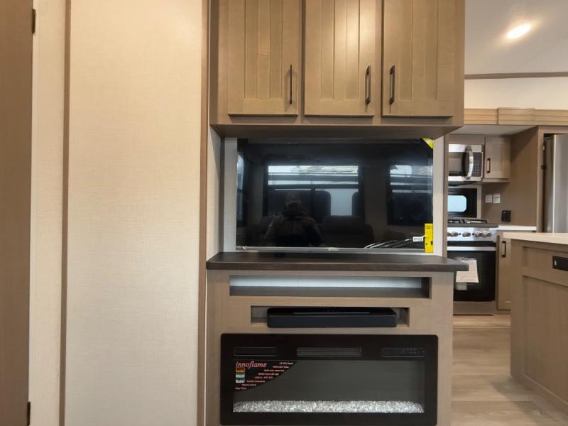 All of your friends and family can camp together in this fifth wheel! It features a rear private bunkhouse with a bunk above a hide-a-bed sofa, a full bathroom with a 30" x 36" shower, and an entertainment center with wardrobes on either side. There is also a folding bunk and a bunk over the outside kitchen. Across from the hide-a-bed sofa is an entertainment center with a 40" fireplace and a 43" smart TV to watch your favorite movies at night. The kitchen island comes with two bar stools and you can prepare your best meals with the four burner range with a 24" oven. The second bathroom has a 48" x 30" residential shower with a seat and a linen closet to keep your towel close. Enjoy a good night's rest on the king bed slide in the front private bedroom which also has a dresser with a built-in hamper and a front wardrobe with washer and dryer prep!