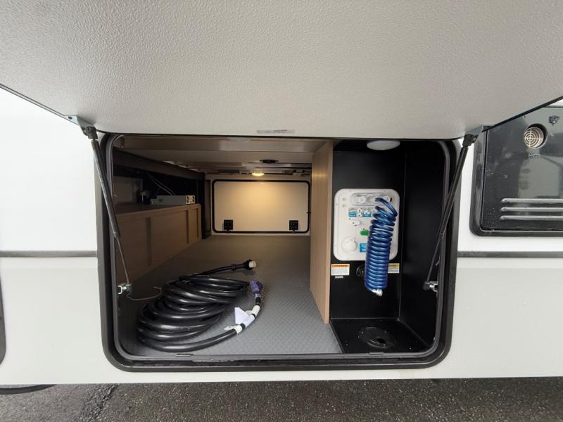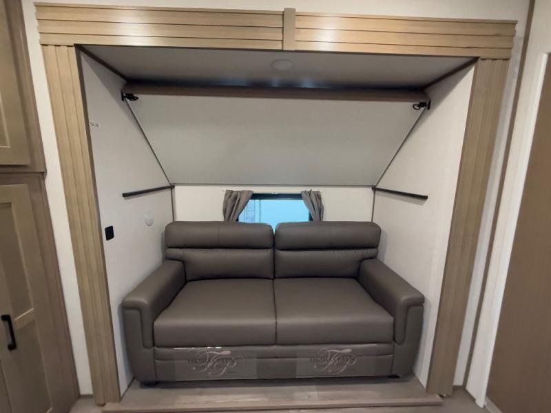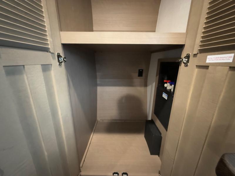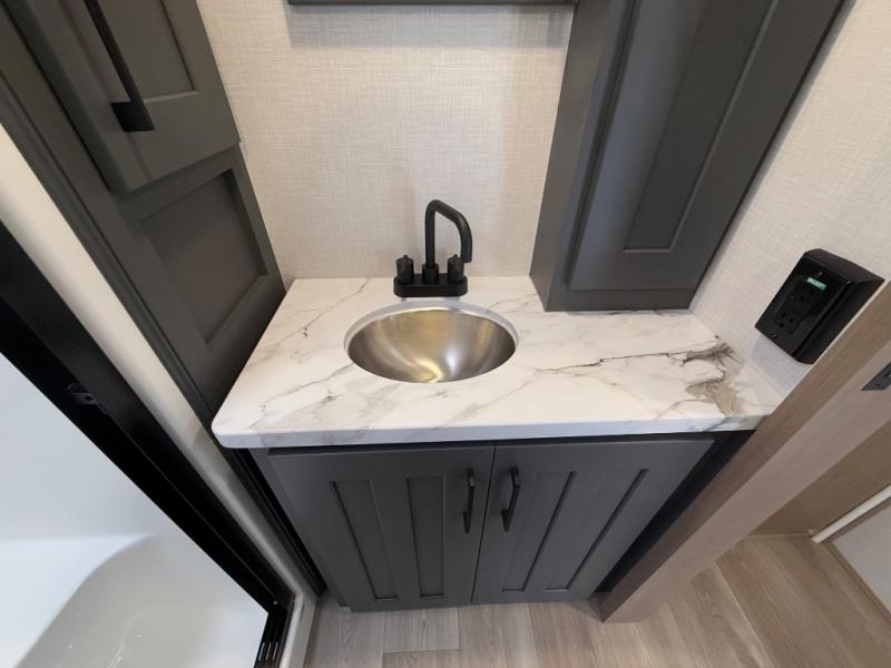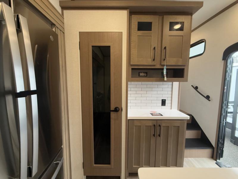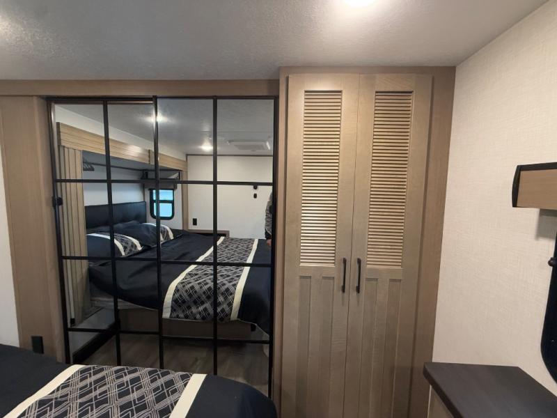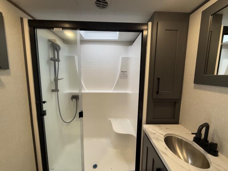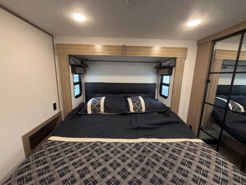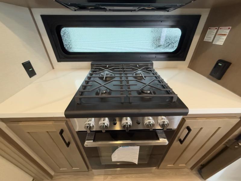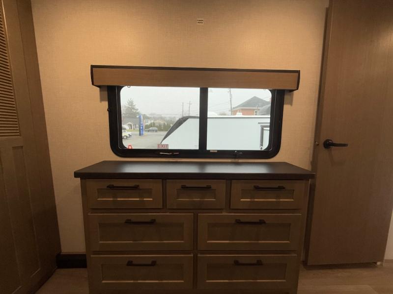 All of your friends and family can camp together in this fifth wheel! It features a rear private bunkhouse with a bunk above a hide-a-bed sofa, a full bathroom with a 30" x 36" shower, and an entertainment center with wardrobes on either side. There is also a folding bunk and a bunk over the outside kitchen. Across from the hide-a-bed sofa is an entertainment center with a 40" fireplace and a 43" smart TV to watch your favorite movies at night. The kitchen island comes with two bar stools and you can prepare your best meals with the four burner range with a 24" oven. The second bathroom has a 48" x 30" residential shower with a seat and a linen closet to keep your towel close. Enjoy a good night's rest on the king bed slide in the front private bedroom which also has a dresser with a built-in hamper and a front wardrobe with washer and dryer prep!