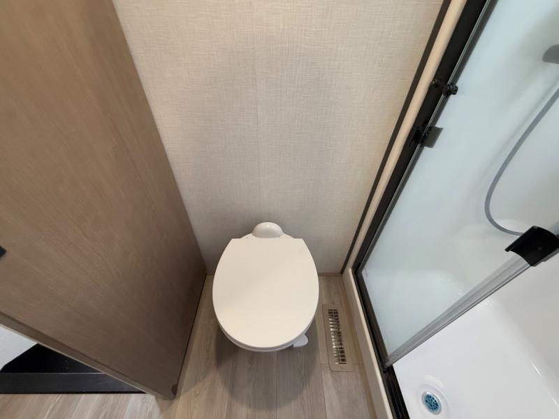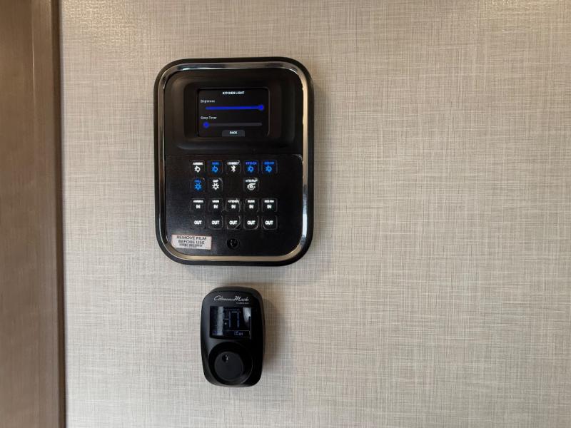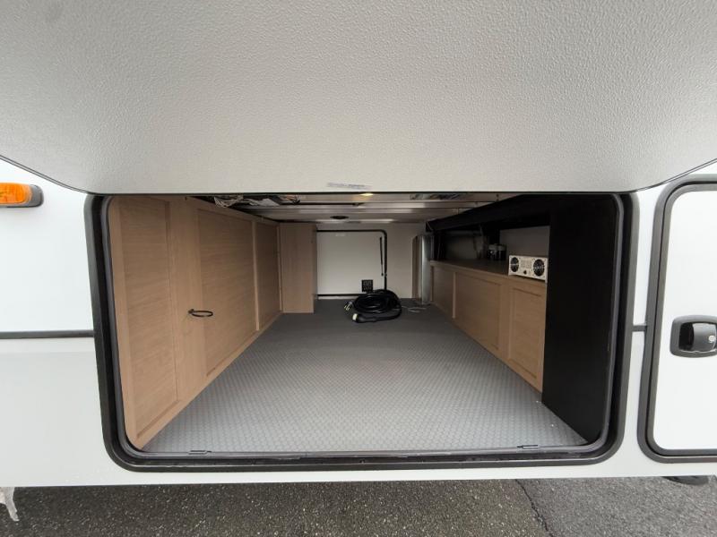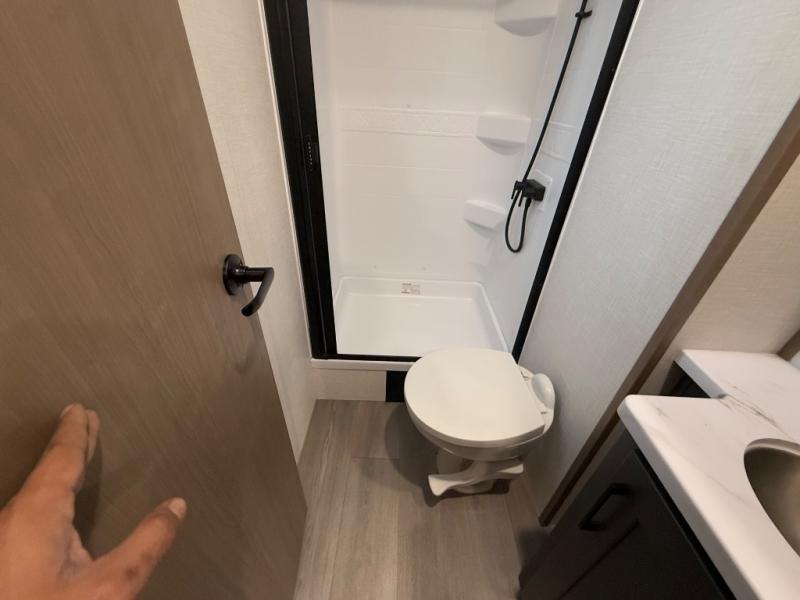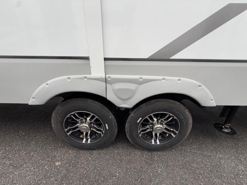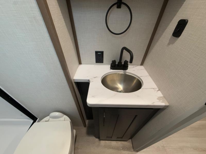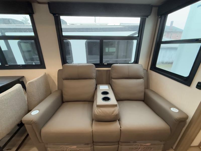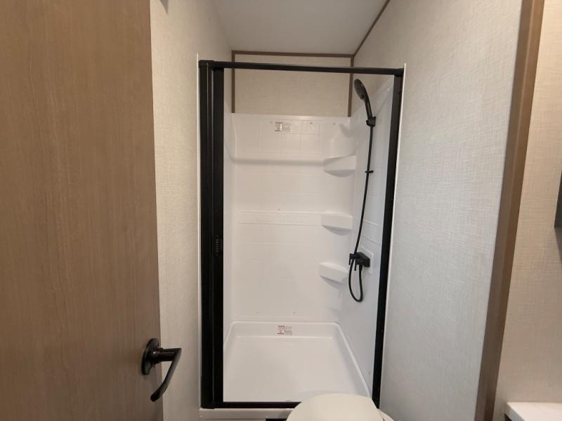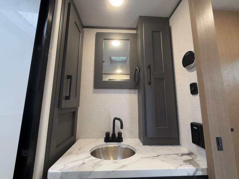 All of your friends and family can camp together in this fifth wheel! It features a rear private bunkhouse with a bunk above a hide-a-bed sofa, a full bathroom with a 30" x 36" shower, and an entertainment center with wardrobes on either side. There is also a folding bunk and a bunk over the outside kitchen. Across from the hide-a-bed sofa is an entertainment center with a 40" fireplace and a 43" smart TV to watch your favorite movies at night. The kitchen island comes with two bar stools and you can prepare your best meals with the four burner range with a 24" oven. The second bathroom has a 48" x 30" residential shower with a seat and a linen closet to keep your towel close. Enjoy a good night's rest on the king bed slide in the front private bedroom which also has a dresser with a built-in hamper and a front wardrobe with washer and dryer prep!
