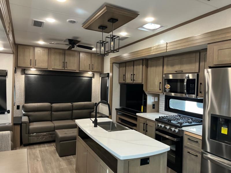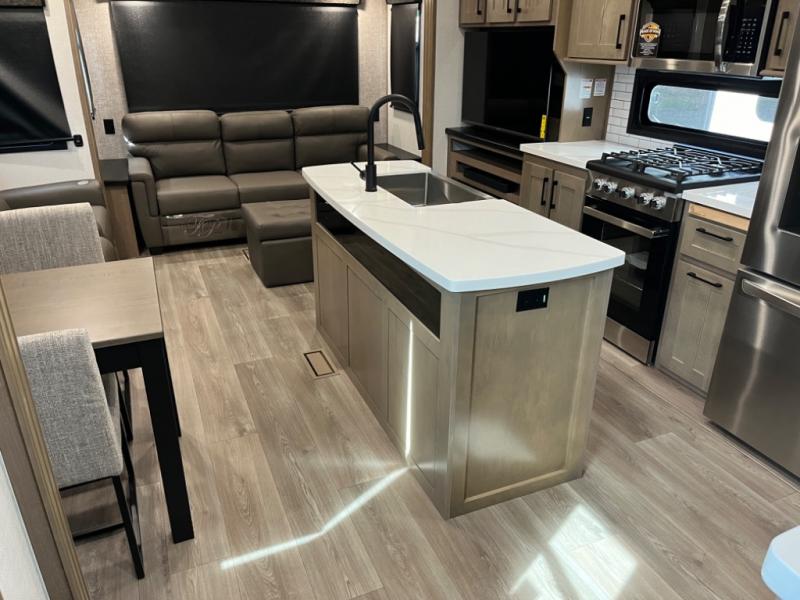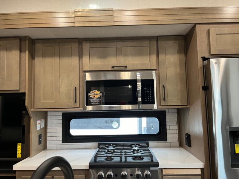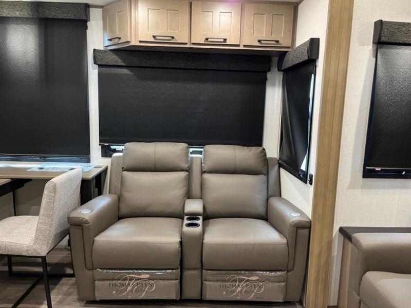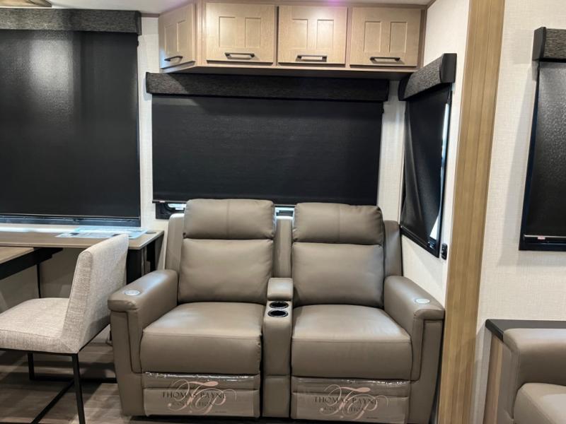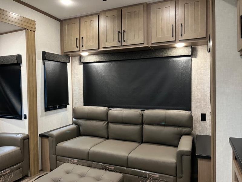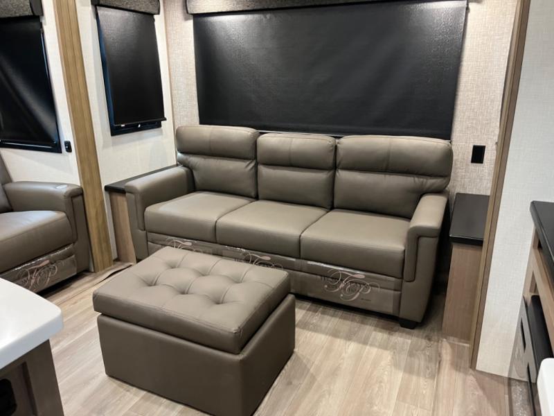 With any KZ Durango Gold full-time luxury fifth wheel, you will enjoy the new Blancher Cherry cabinetry, stainless steel appliances such as a 30" convection microwave and 24" oven with a four burner range, plus a stainless dishwasher. Other top features include an electric tilt bed with Serta Comfort foam king mattress, two 15K A/C units, plus theater seating with powered recline, heat and massage features. You will also appreciate a handy central vacuum system with attachments that stores out of sight. Each Durango Gold is constructed with six-sided aluminum framing, and has a heated, insulated and an enclosed underbelly. It is also constructed with Tufflex roofing material which is flexible, puncture resistant, and reflective. The now standard "Off The Grid" solar package includes two 200W solar panels, a 30A MPPT solar charge controller, and a 2,000W True Sine Wave inverter for off-grid capabilities. If you're wanting to go completely off-grid, you might want to choose the optional Boondocker Solar System with even more features that won't require you to be close to electric hookups!