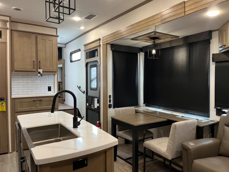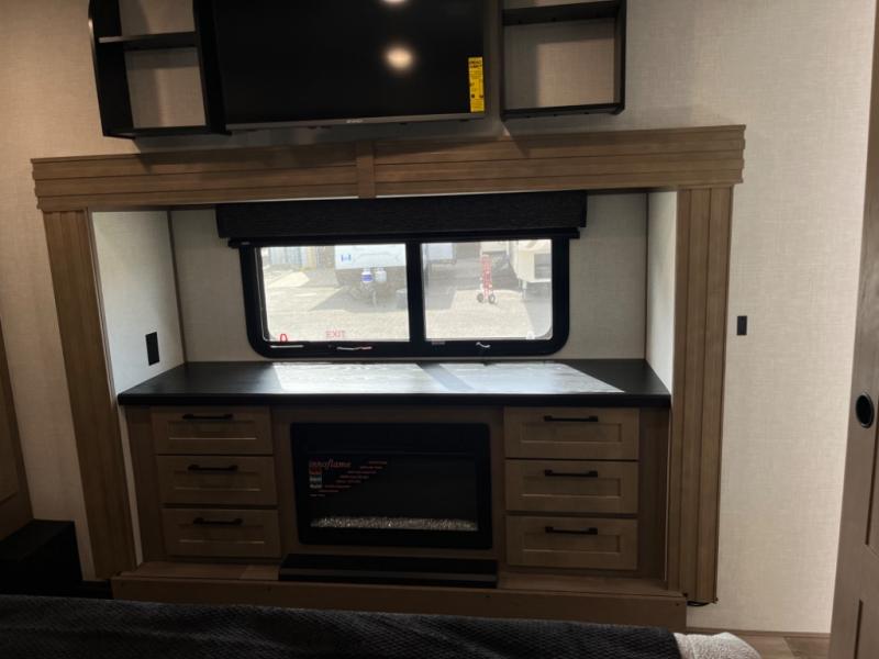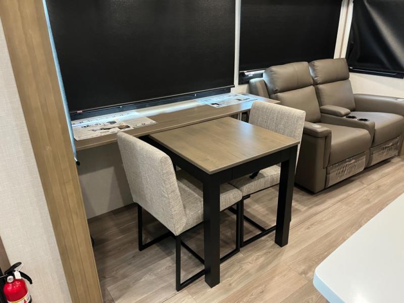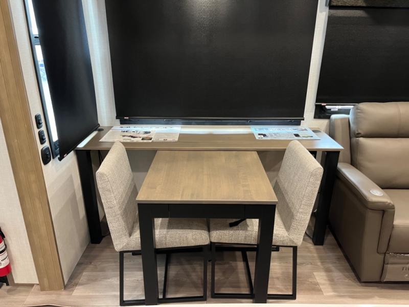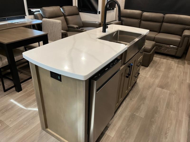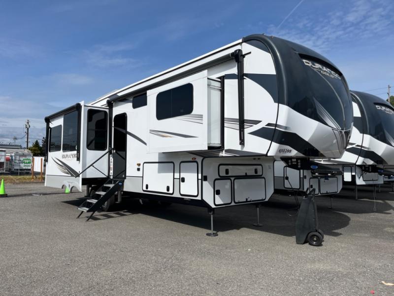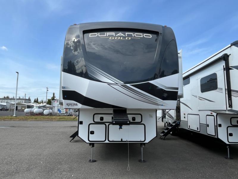 Camp wherever you want and stay as long as you desire with this full-time fifth wheel! You will love the spacious interior which includes a front bedroom with an electric tilt king bed slide with drawers underneath, a front wardrobe with washer and dryer prep, a closet with a built-in hamper, plus a slide out dresser with 32" Smart LED TV above. The full bathroom offers a residential shower with a seat plus linen storage, and the kitchen gives the cook a dream kitchen that includes a farmhouse stainless steel sink and dishwasher in the center island, a 26 cu. ft. house refrigerator with a 2,000W inverter, and more. The 50" Smart LED TV with a fireplace below can be seen from the sliding table / desk and chairs, the comfortable theater seats and the hide-a-bed sofa. Yet you might like to add the 10' 6" awning option, and there are more options to customize your Durango Gold.