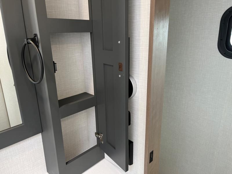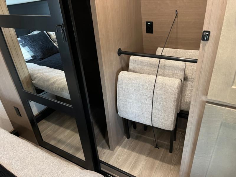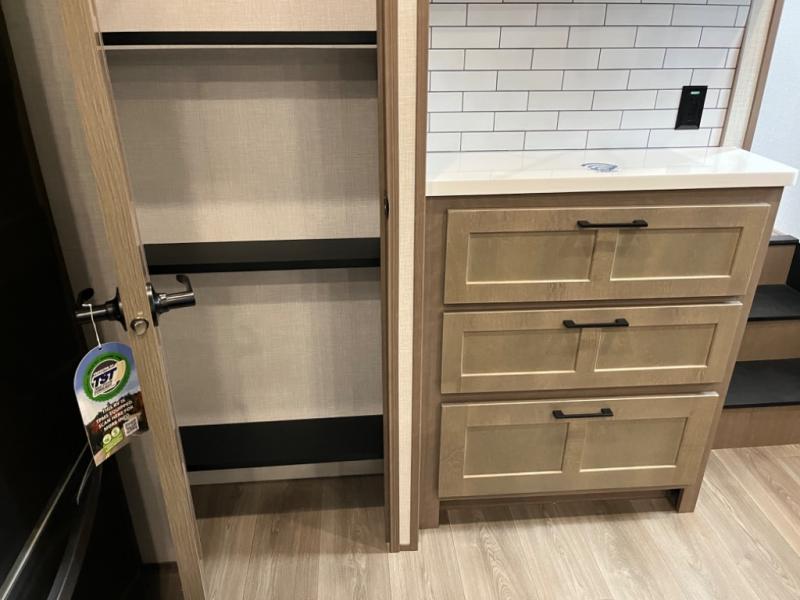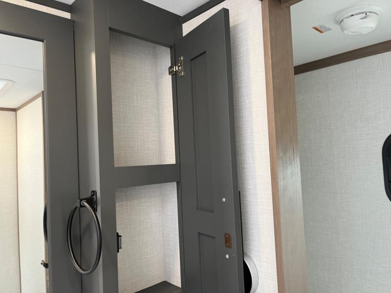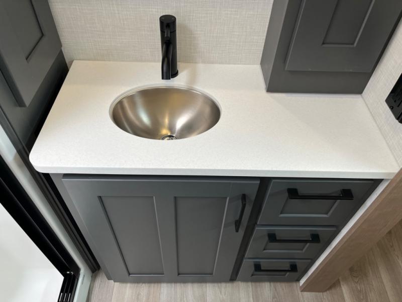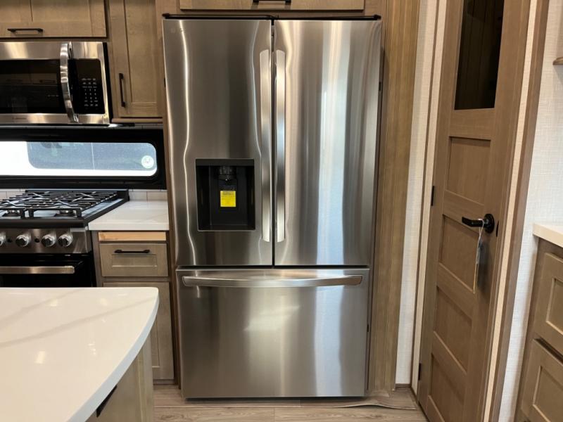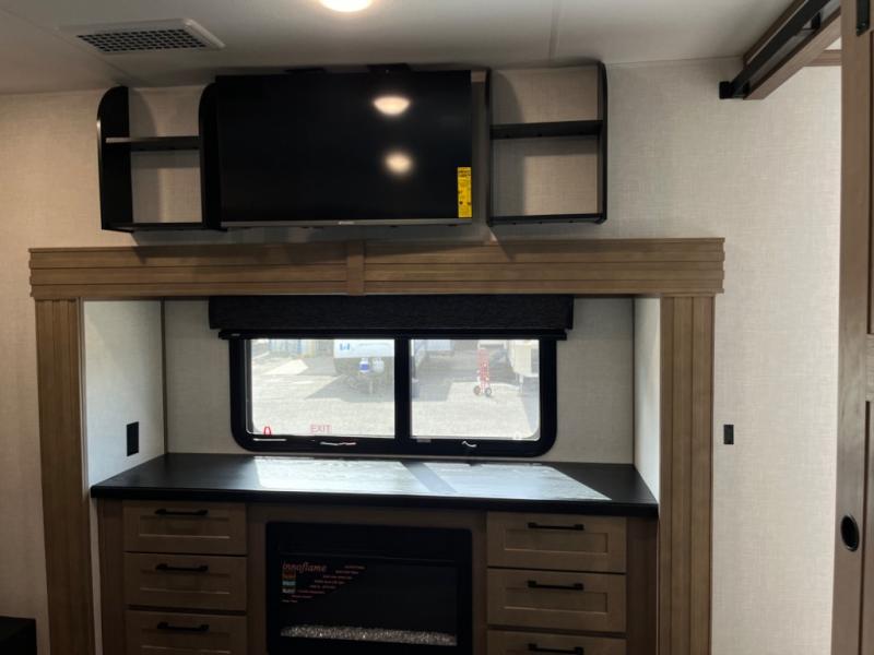 Camp wherever you want and stay as long as you desire with this full-time fifth wheel! You will love the spacious interior which includes a front bedroom with an electric tilt king bed slide with drawers underneath, a front wardrobe with washer and dryer prep, a closet with a built-in hamper, plus a slide out dresser with 32" Smart LED TV above. The full bathroom offers a residential shower with a seat plus linen storage, and the kitchen gives the cook a dream kitchen that includes a farmhouse stainless steel sink and dishwasher in the center island, a 26 cu. ft. house refrigerator with a 2,000W inverter, and more. The 50" Smart LED TV with a fireplace below can be seen from the sliding table / desk and chairs, the comfortable theater seats and the hide-a-bed sofa. Yet you might like to add the 10' 6" awning option, and there are more options to customize your Durango Gold.