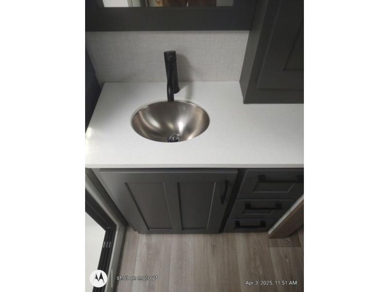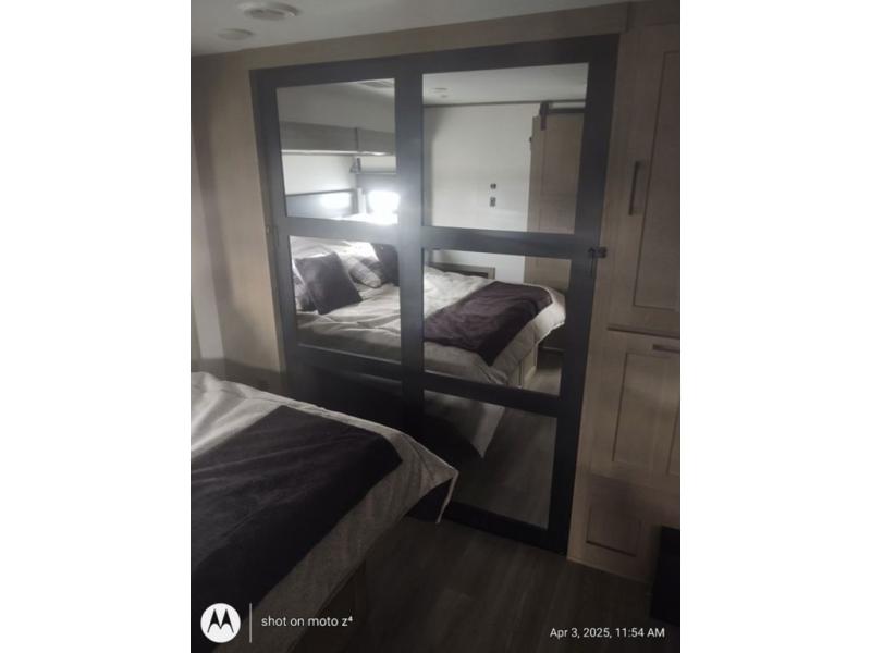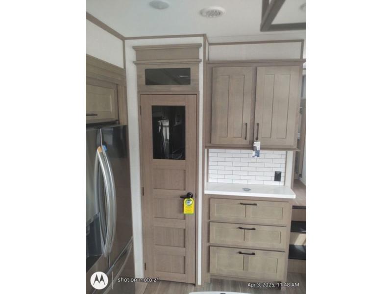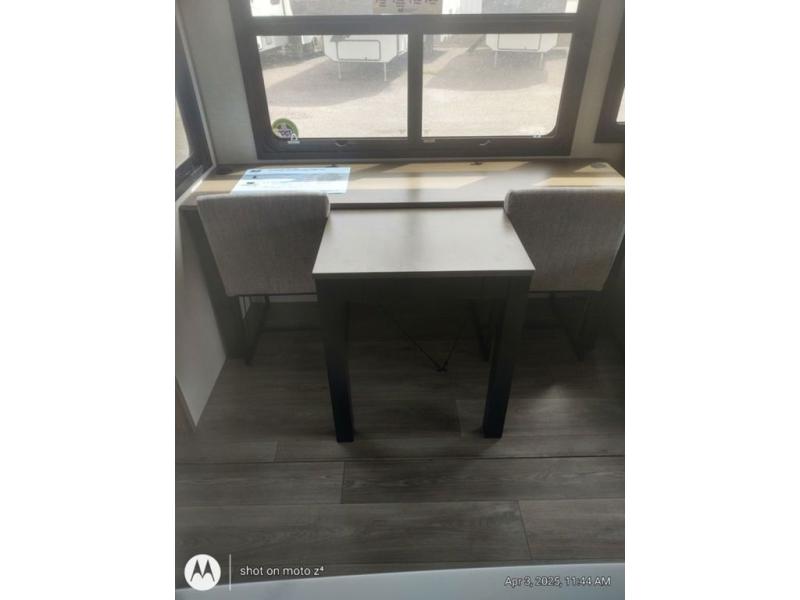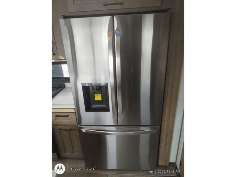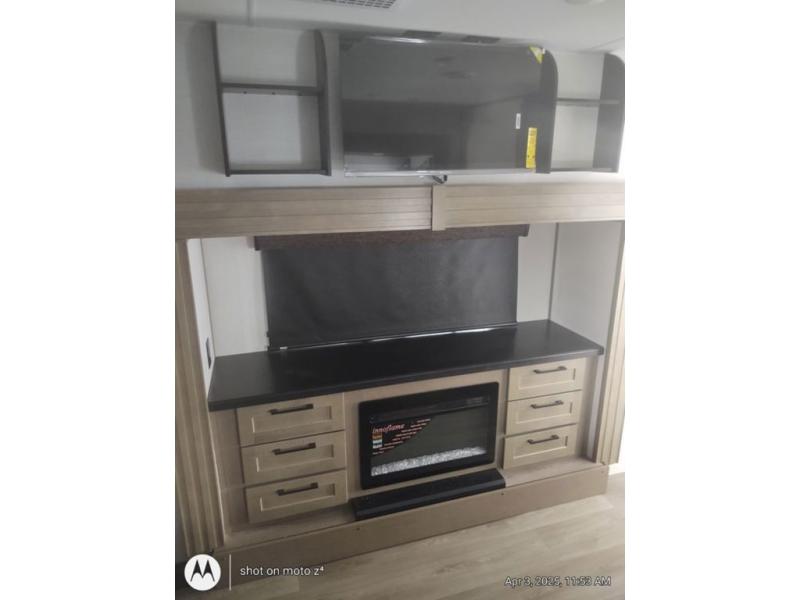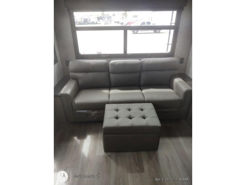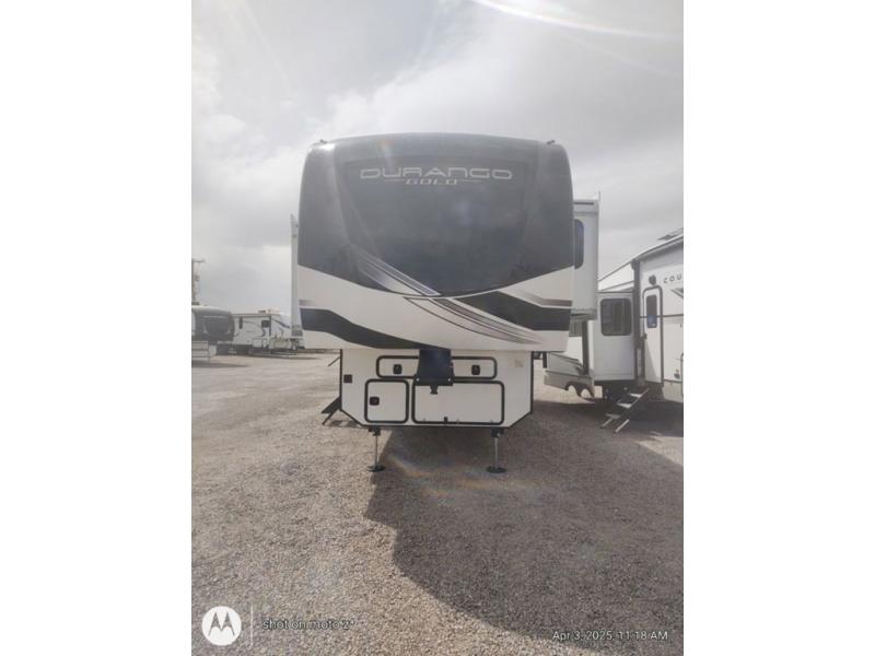 Camp wherever you want and stay as long as you desire with this full-time fifth wheel! You will love the spacious interior which includes a front bedroom with an electric tilt king bed slide with drawers underneath, a front wardrobe with washer and dryer prep, a closet with a built-in hamper, plus a slide out dresser with 32" Smart LED TV above. The full bathroom offers a residential shower with a seat plus linen storage, and the kitchen gives the cook a dream kitchen that includes a farmhouse stainless steel sink and dishwasher in the center island, a 26 cu. ft. house refrigerator with a 2,000W inverter, and more. The 50" Smart LED TV with a fireplace below can be seen from the sliding table / desk and chairs, the comfortable theater seats and the hide-a-bed sofa. Yet you might like to add the 10' 6" awning option, and there are more options to customize your Durango Gold.
